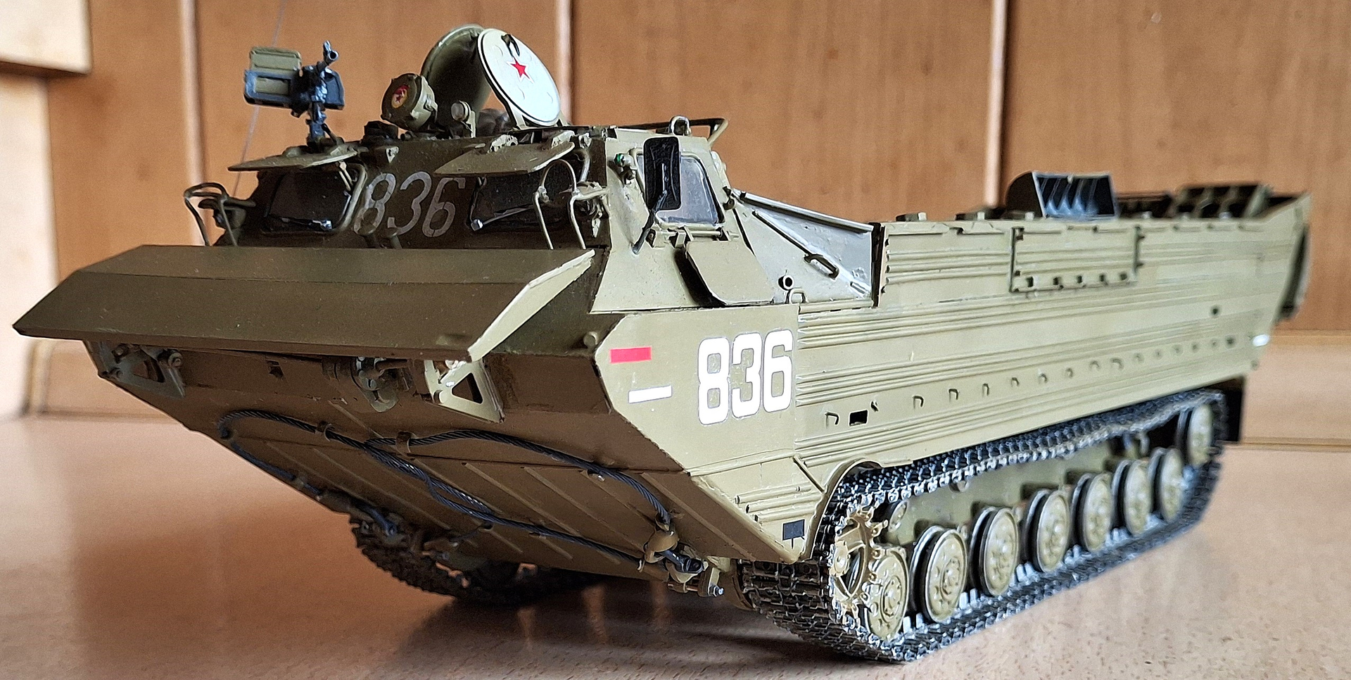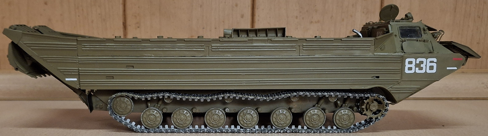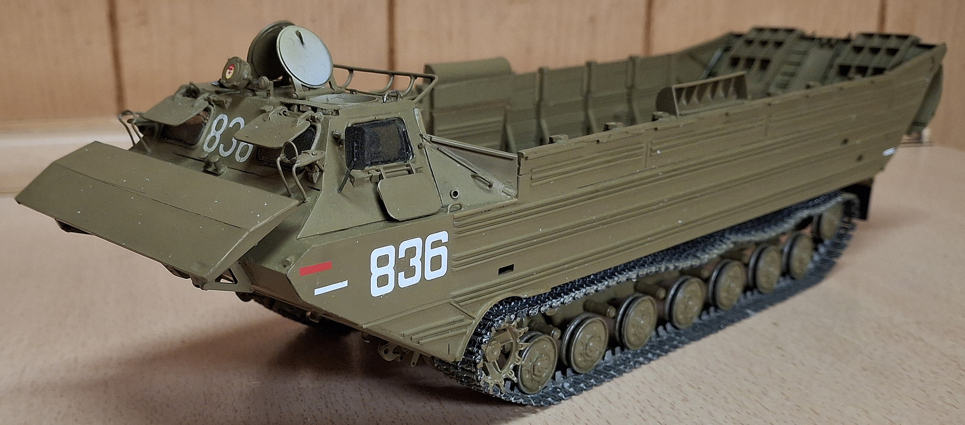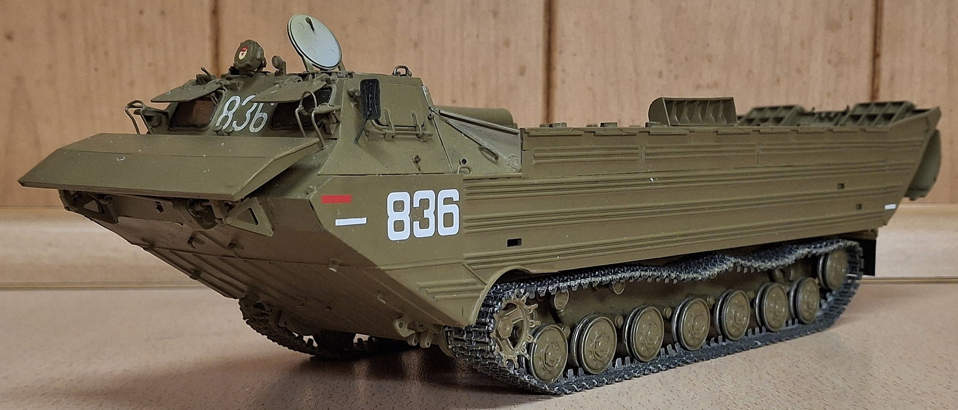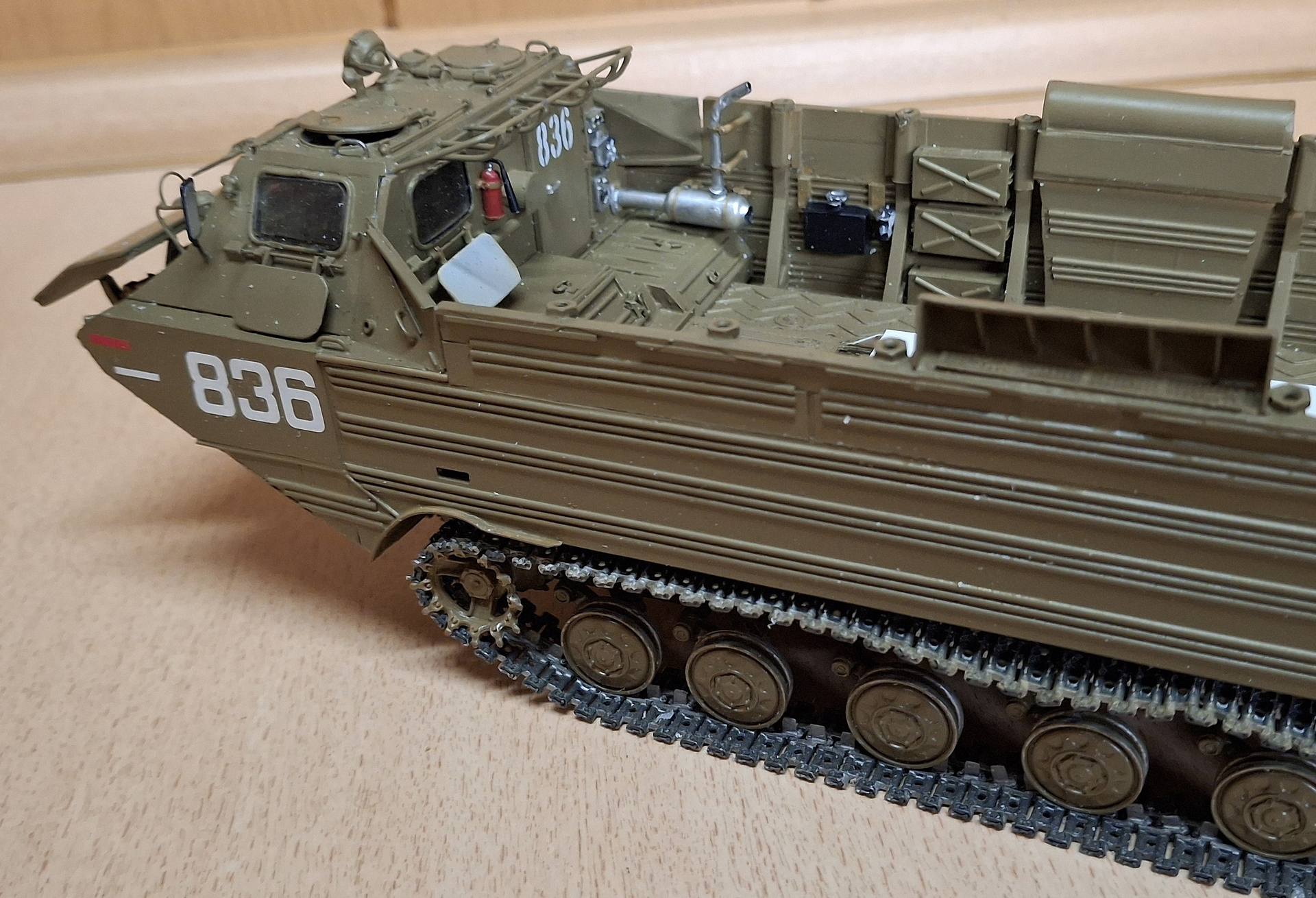 Following the construction of the KrAZ-255 TMM-3, today we continue with another model from the engineering corps of the Group of Soviet Forces in Germany (GSFG) in the former GDR. This is the amphibious tracked transport vehicle PTS-2, the successor to the PTS-M, which was introduced into the troops in the early 1980s. The vehicle is still in service today. I’ve been working on this model for several years, repeatedly abandoning it. A computer crash destroyed all the construction photos, so I’ll only show the most recent ones. The model was built using a PTS-M kit from Minimanfactory, a T-64 kit, and Friul tracks. Construction began with the cabin, which is then inserted into the pontoon. Here are some pictures of the original vehicle and the current state of the model.