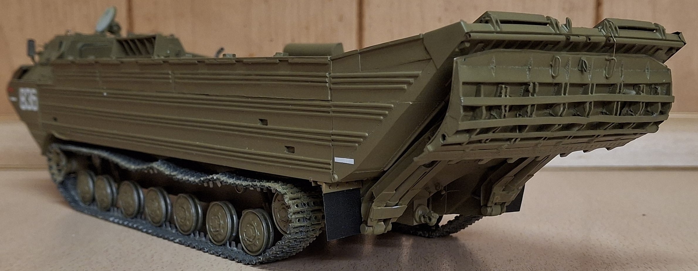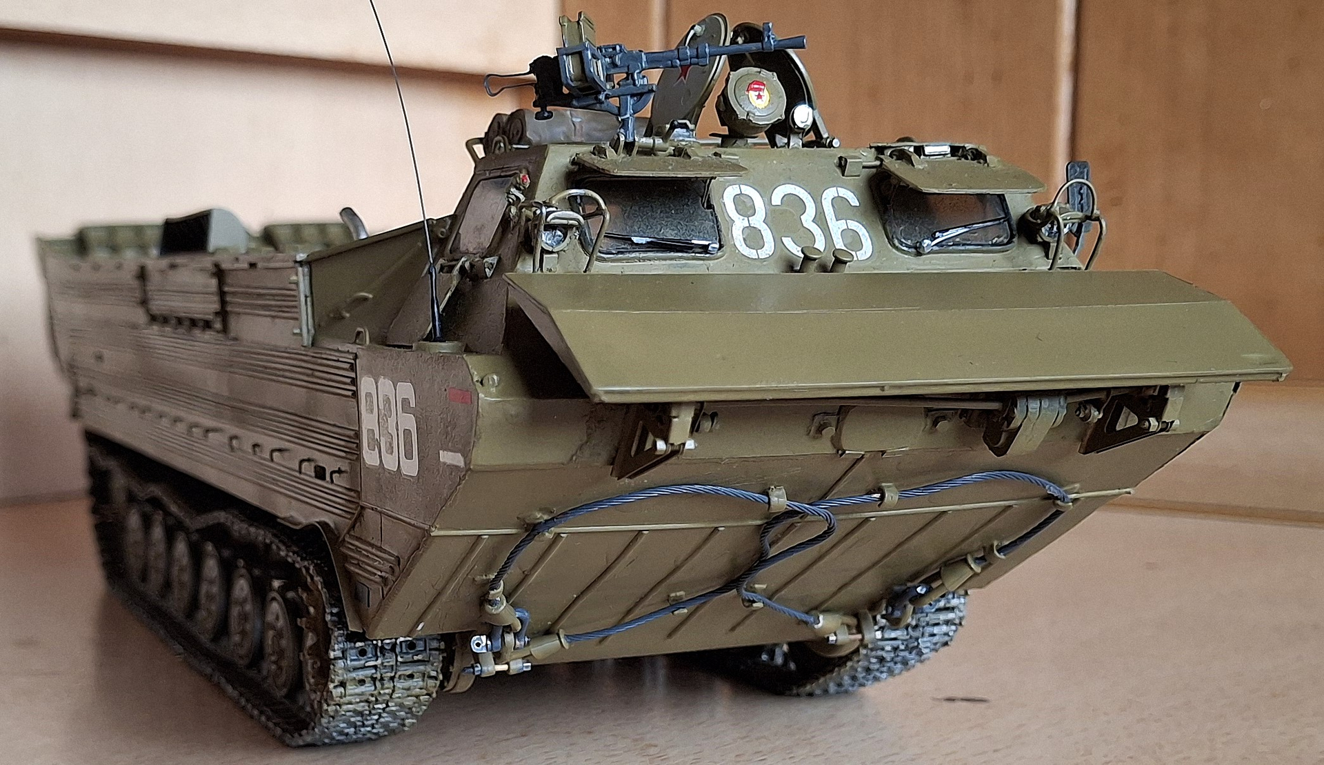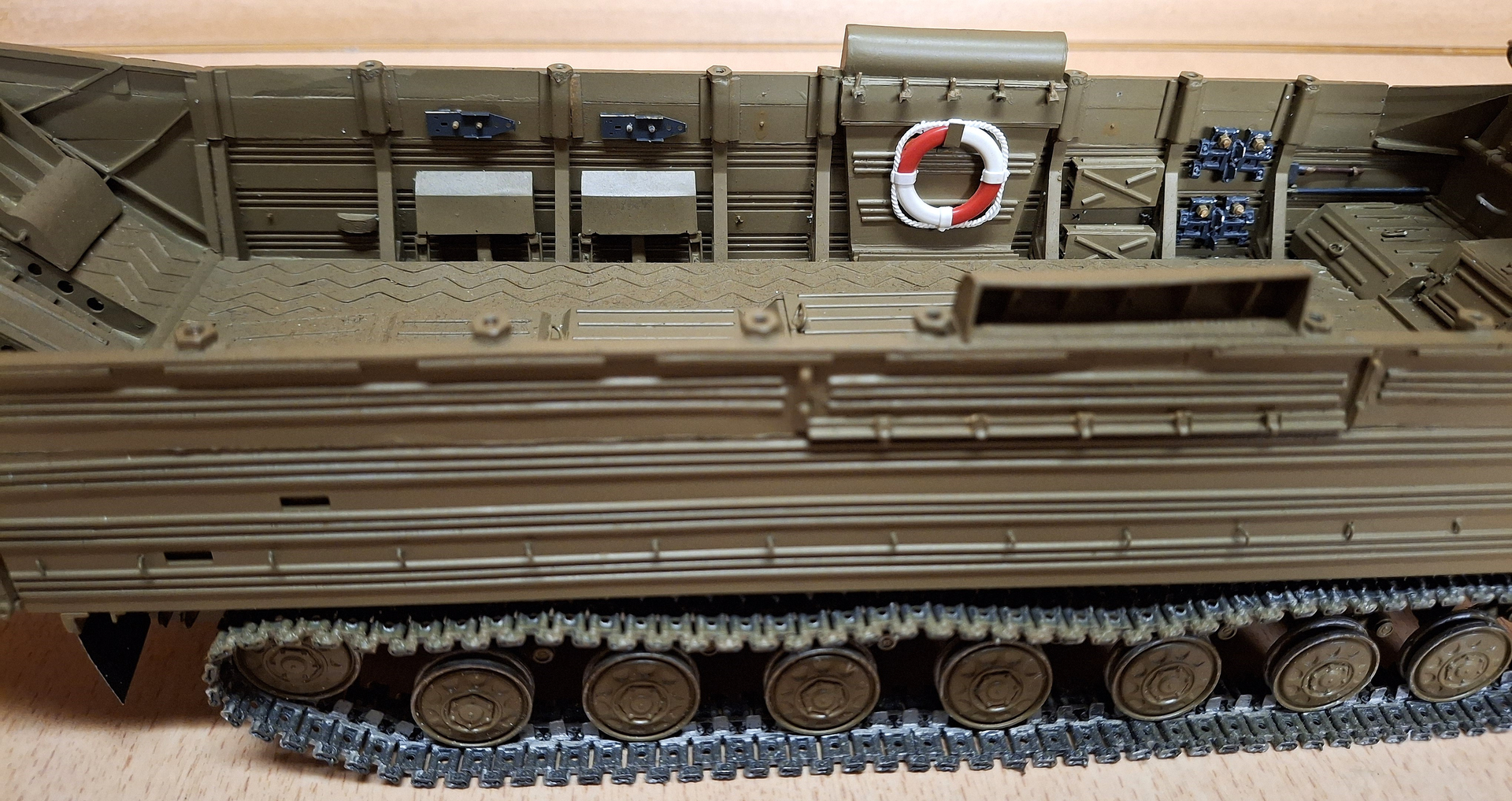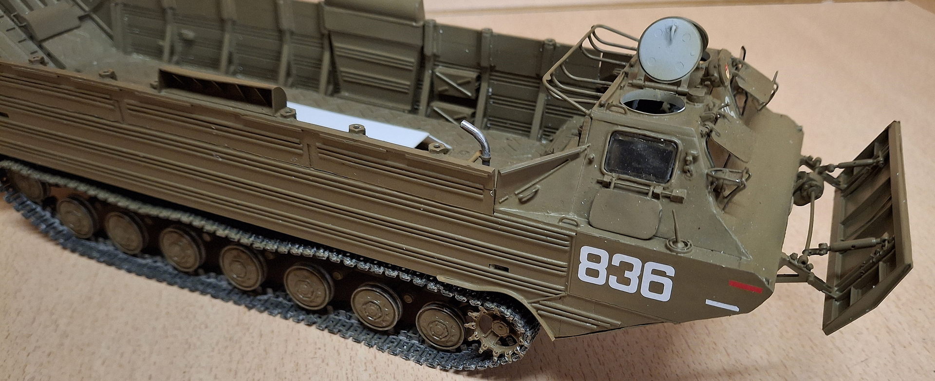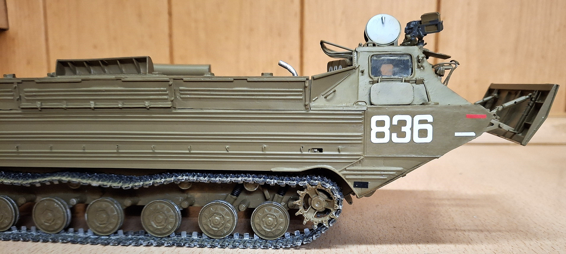 Following the construction of the KrAZ-255 TMM-3, today we continue with another model from the engineering corps of the Group of Soviet Forces in Germany (GSFG) in the former GDR. This is the amphibious tracked transport vehicle PTS-2, the successor to the PTS-M, which was introduced into the troops in the early 1980s. The vehicle is still in service today. I’ve been working on this model for several years, repeatedly abandoning it. A computer crash destroyed all the construction photos, so I’ll only show the most recent ones. The model was built using a PTS-M kit from Minimanfactory, a T-64 kit, and Friul tracks. Construction began with the cabin, which is then inserted into the pontoon. Here are some pictures of the original vehicle and the current state of the model.
