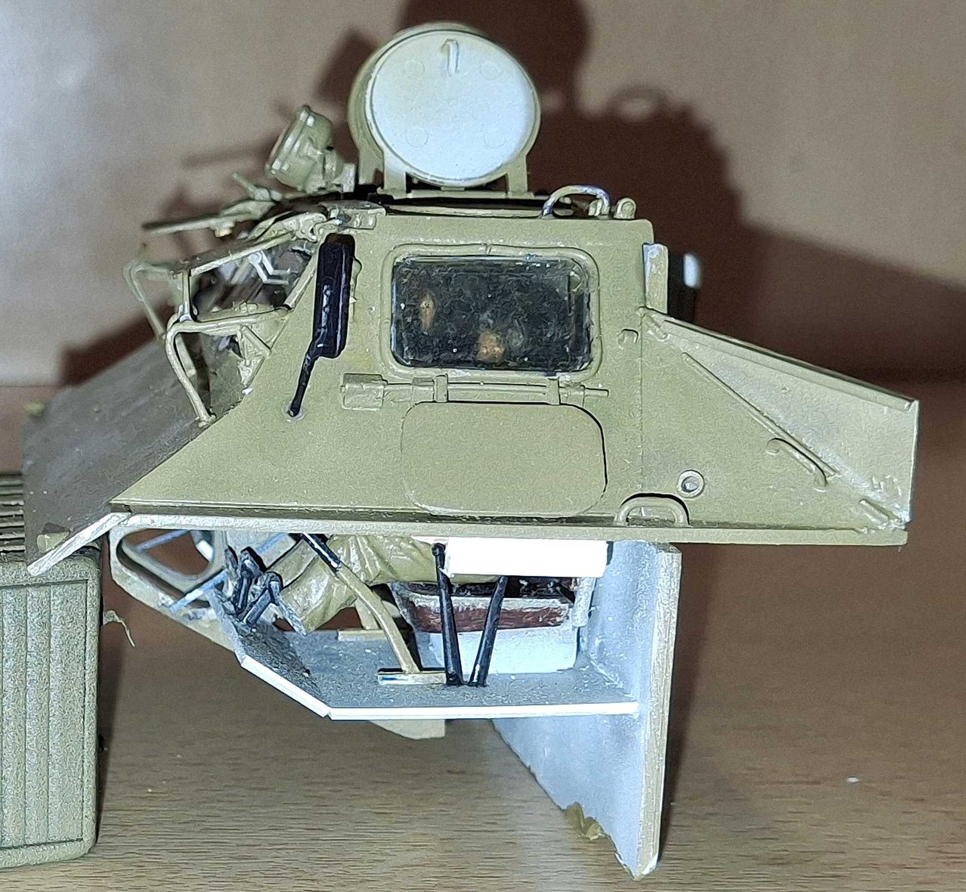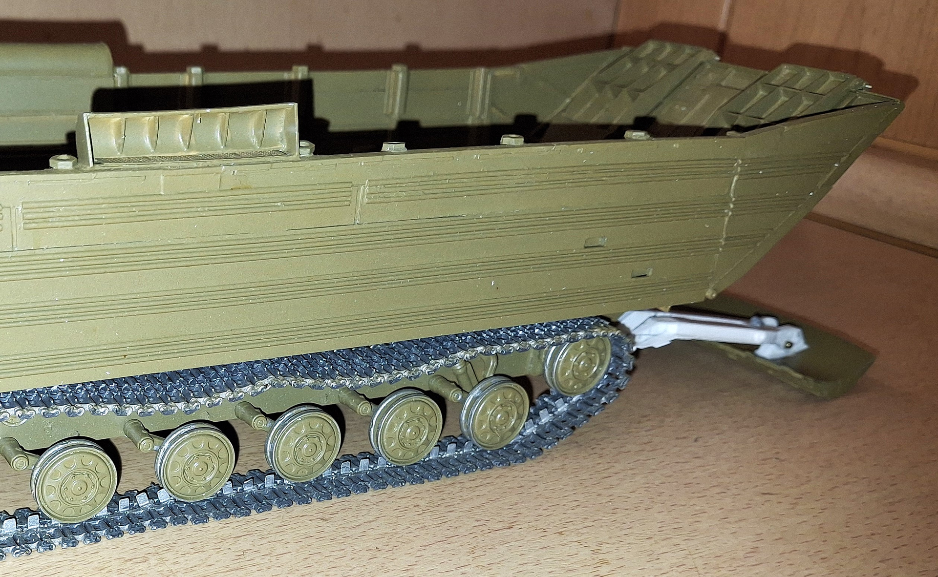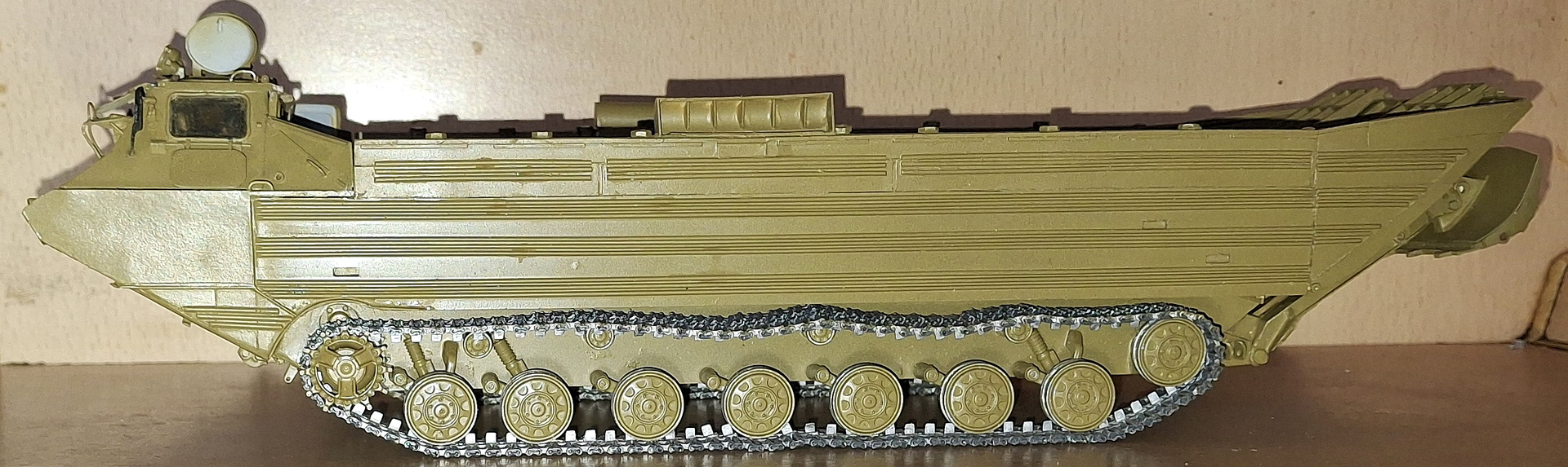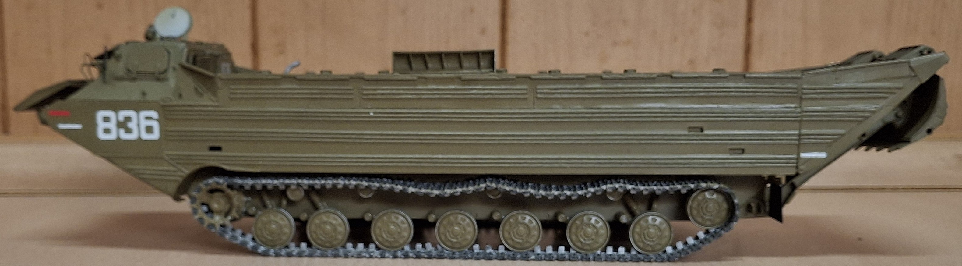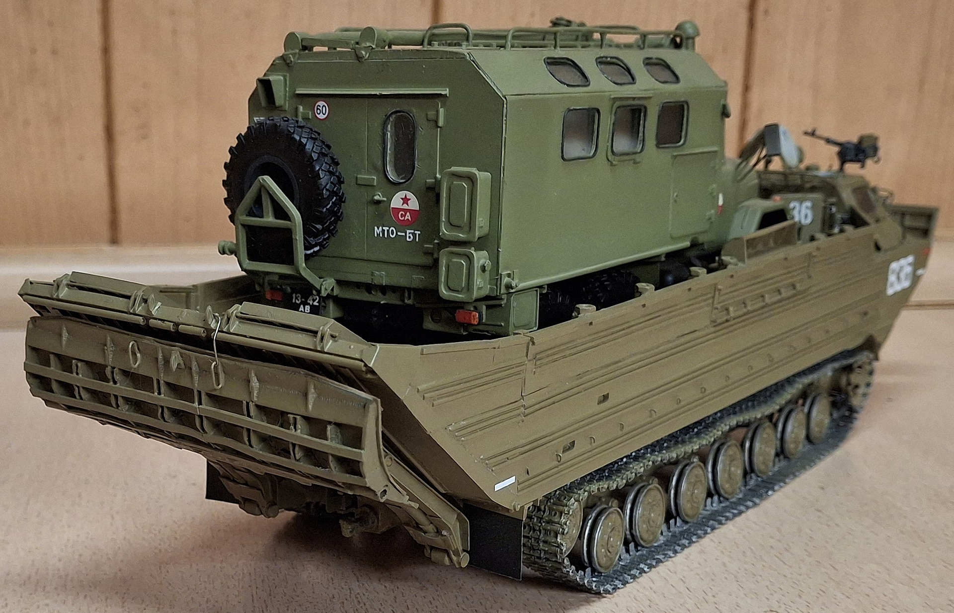 Following the construction of the KrAZ-255 TMM-3, today we continue with another model from the engineering corps of the Group of Soviet Forces in Germany (GSFG) in the former GDR. This is the amphibious tracked transport vehicle PTS-2, the successor to the PTS-M, which was introduced into the troops in the early 1980s. The vehicle is still in service today. I’ve been working on this model for several years, repeatedly abandoning it. A computer crash destroyed all the construction photos, so I’ll only show the most recent ones. The model was built using a PTS-M kit from Minimanfactory, a T-64 kit, and Friul tracks. Construction began with the cabin, which is then inserted into the pontoon. Here are some pictures of the original vehicle and the current state of the model.