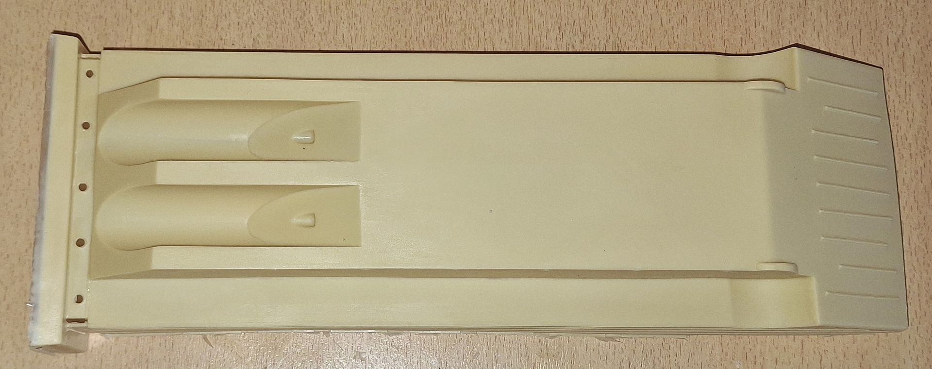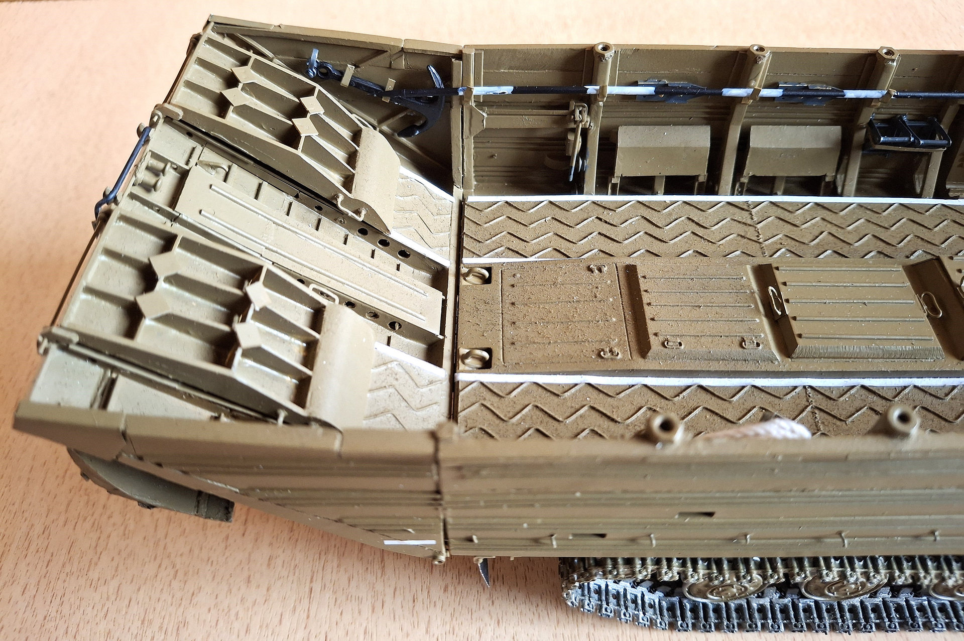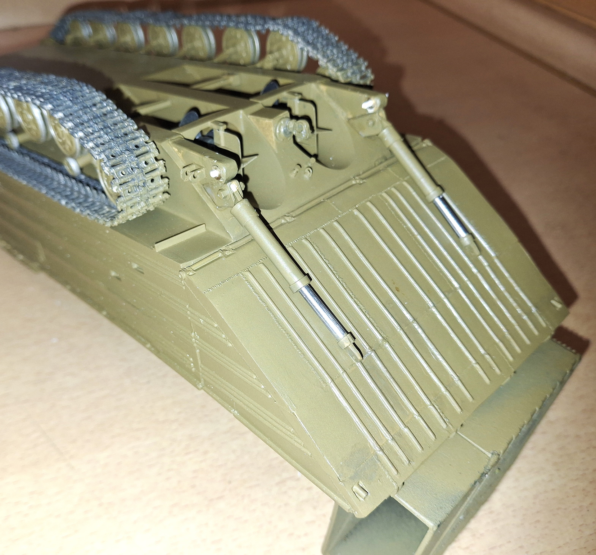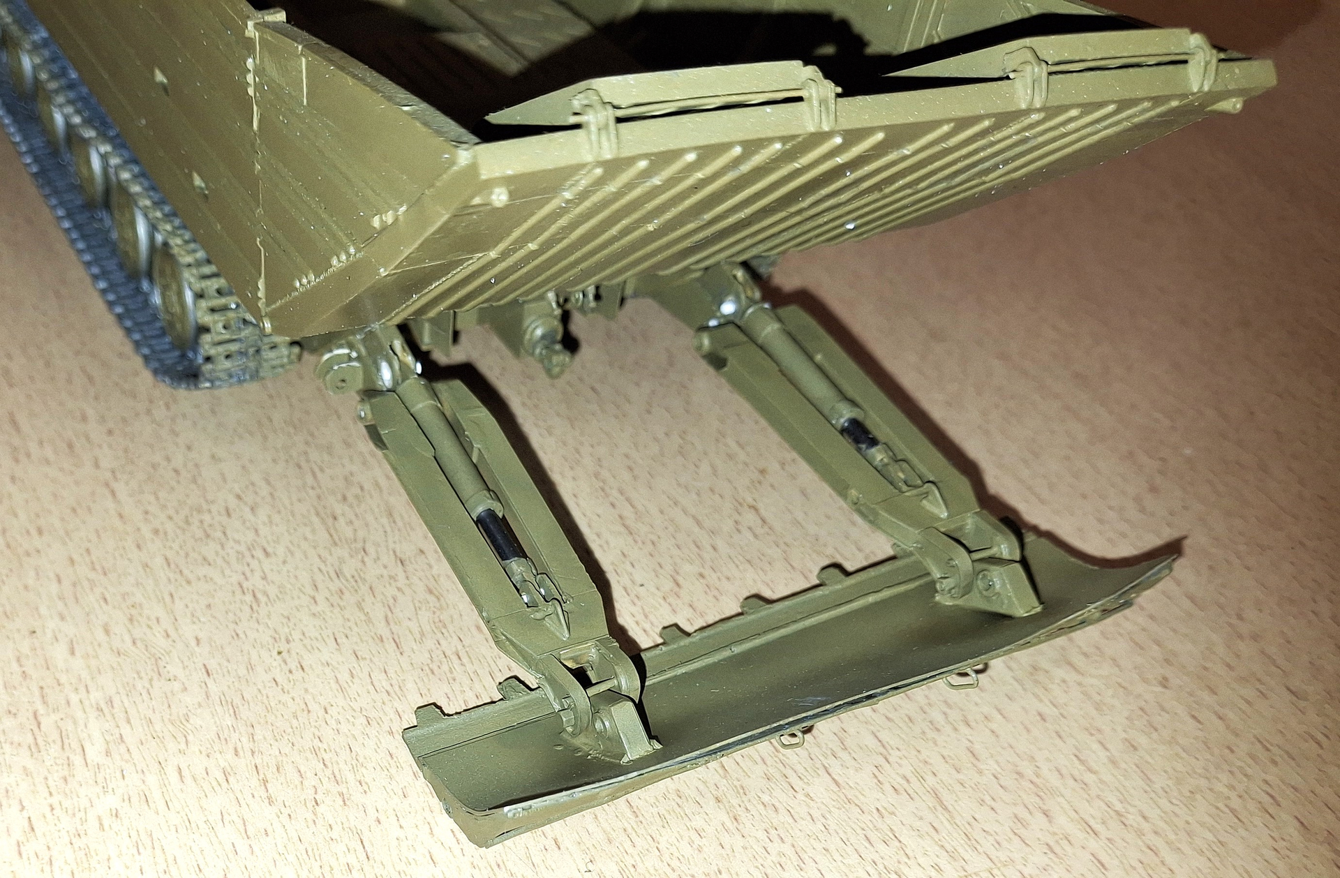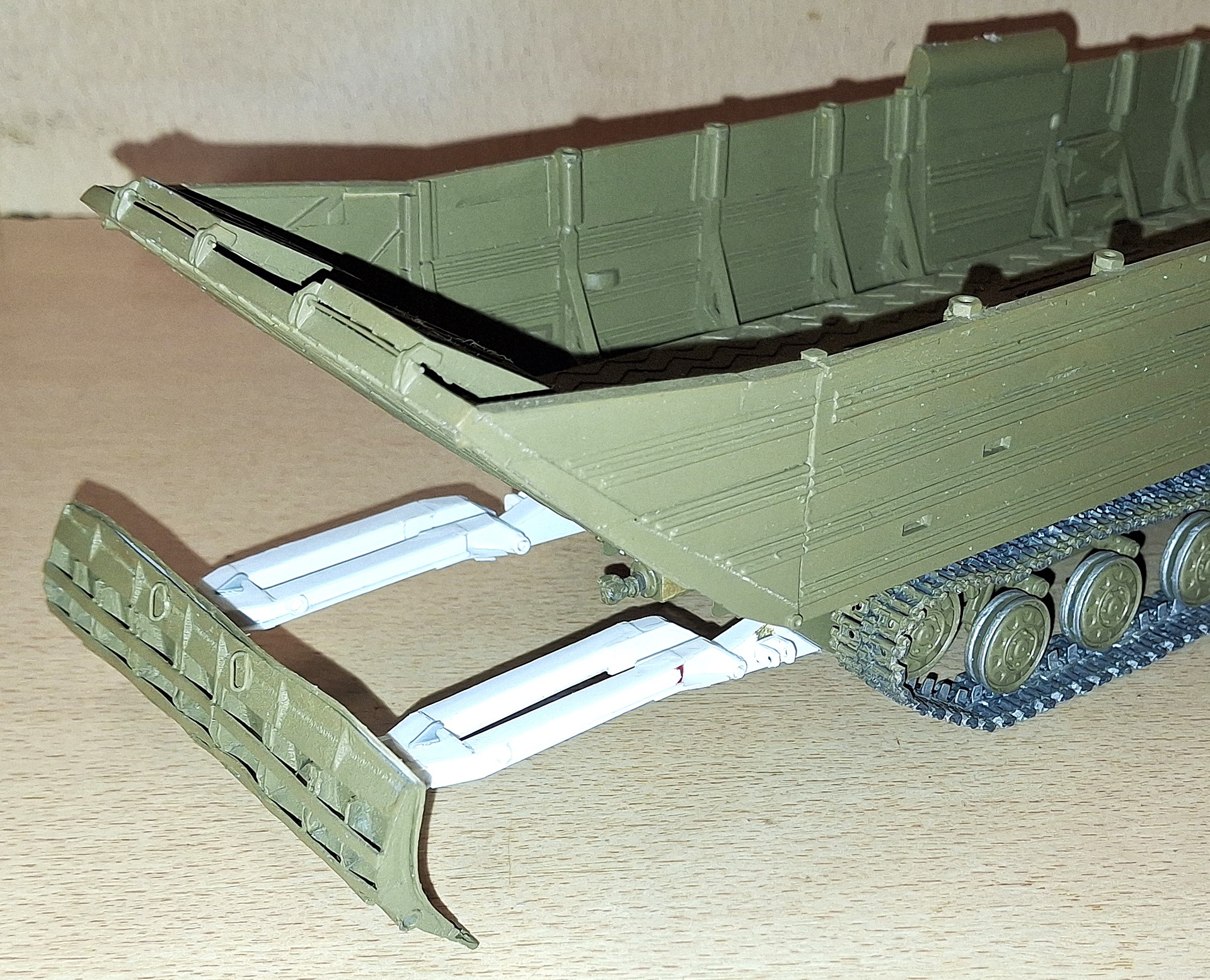 After building the hull and chassis, work continues on completing the model. Currently, the dozer blade at the rear of the vehicle is being worked on. This wasn’t present on the predecessor version, the PTS-M. Therefore, everything has to be scratch-built: the dozer blade, the push frame, and the hydraulic cylinders for moving the blade. Here are some pictures of the construction progress.