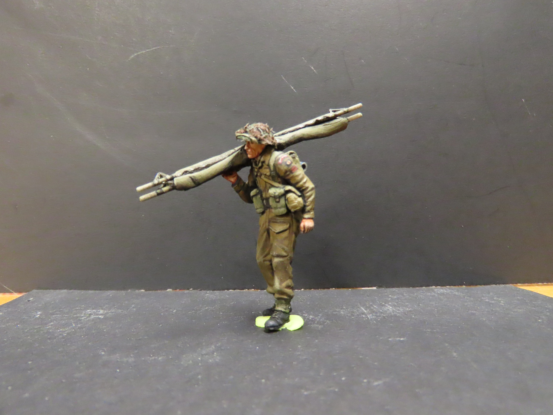 The latest guy just out of the paint shop last night. Hornet head(one of Rogers’ best IMHO) and a Bronco torso with arms. RoyalModel hands and Miniart legs from a French civilian set. Medic shell dressing bag from putty.