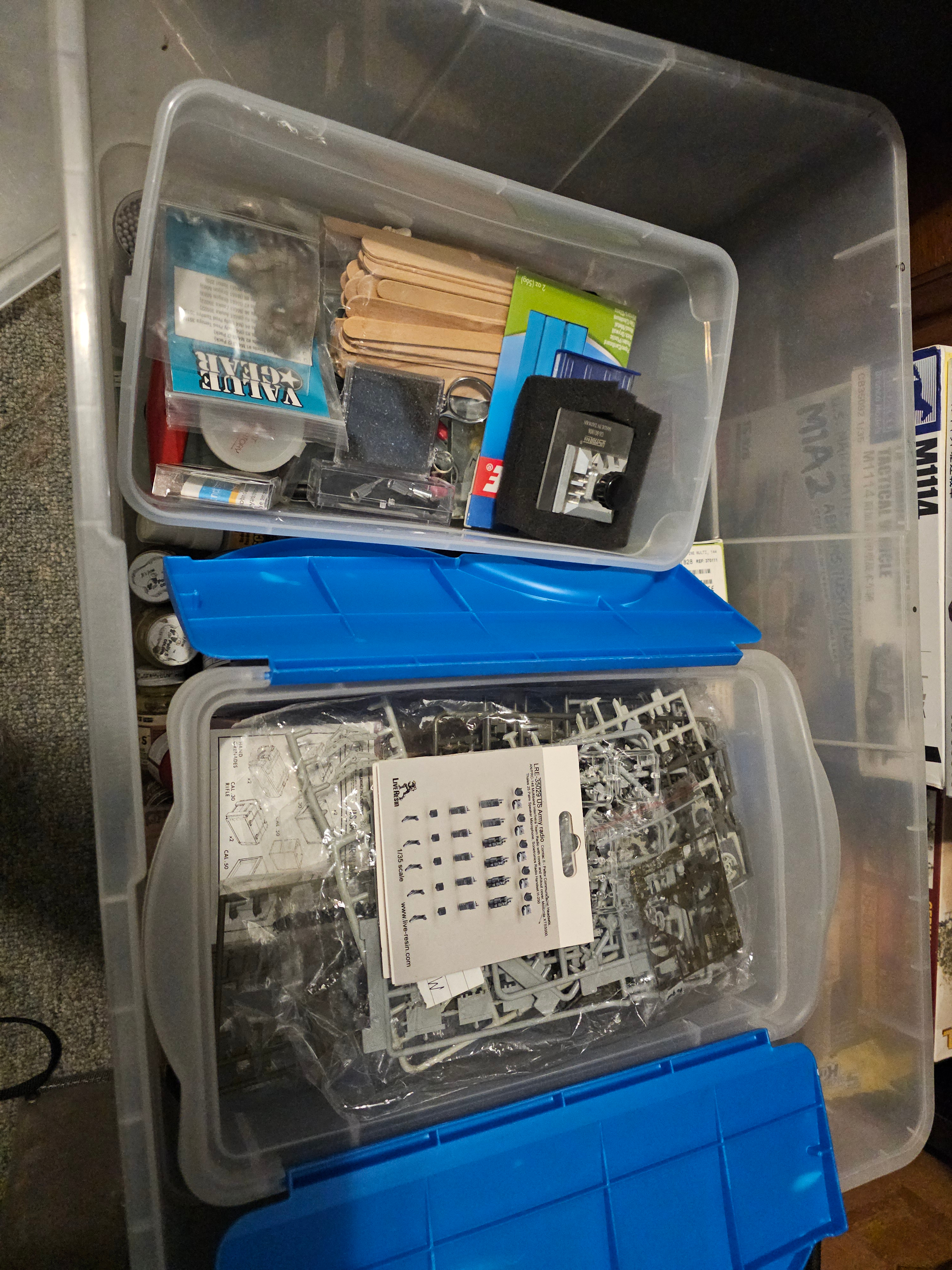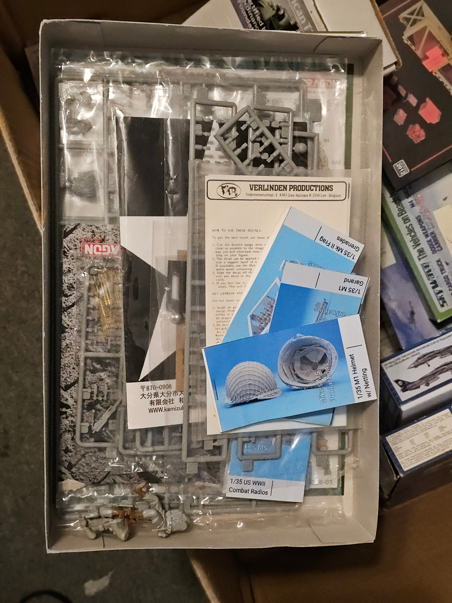 Big box of paints, weathering stuff, brushes, supplies, and resin. I will not go through to try to find something specific. $40 for everything. Shipped in a different box except for the 2 smaller containers. PENDING