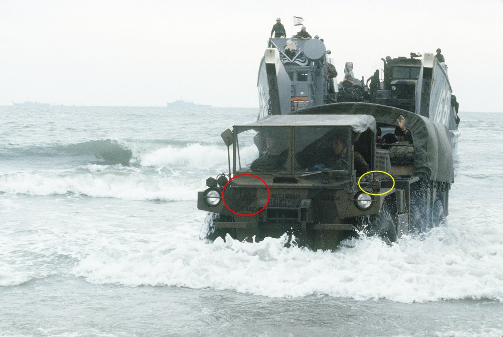 In the image below, I’m trying to make sense of the markings on the front of the Marine M561 coming off an LCU.