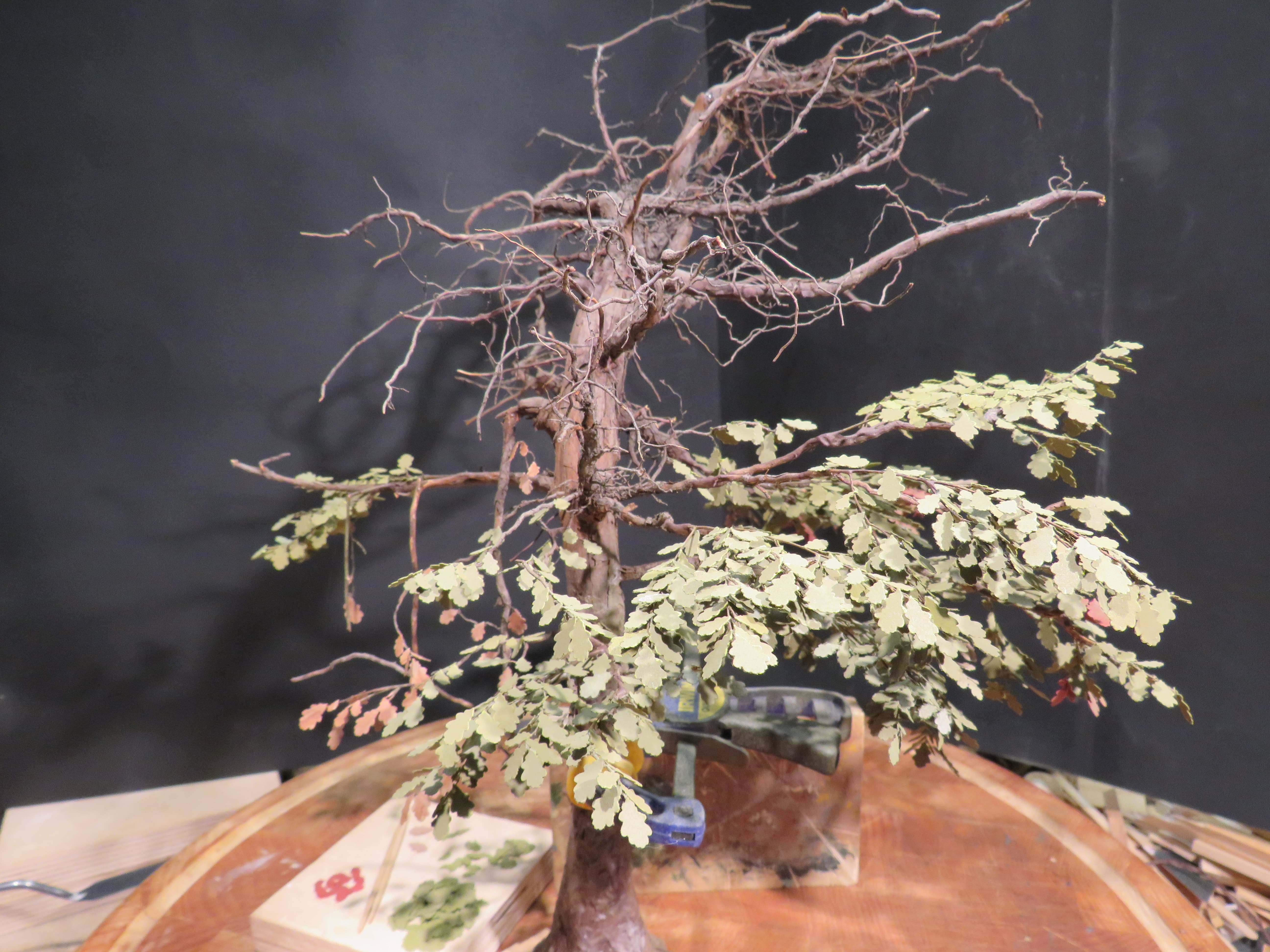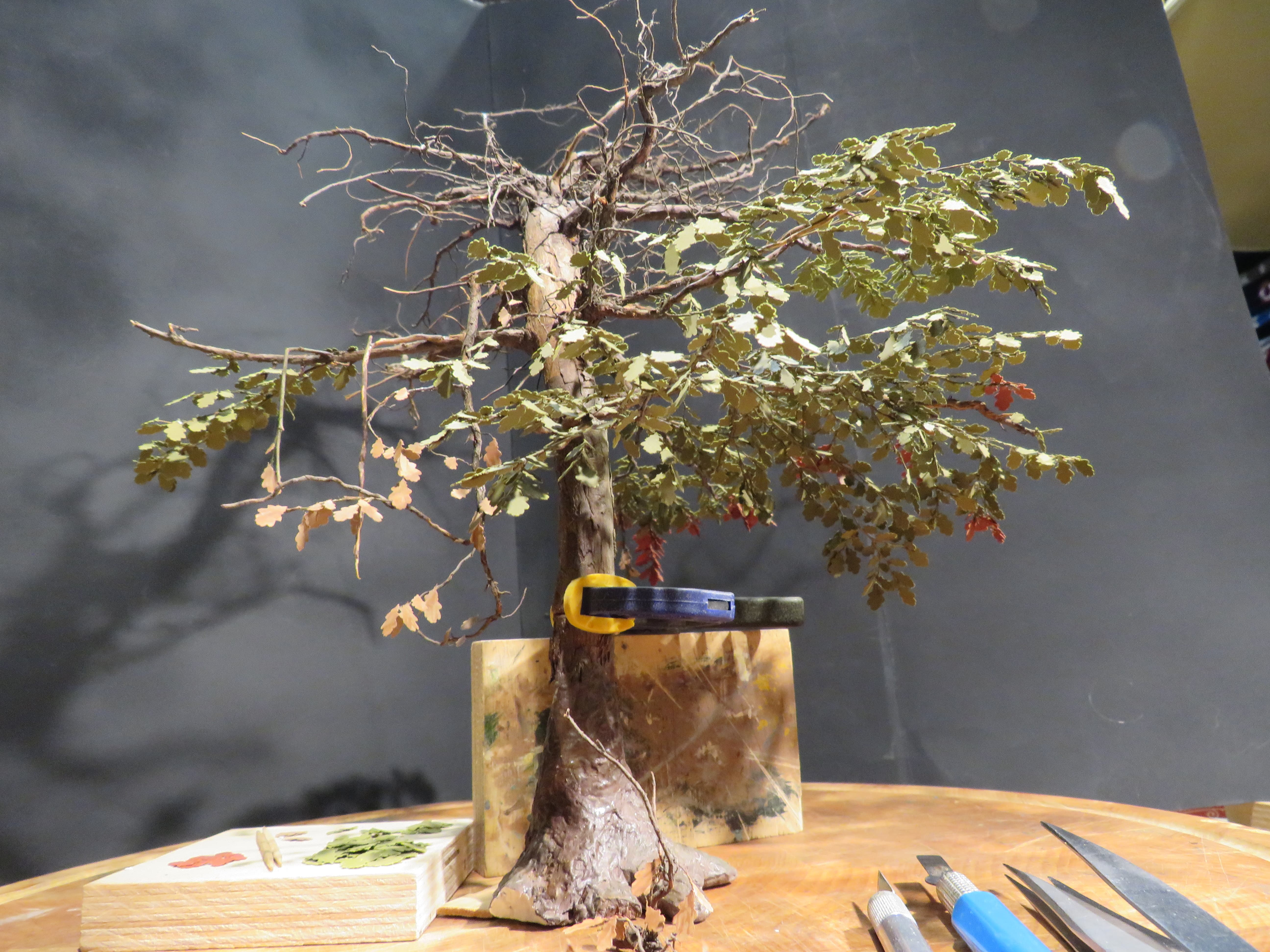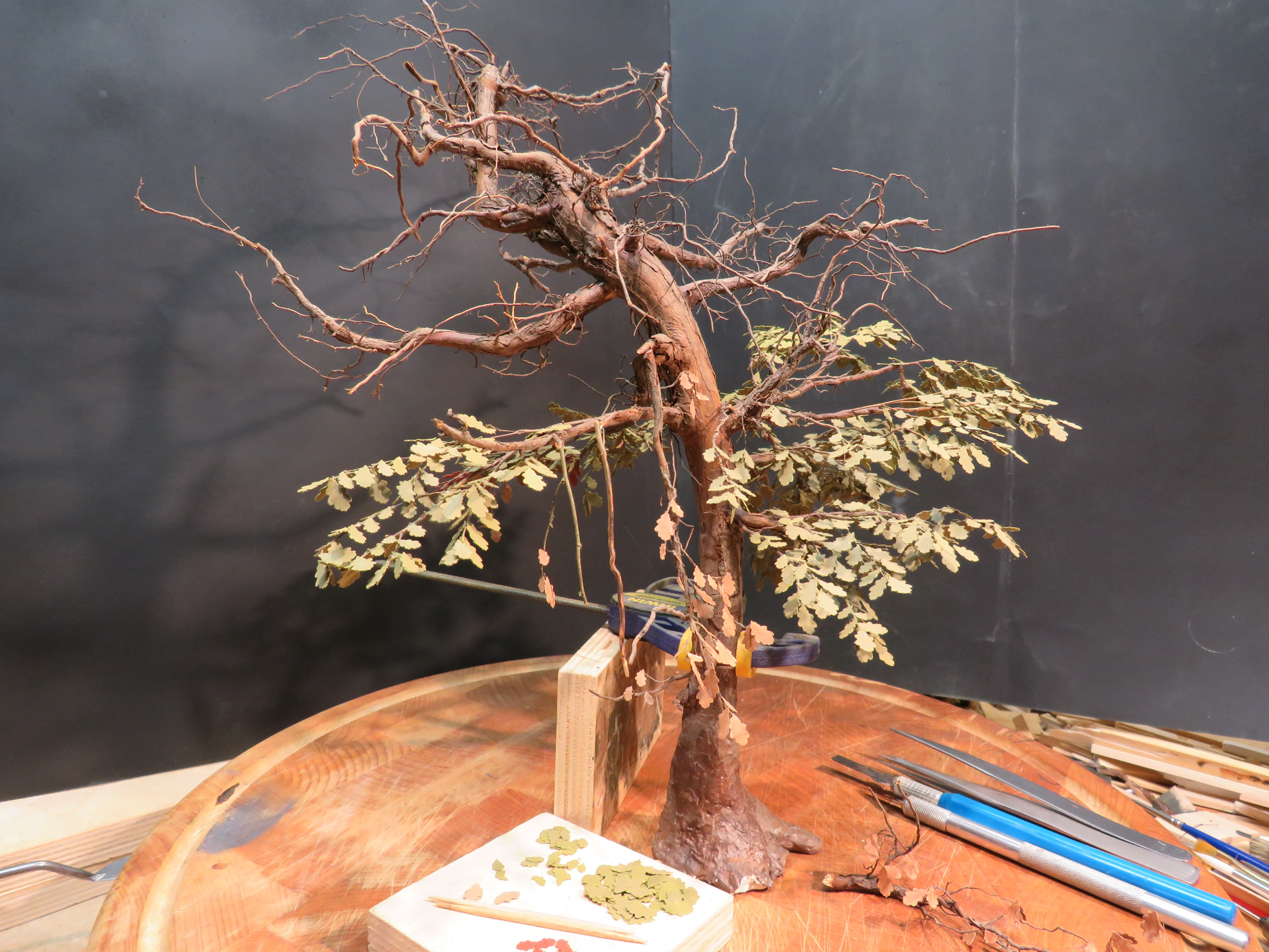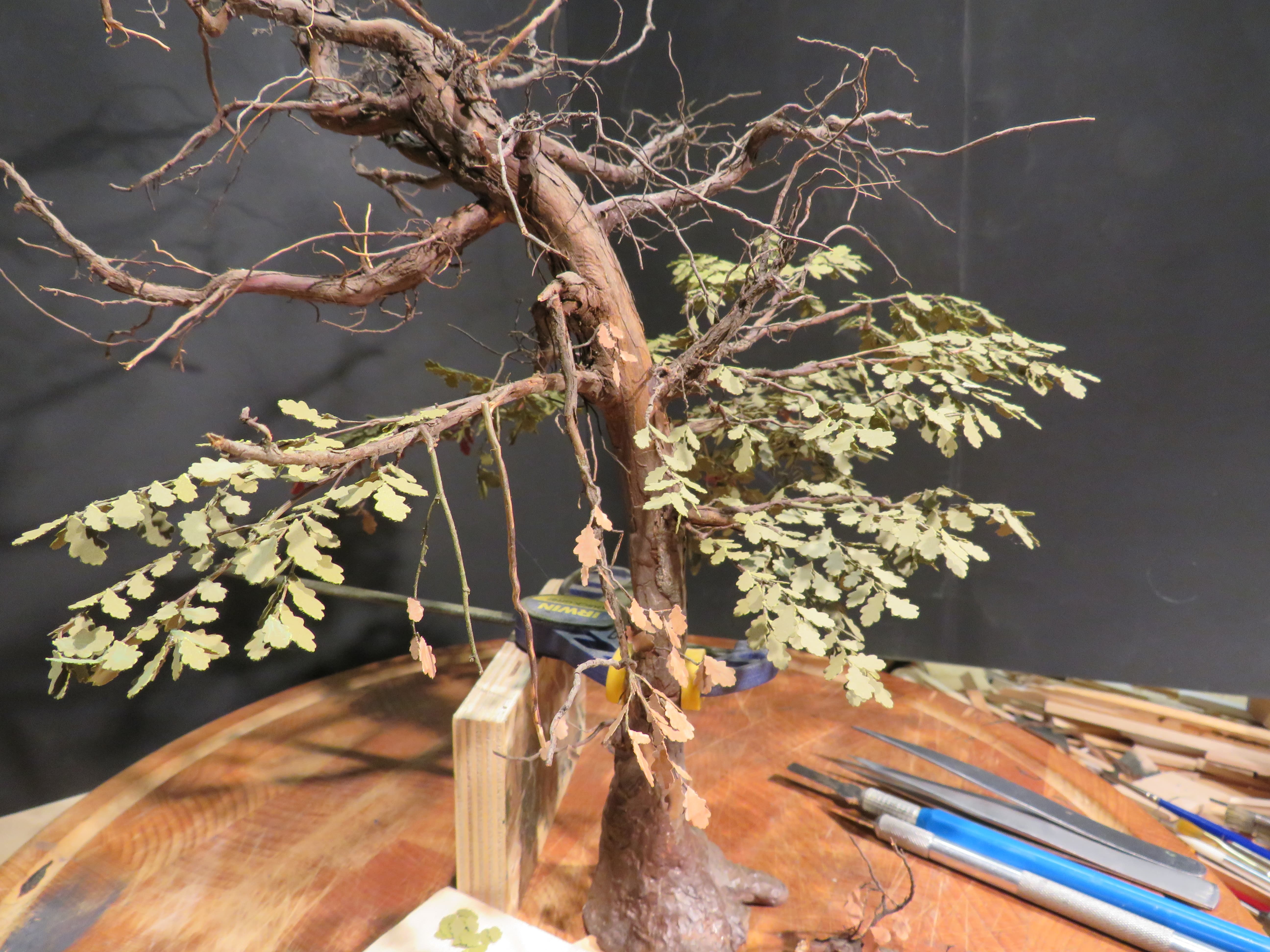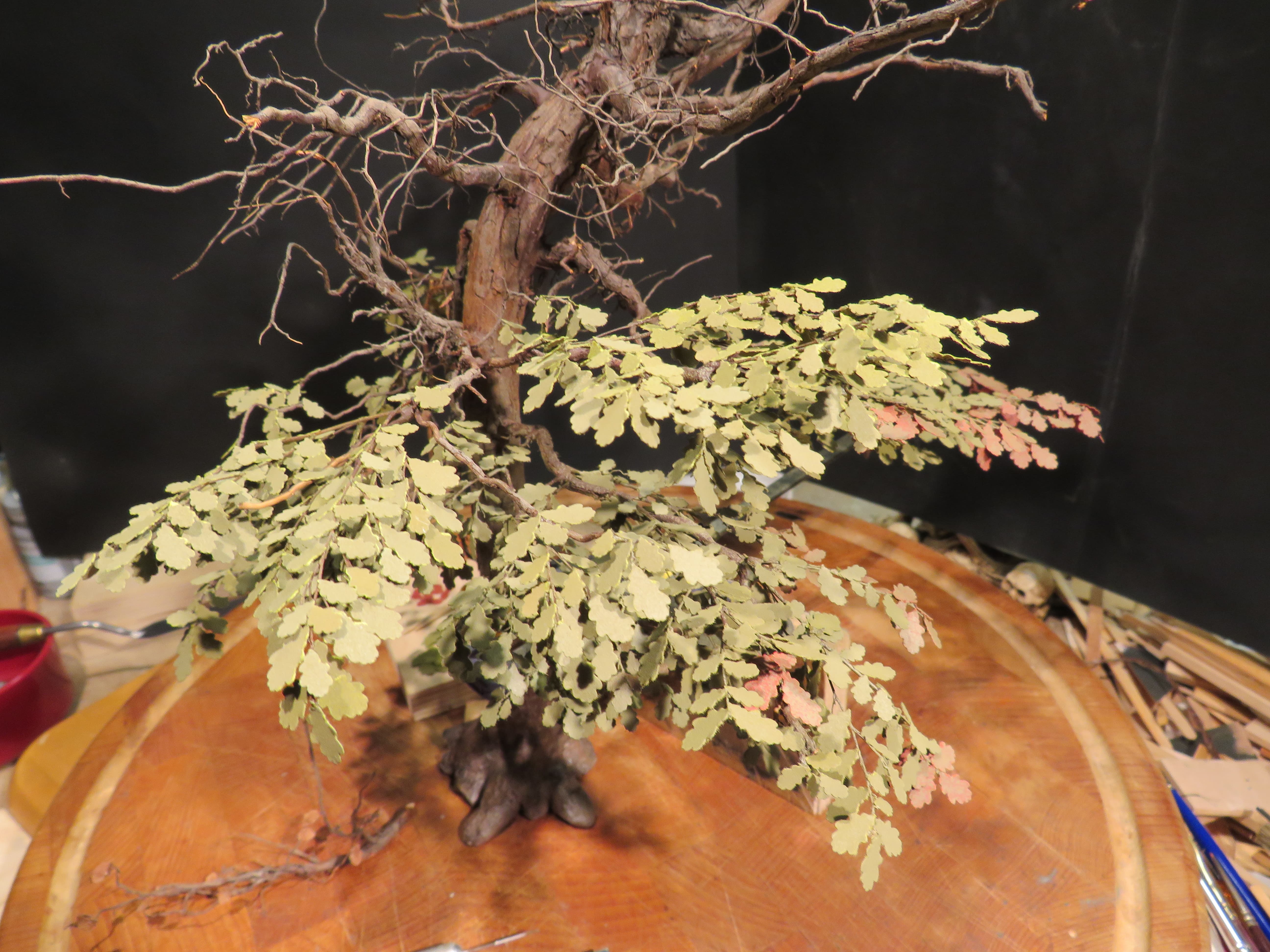 The detail and shape of this tree are terrific. The dedication to add those leaves in varying colors is inspiring. I think it will look incredible once they are all in place and the plan to put ivy creeping up will certainly tie it into the base nicely with the ivy already in place nearby.