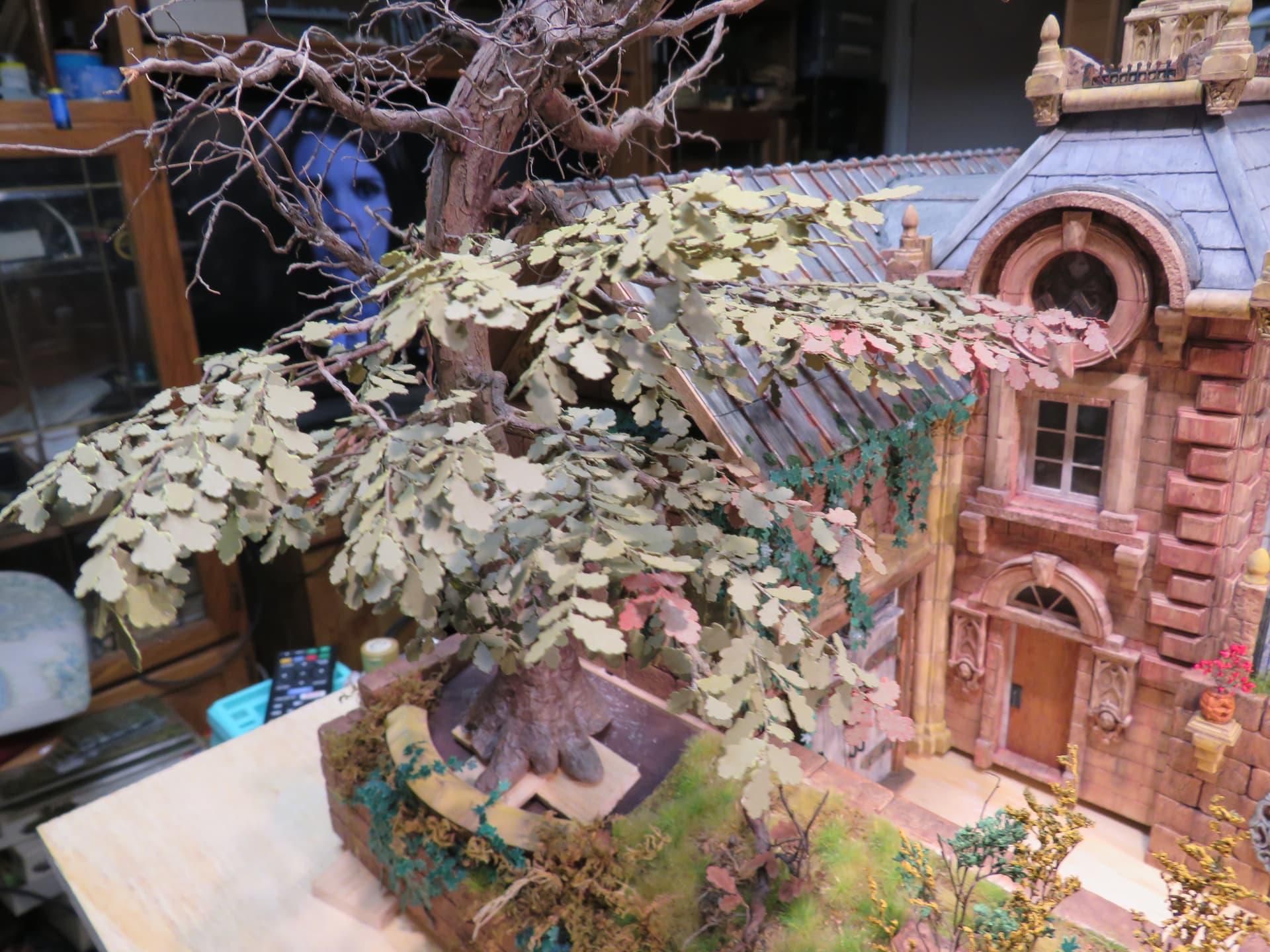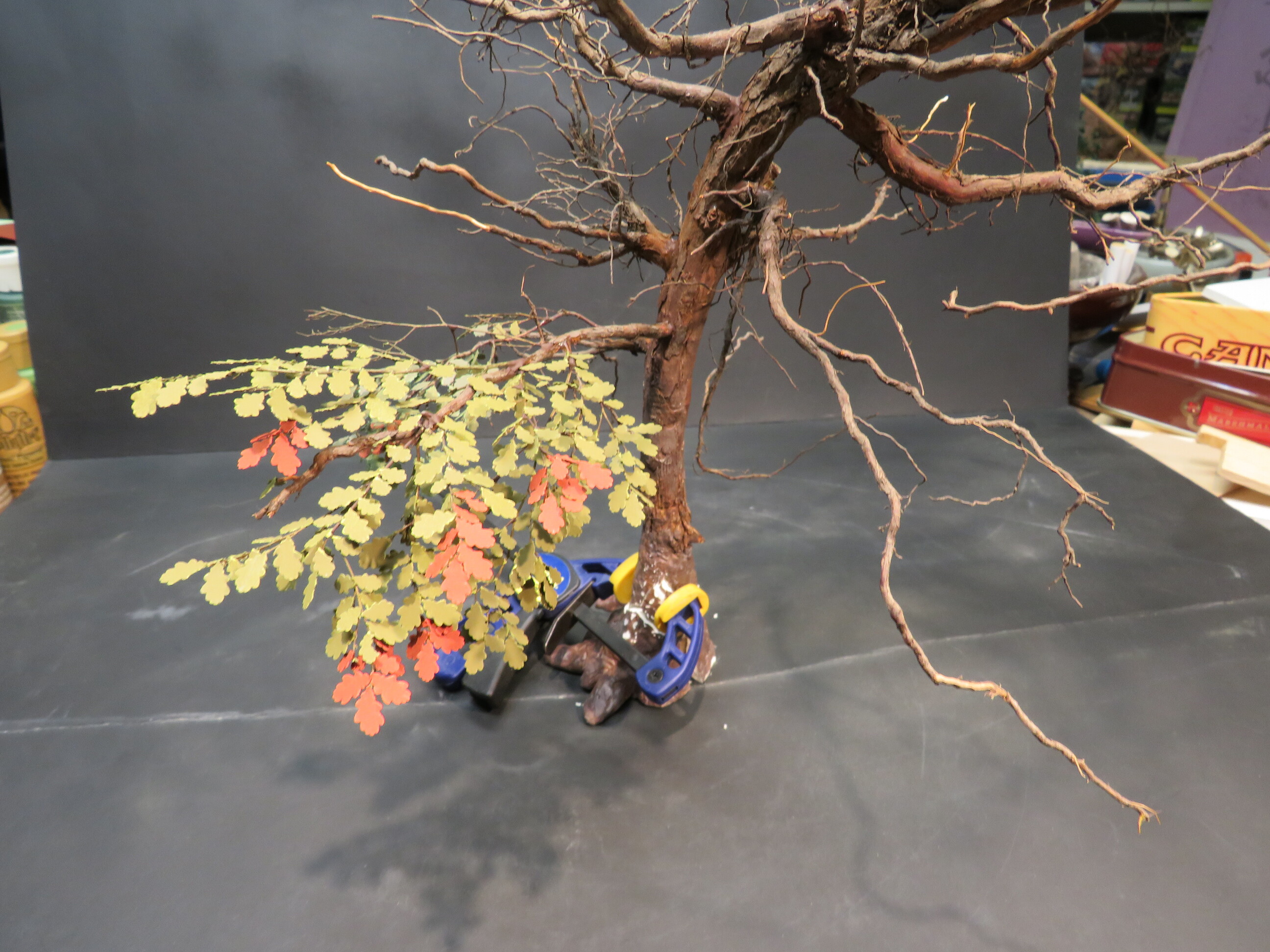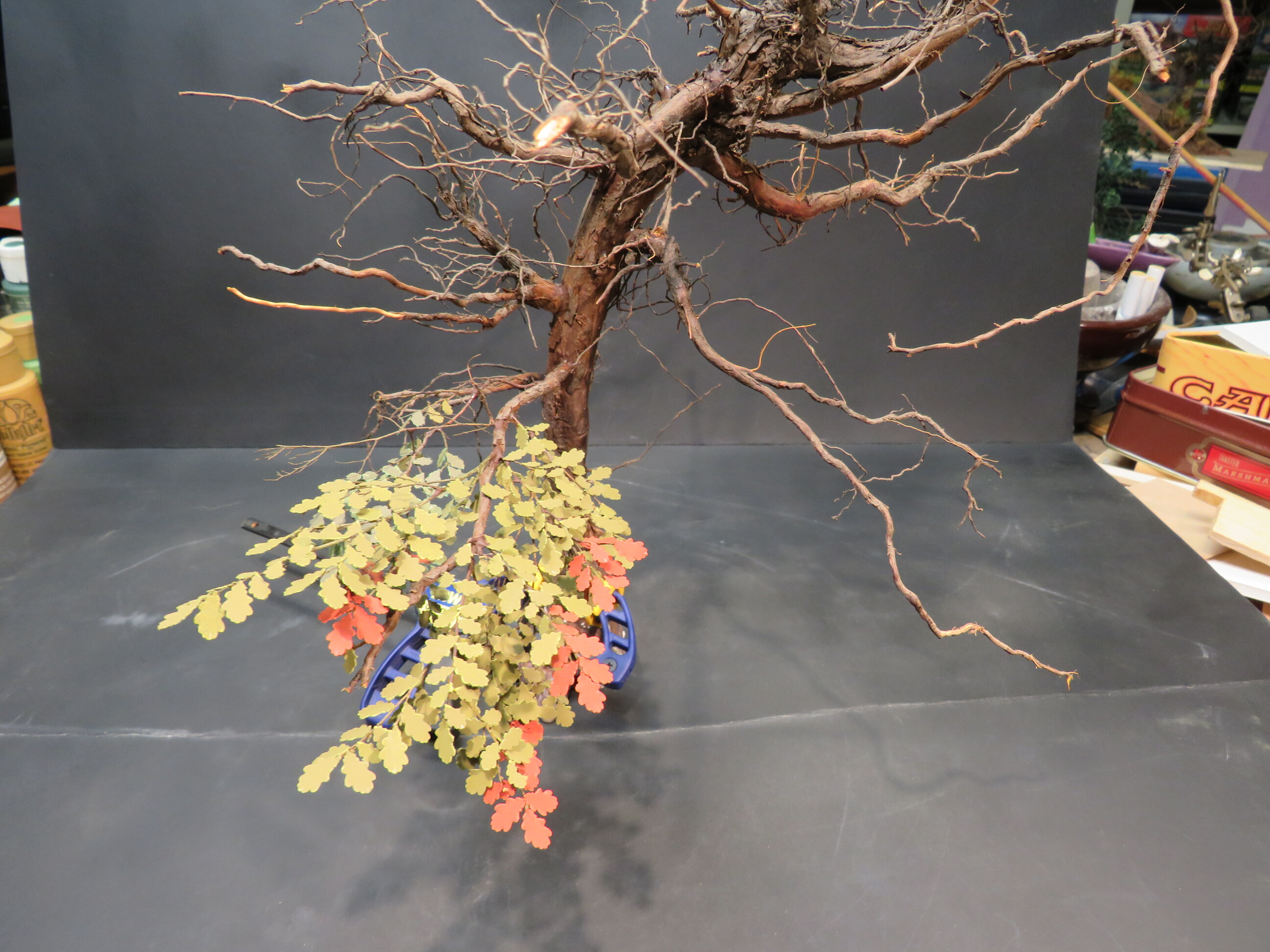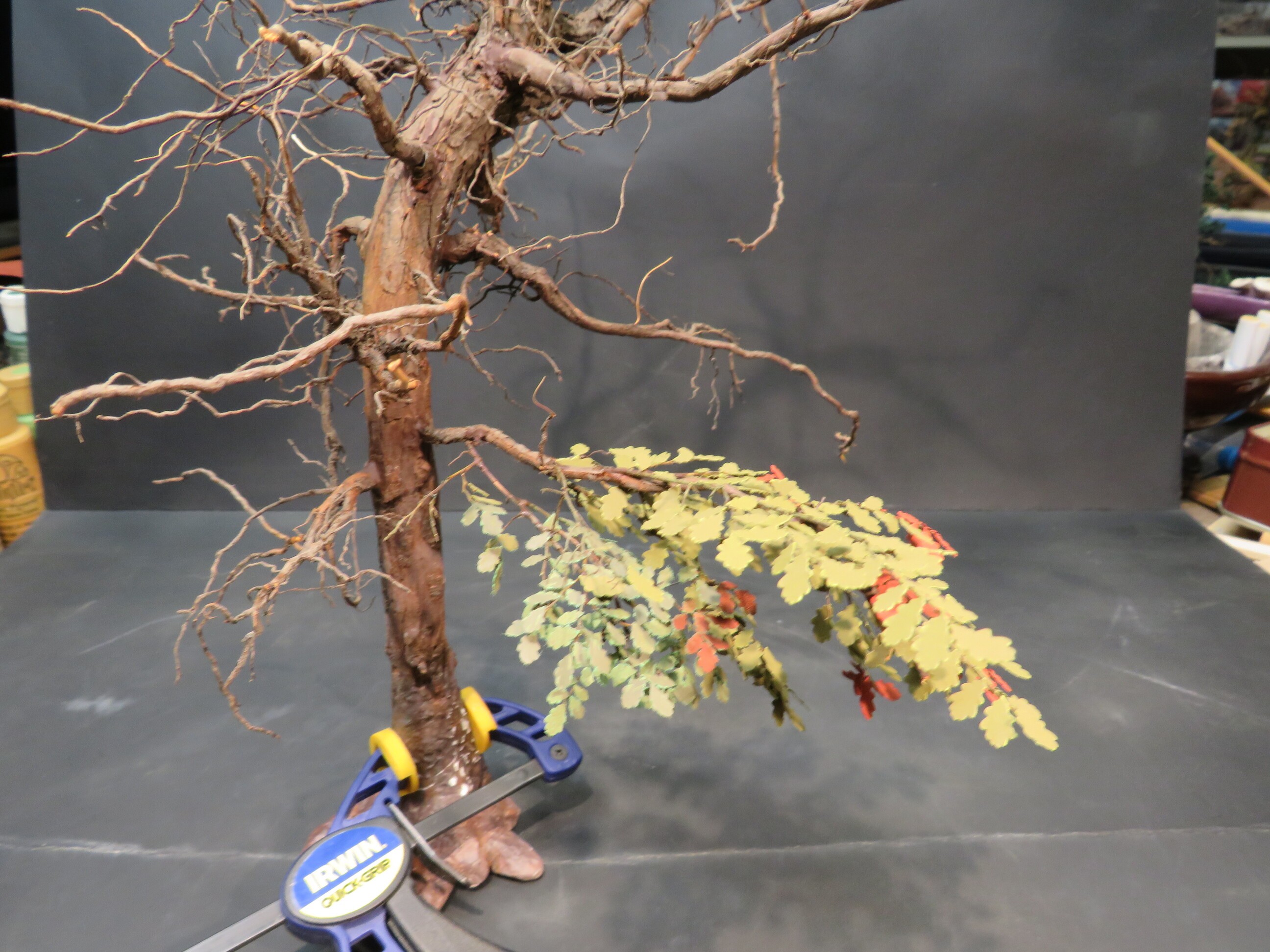 The detail and shape of this tree are terrific. The dedication to add those leaves in varying colors is inspiring. I think it will look incredible once they are all in place and the plan to put ivy creeping up will certainly tie it into the base nicely with the ivy already in place nearby.