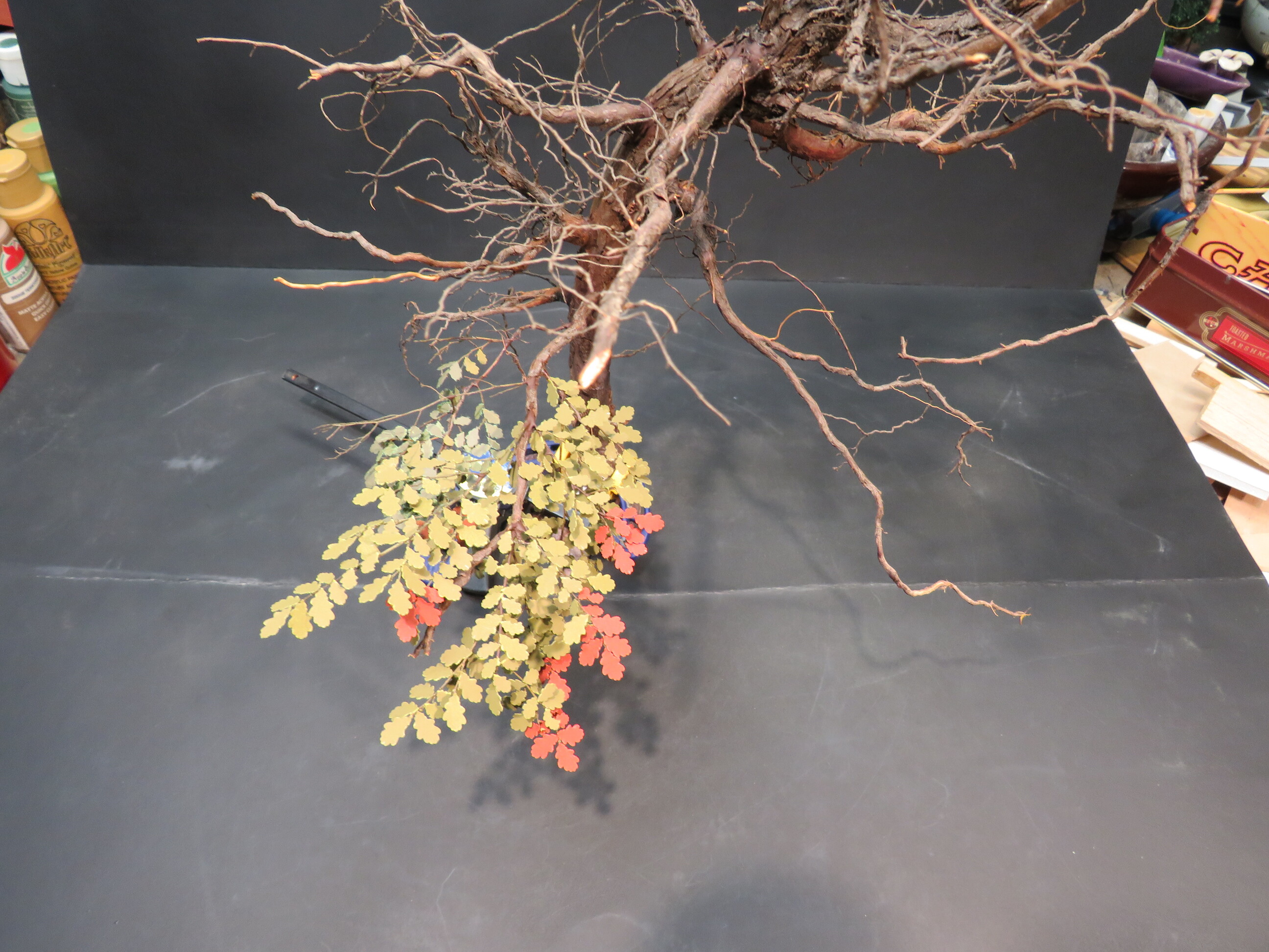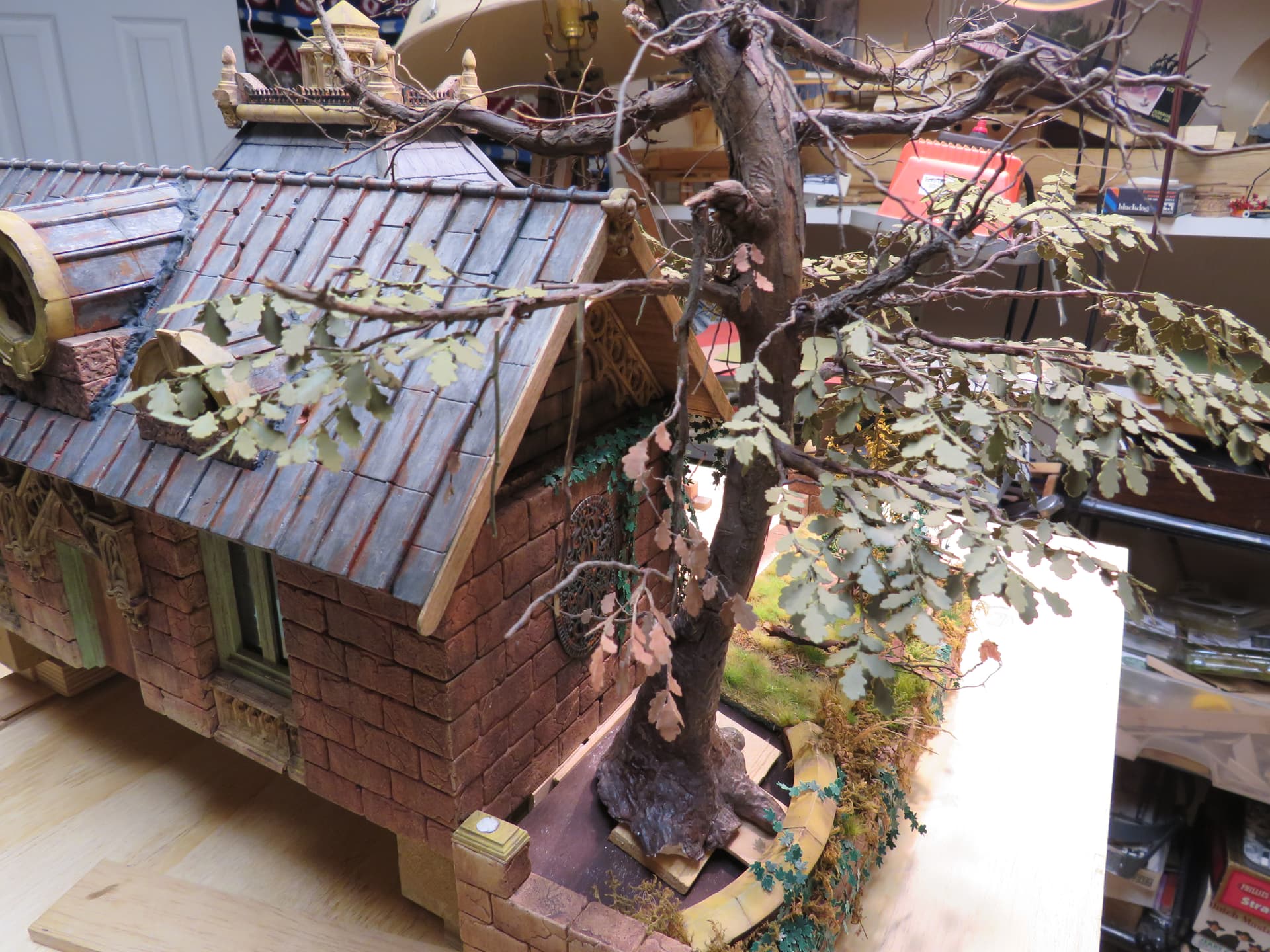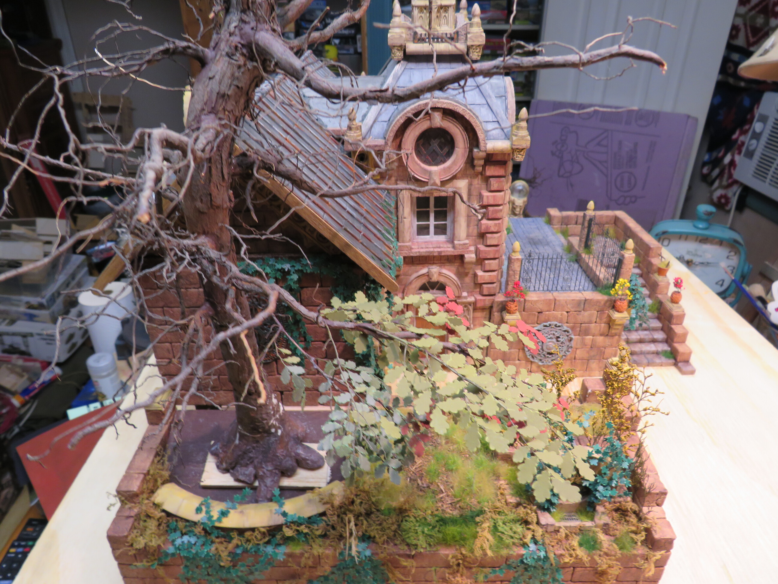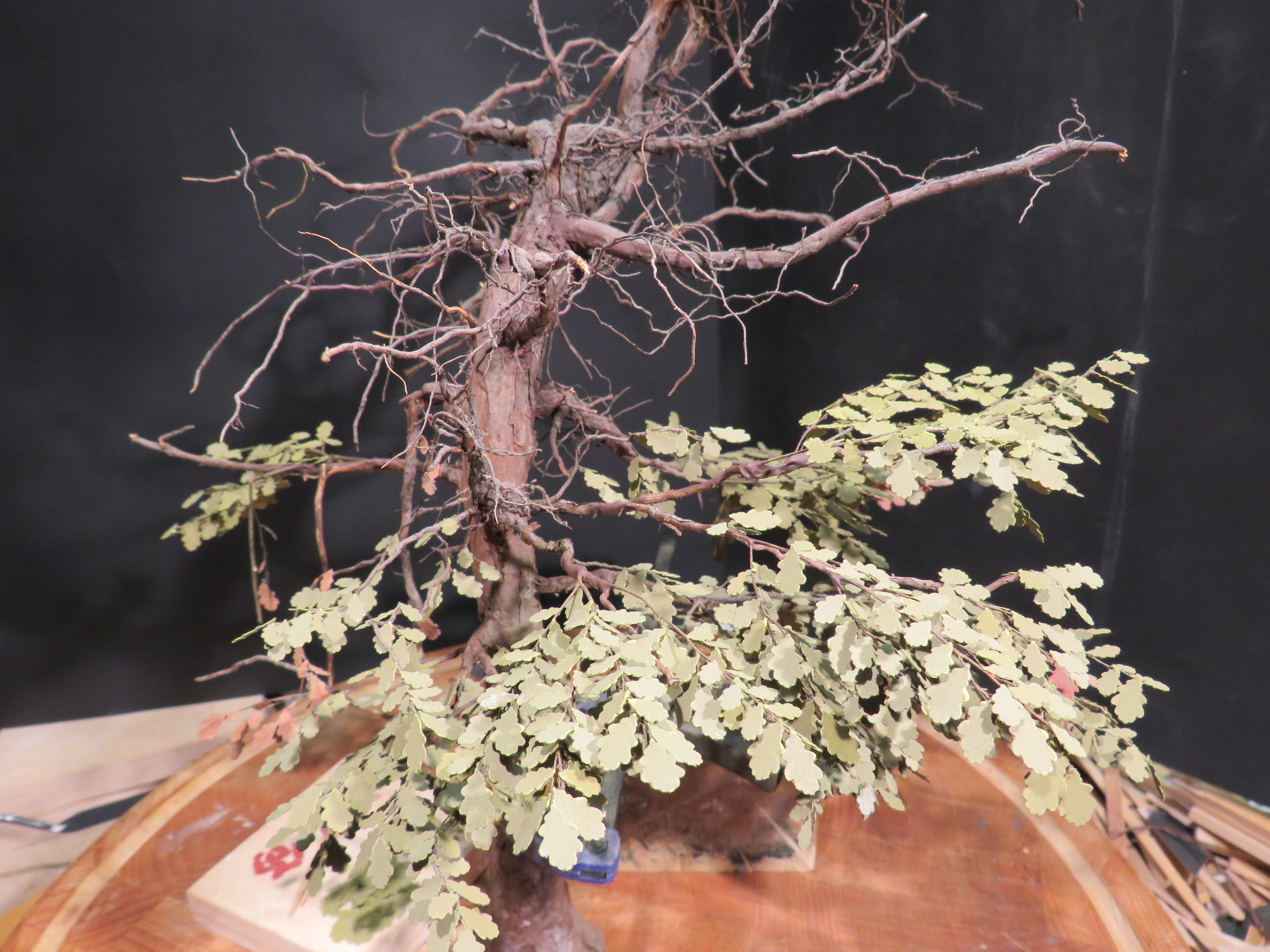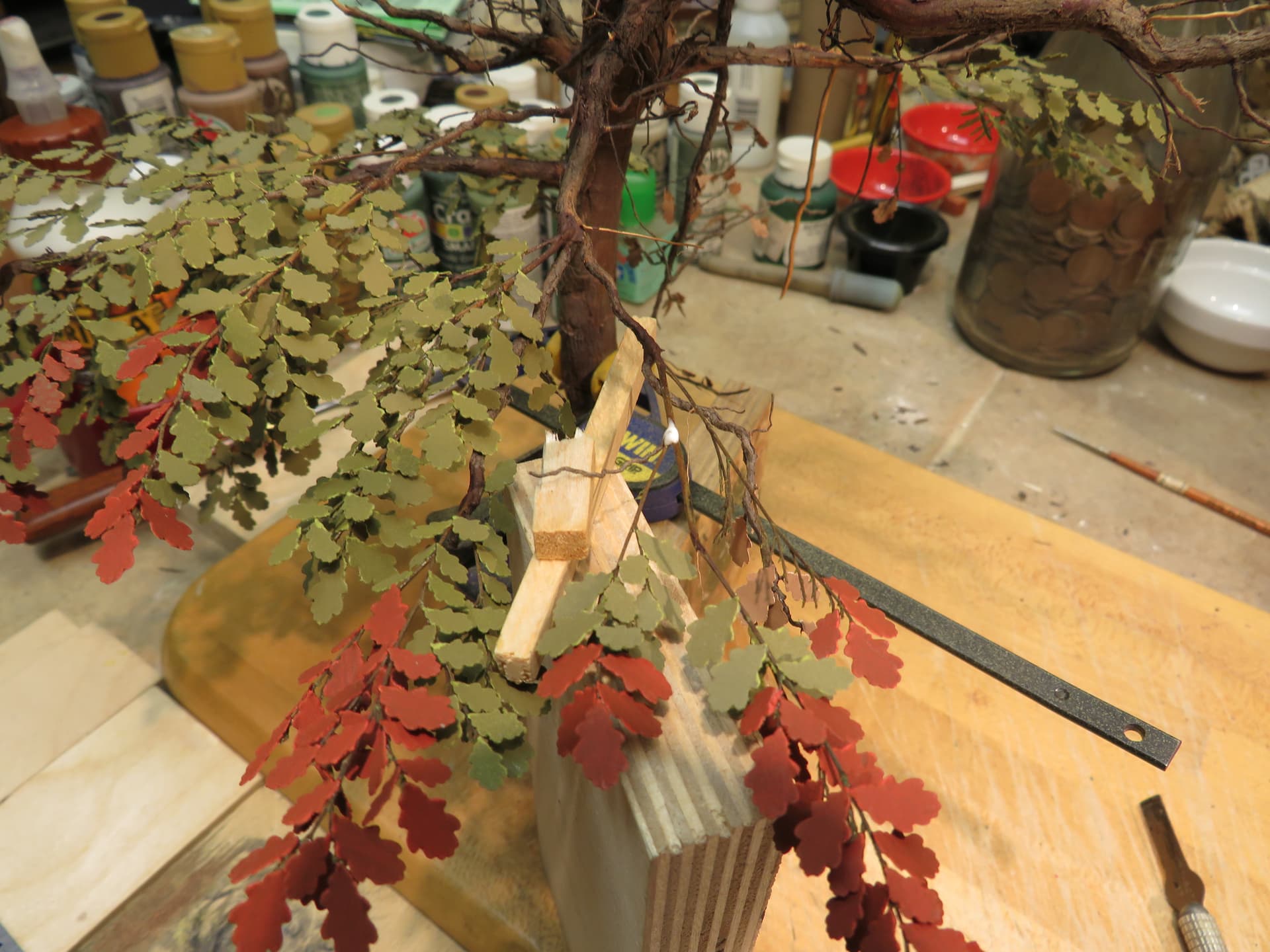 The detail and shape of this tree are terrific. The dedication to add those leaves in varying colors is inspiring. I think it will look incredible once they are all in place and the plan to put ivy creeping up will certainly tie it into the base nicely with the ivy already in place nearby.