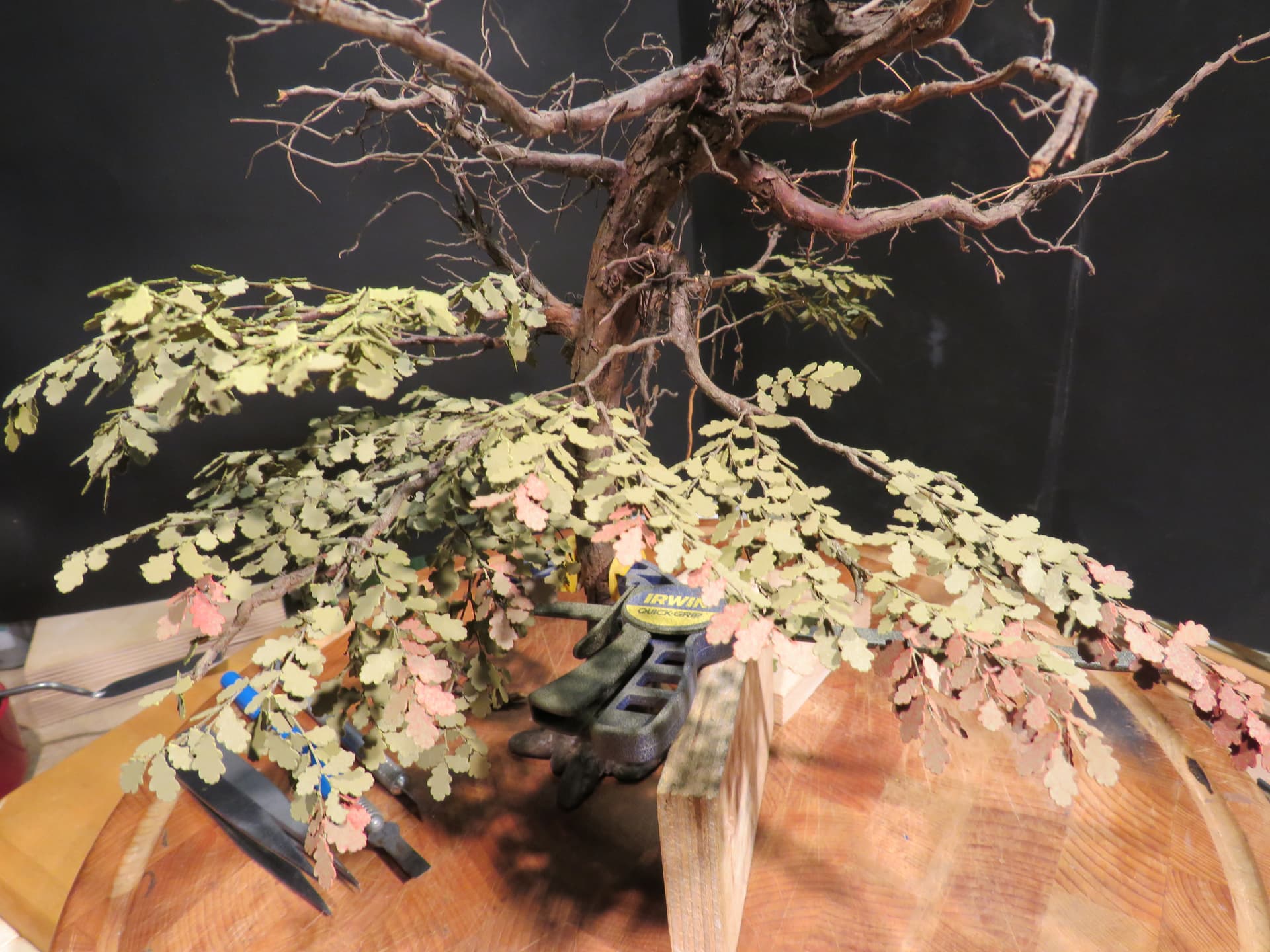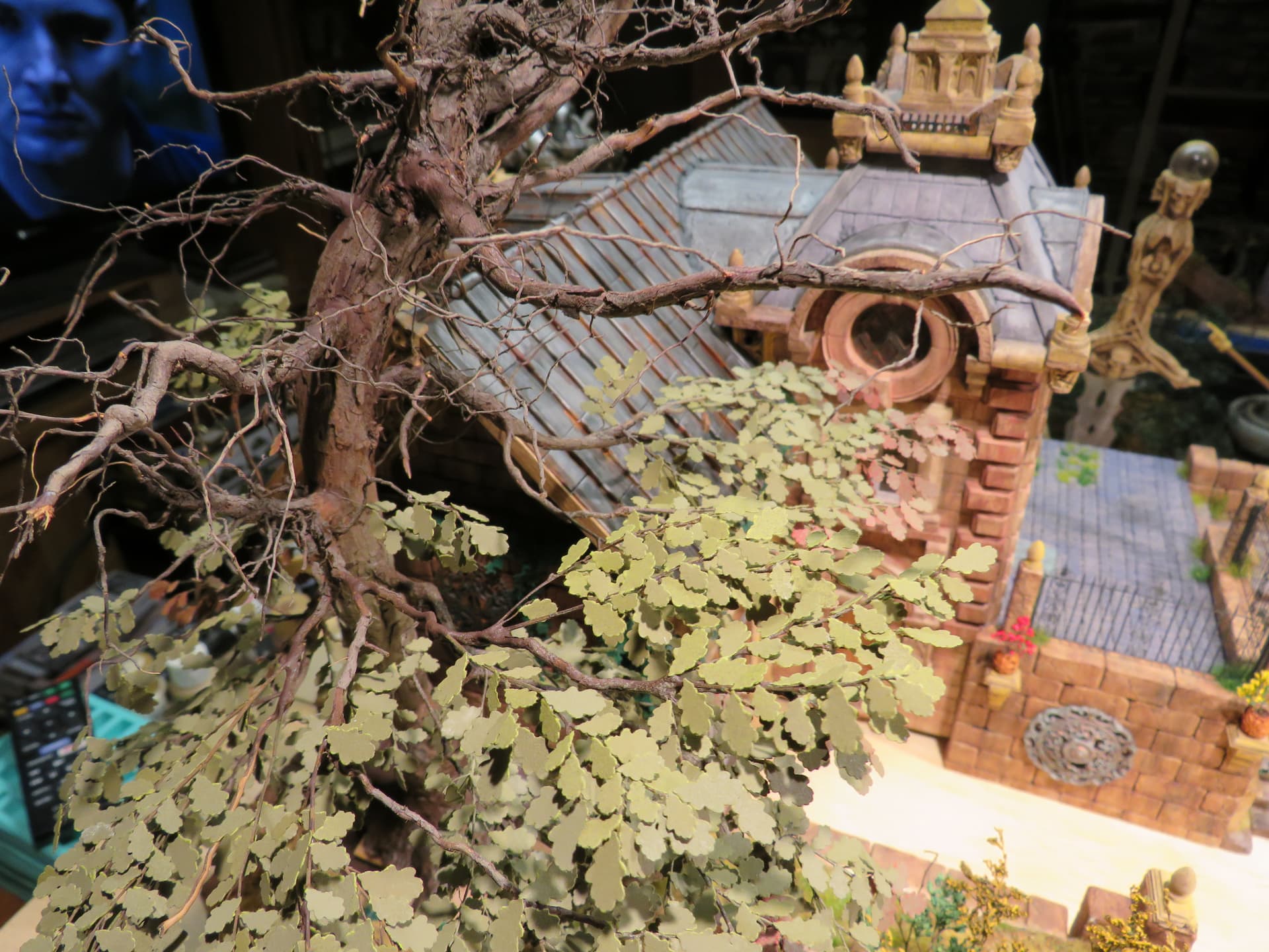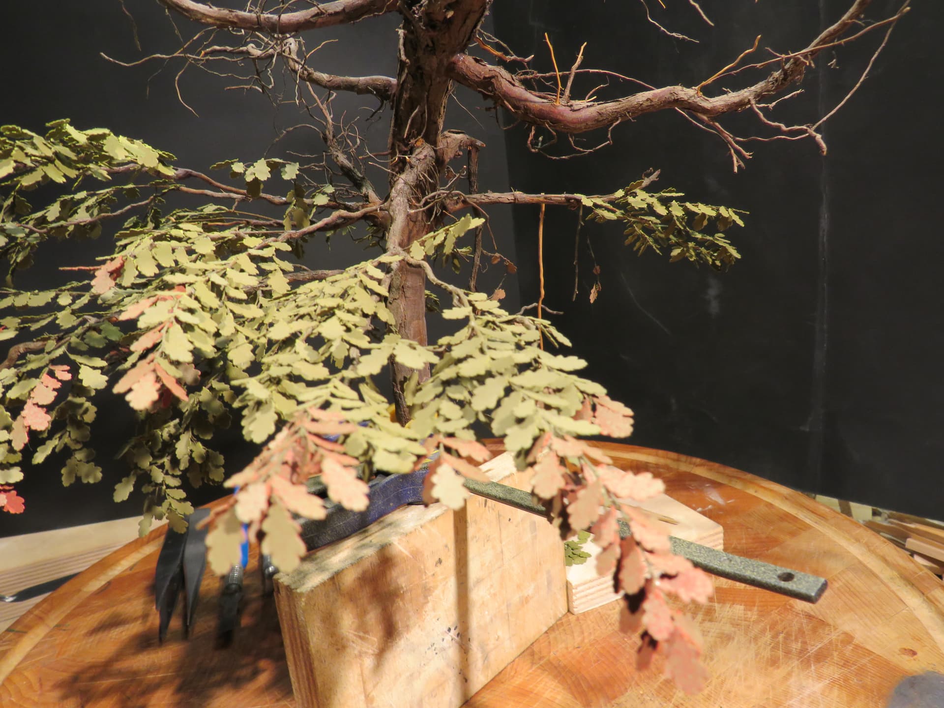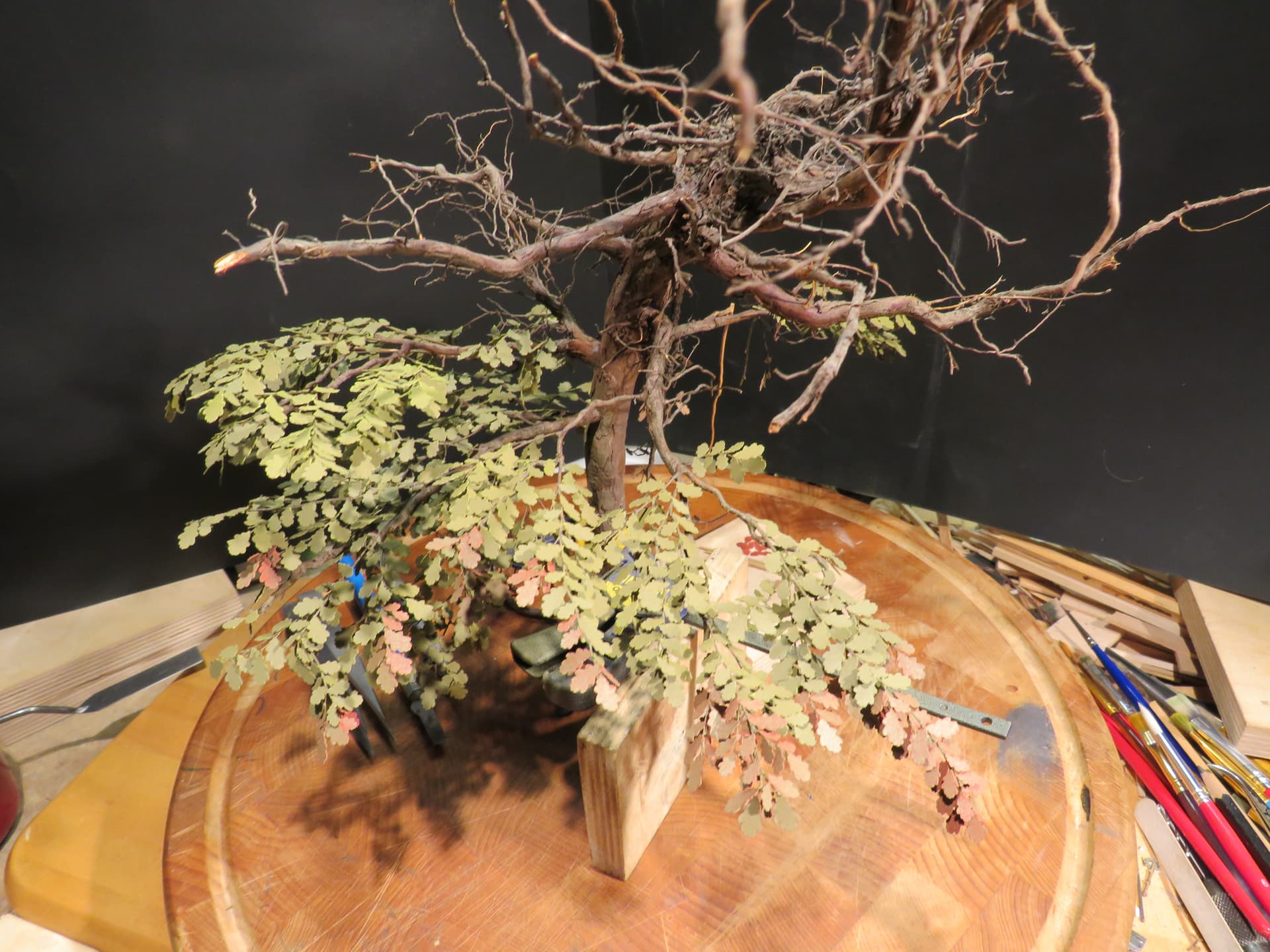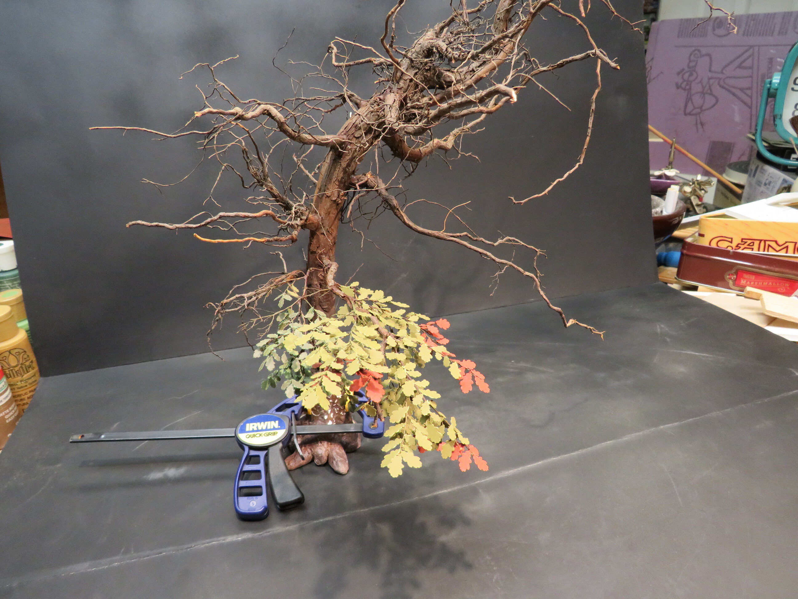 The detail and shape of this tree are terrific. The dedication to add those leaves in varying colors is inspiring. I think it will look incredible once they are all in place and the plan to put ivy creeping up will certainly tie it into the base nicely with the ivy already in place nearby.