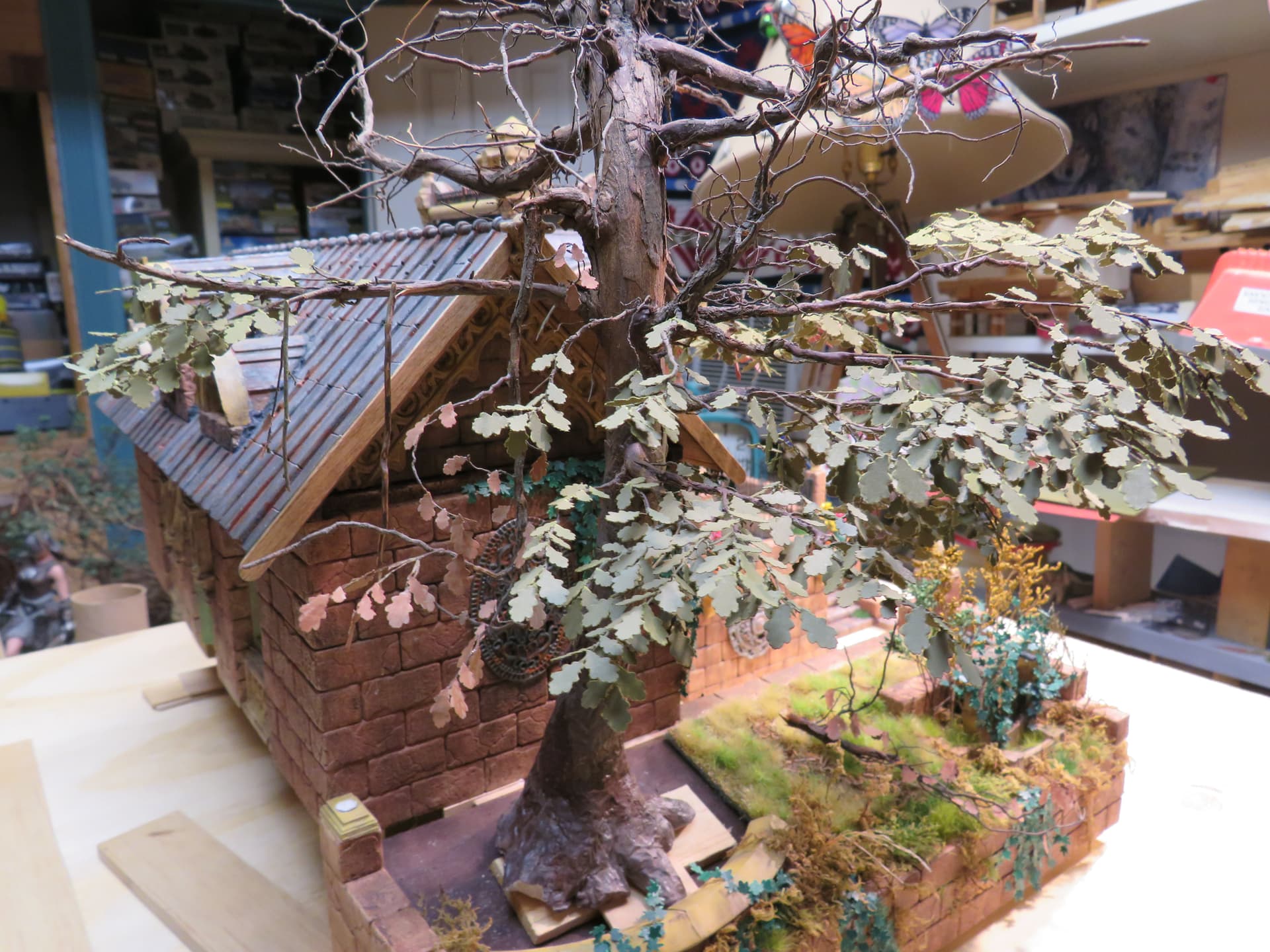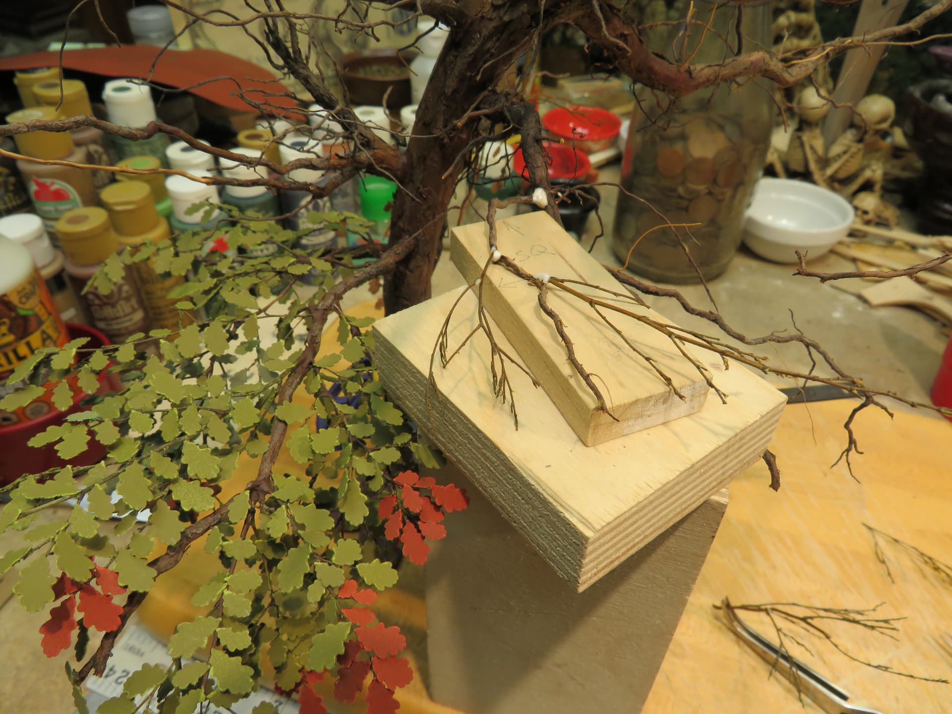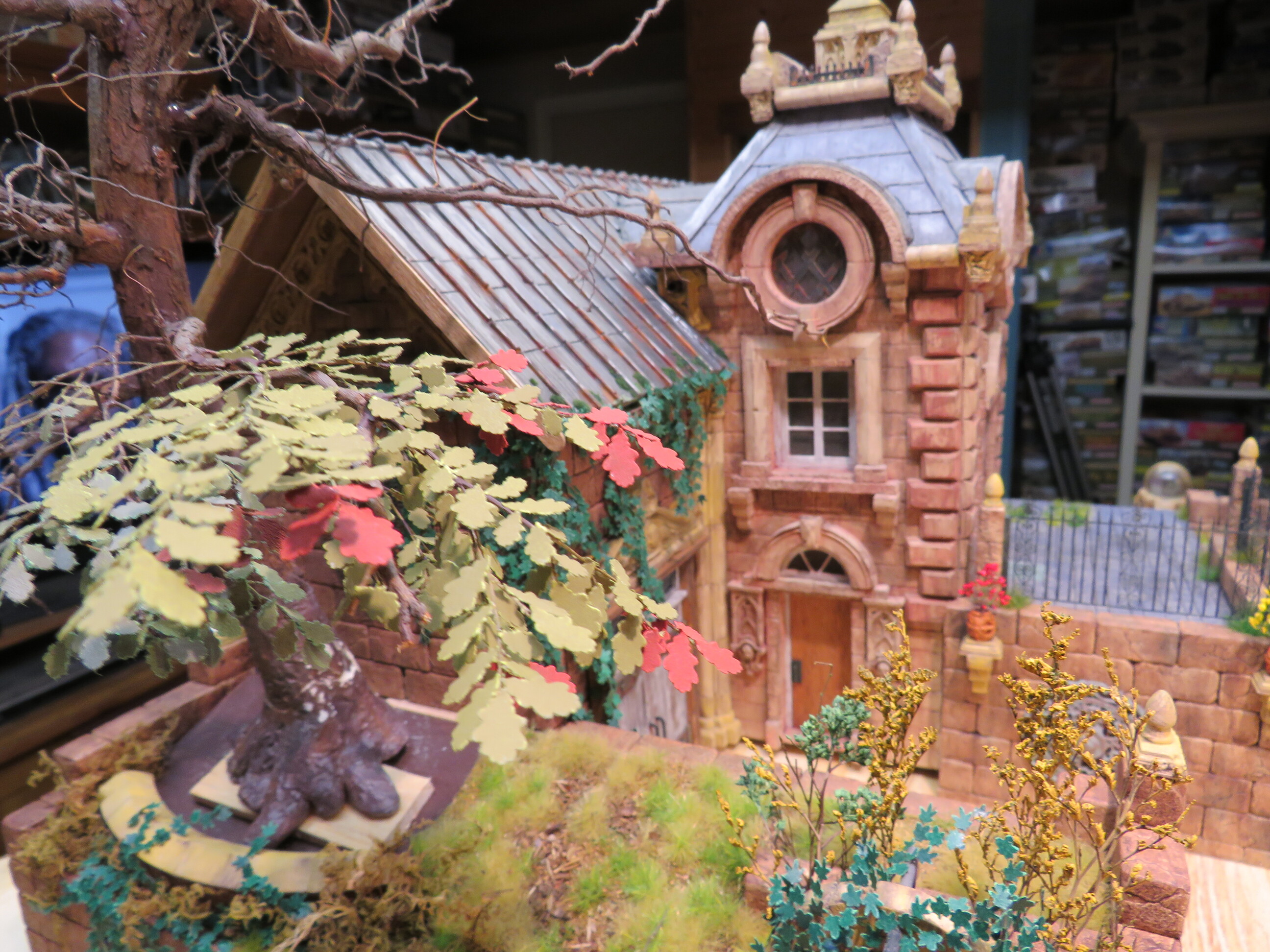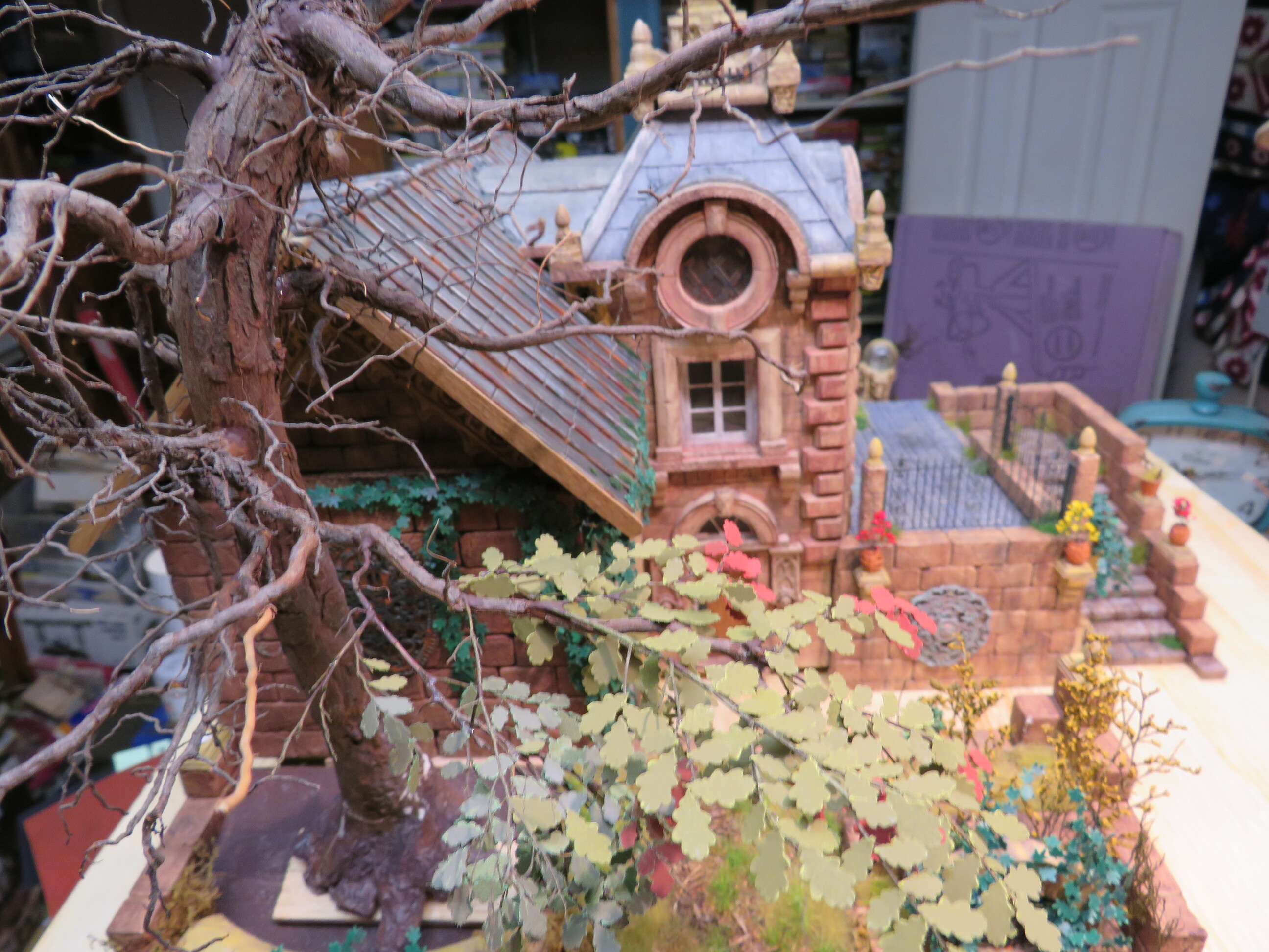 The detail and shape of this tree are terrific. The dedication to add those leaves in varying colors is inspiring. I think it will look incredible once they are all in place and the plan to put ivy creeping up will certainly tie it into the base nicely with the ivy already in place nearby.