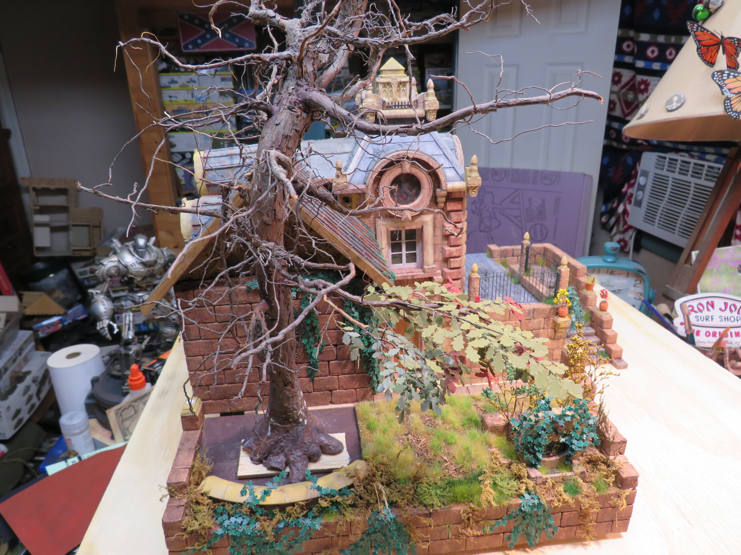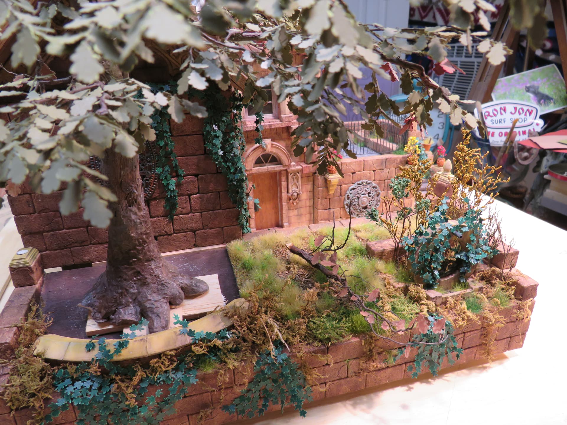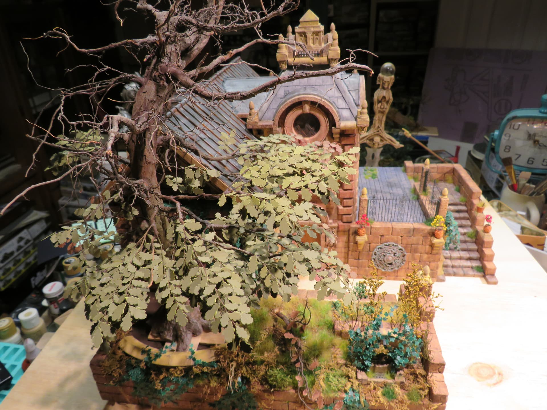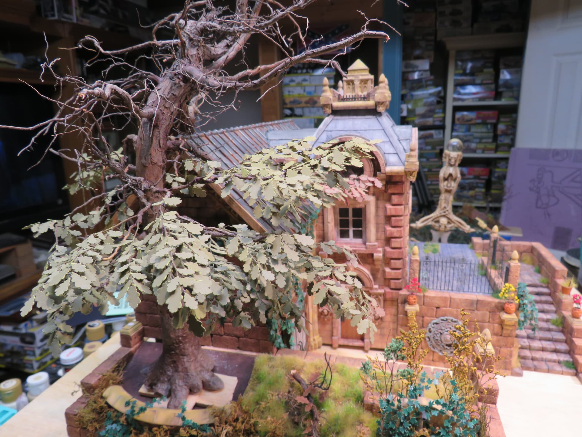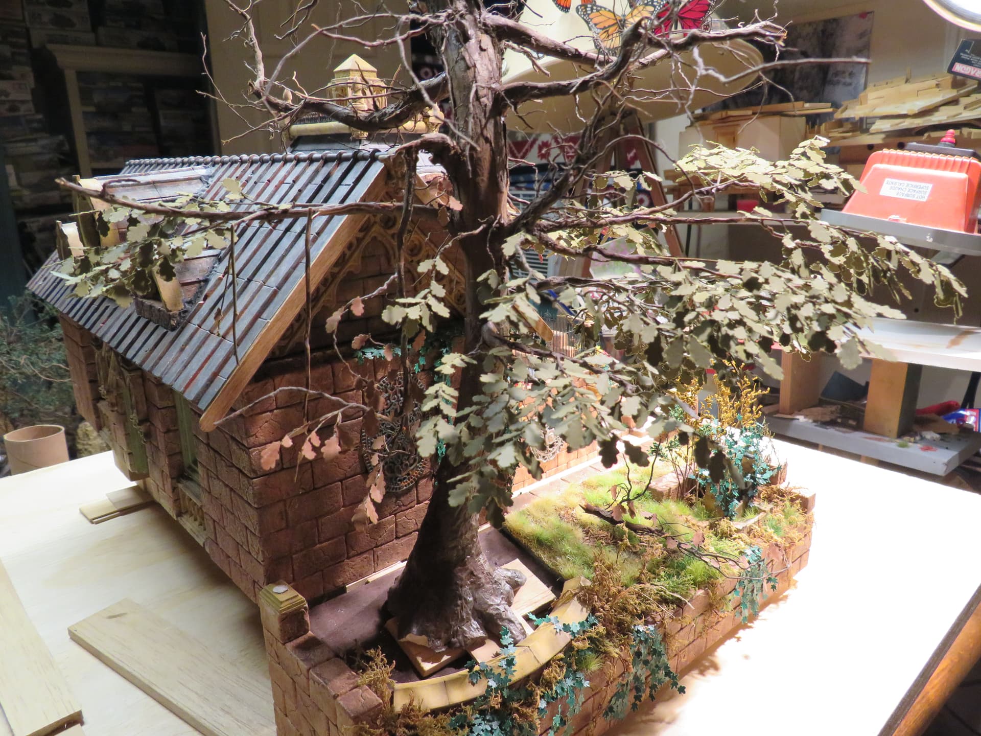 The detail and shape of this tree are terrific. The dedication to add those leaves in varying colors is inspiring. I think it will look incredible once they are all in place and the plan to put ivy creeping up will certainly tie it into the base nicely with the ivy already in place nearby.