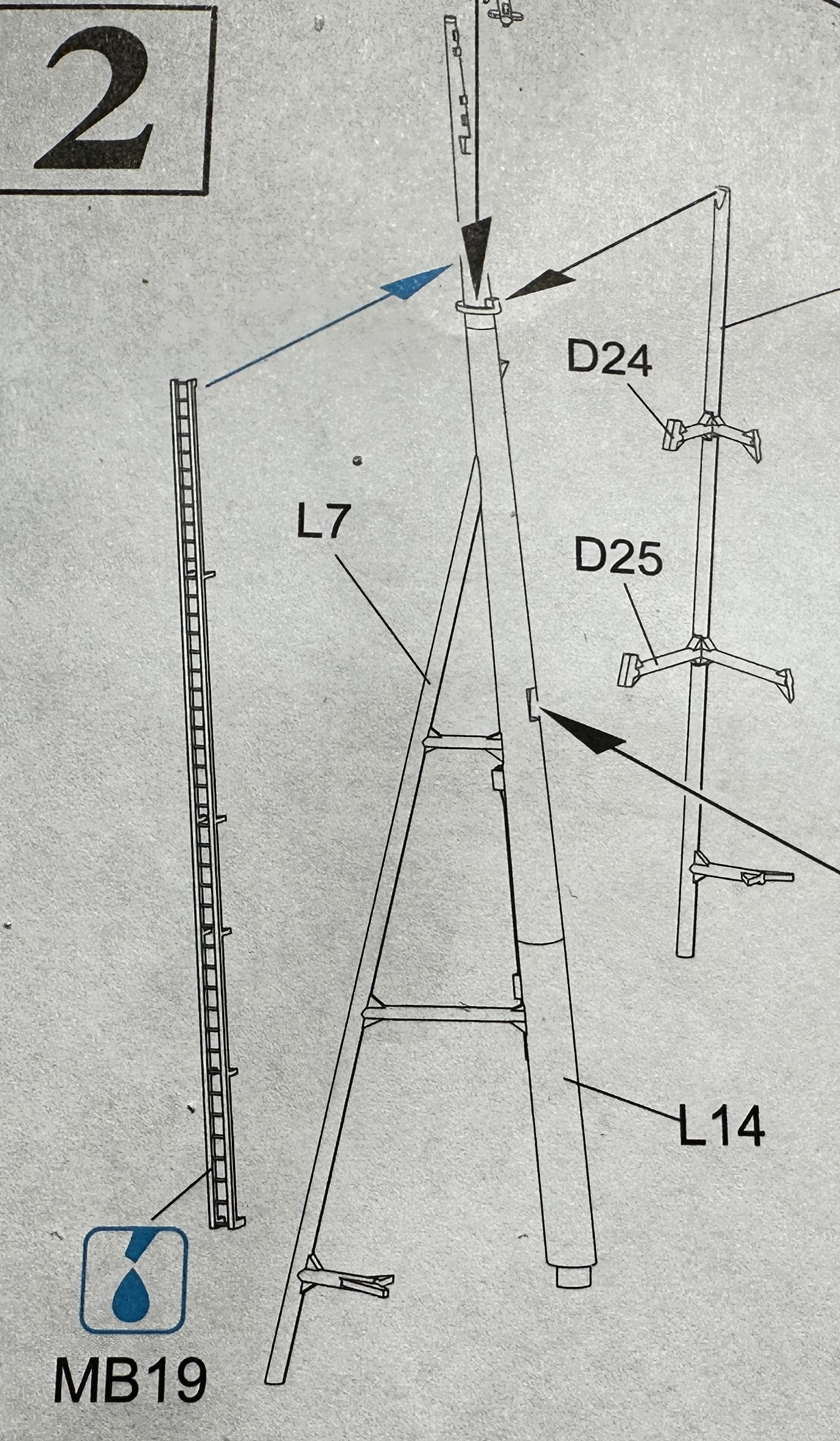 For any future builders, be advised that the marked supports need to face inwards towards the main mast. I built them facing out and that will not work when it comes time to install. Luckily I was able to readjust everything before the glue cured properly