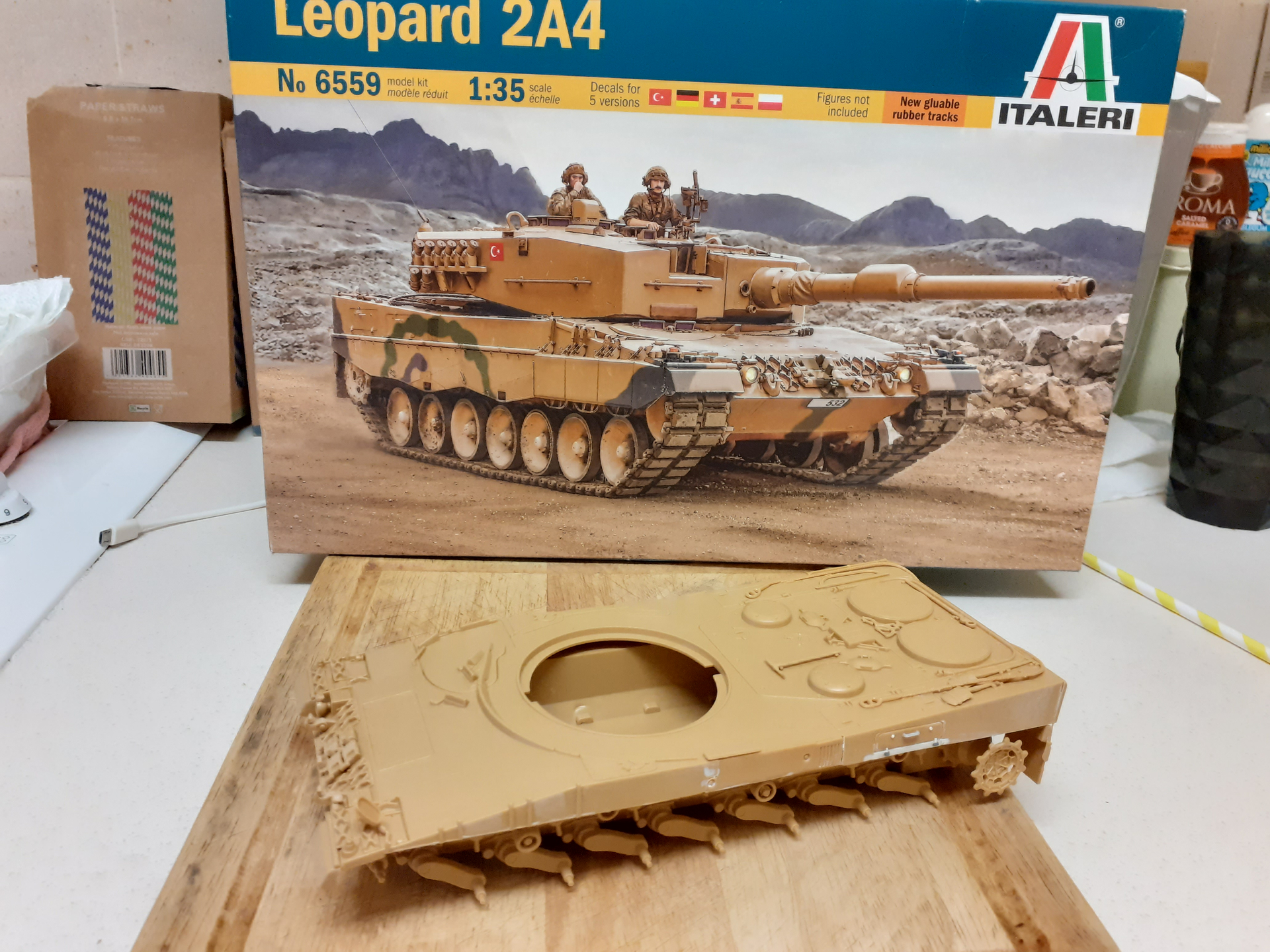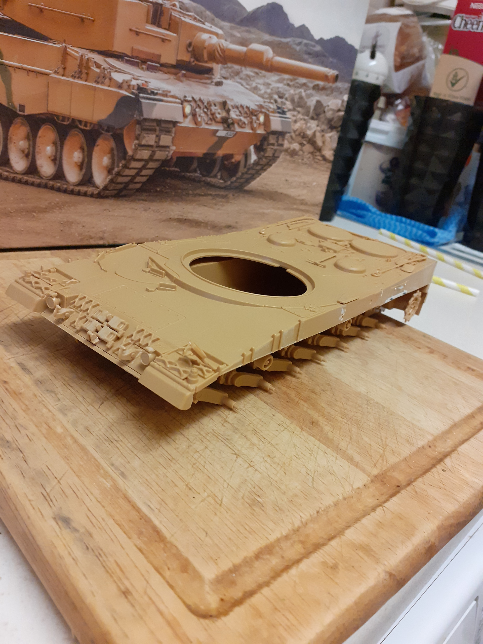 Hi guys.Bought this one a year or so ago as a flashback to my teens when it first appeared in the 1980s.I seem to remember having it in the old boxing with a Bundeswehr Gelboliv one emblazoned on box lid.I recall it being in a pukey green a bit like some of the Italeri Leopard 1s i have in my hoarders stash.I think what fired my imagination was getting Francois Verlindens Showcase series and seeing his version bedecked in nets and in a diorama where the tank is on a range with stacks of ammo boxes around and a Bundeswehr guy watching the big cat fire.Anyway this kit now contains many nations markings Spain,Turkey,Poland,Swiss,Bundeswehr.Im sure these nations versions arent whats in this old kit needing additions im pretty certain.The plastic is a icky brown colour and yes its not up to todays standards but im just putting her together as i would have done years ago.The sideskirts have parts of the rear hull side lockers in which isnt ideal as things dont line up great.I gently tried cutting these pieces off with a fine CMK razor saw blade but still managed to go off on a tangent and fudged a few bits.Nothing a bit of filler and plastic strip can hide a multitude of sins.The upper hull is very flexy when gluing to lower hull so i run a few shims of plastic under turret opening and along the upper hull to let the lower hull sit on a more stable gluing area.Im not sure if the kit is accurate as a 2A4 as i feel it has a mixture of features like the uparmoured sideskirts.