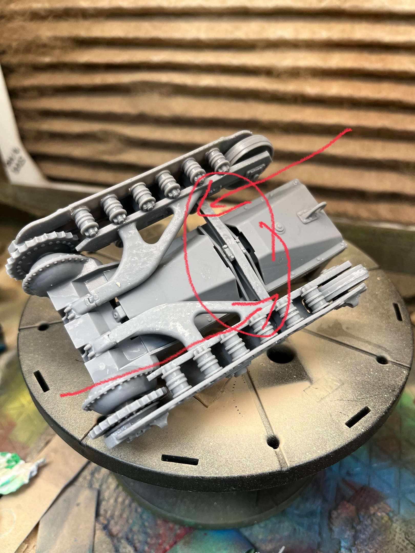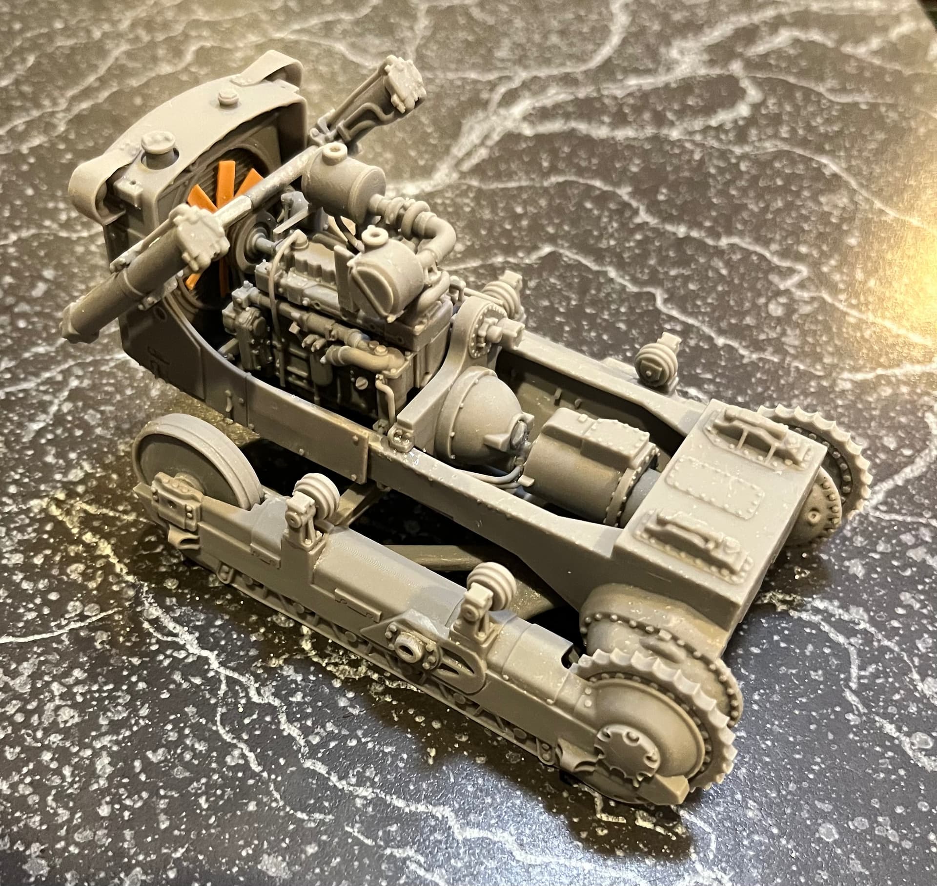 The journey continues. The tracks came together well, although the final o/s track pin is proving to be a bit challenging. I’ll finish the underside of the cab floor in an Olive Drab, but spray sand color “where they could get to it.” Once I’ve furnished the driver’s area I’ll be opening the last box of the project- the HL armoured cab.