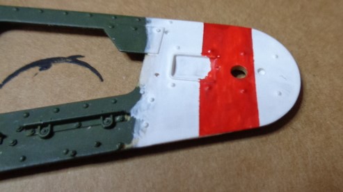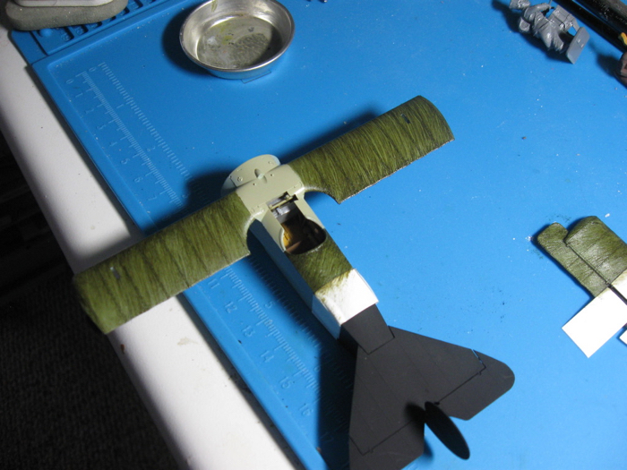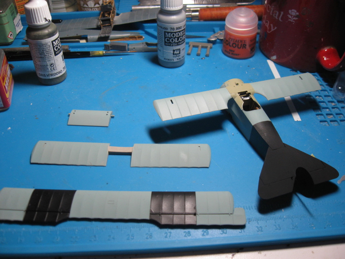 So on top of the light blue goes the green oil paint streaks. I decided if I did that then masked for the black the oil paint would get pulled off. So I masked and painted the black. Countermasking is proving difficult on the fuselage, but I think I need to do that, or I’ll get the green oils on the black…