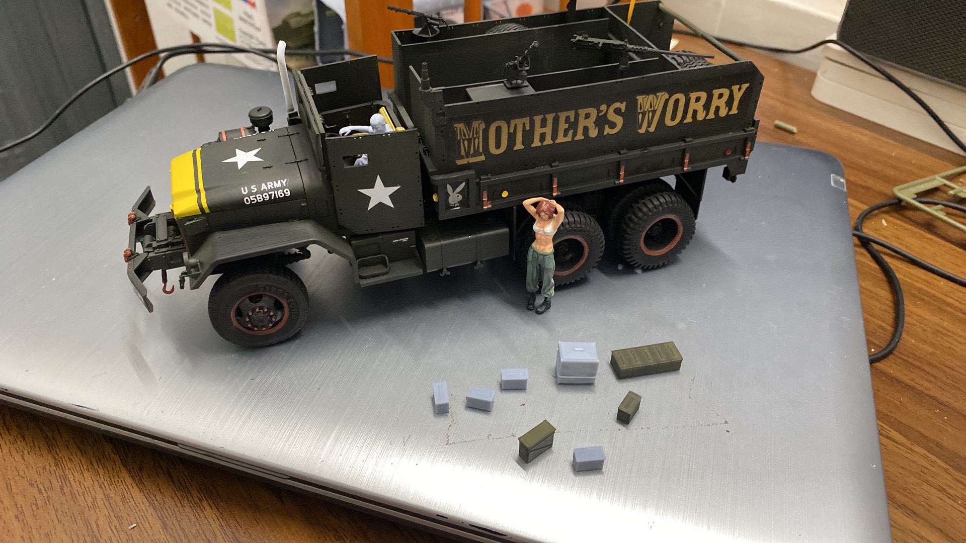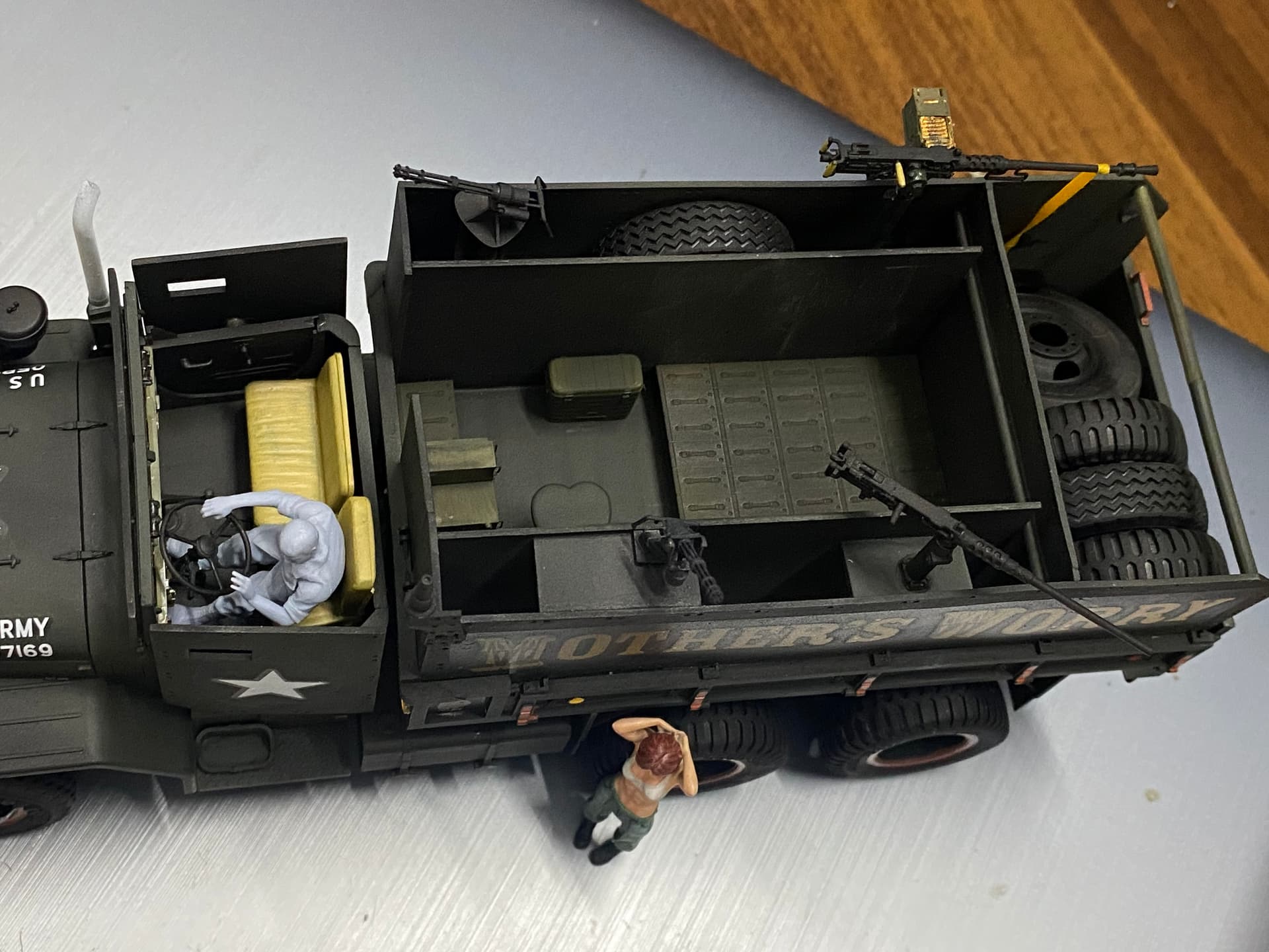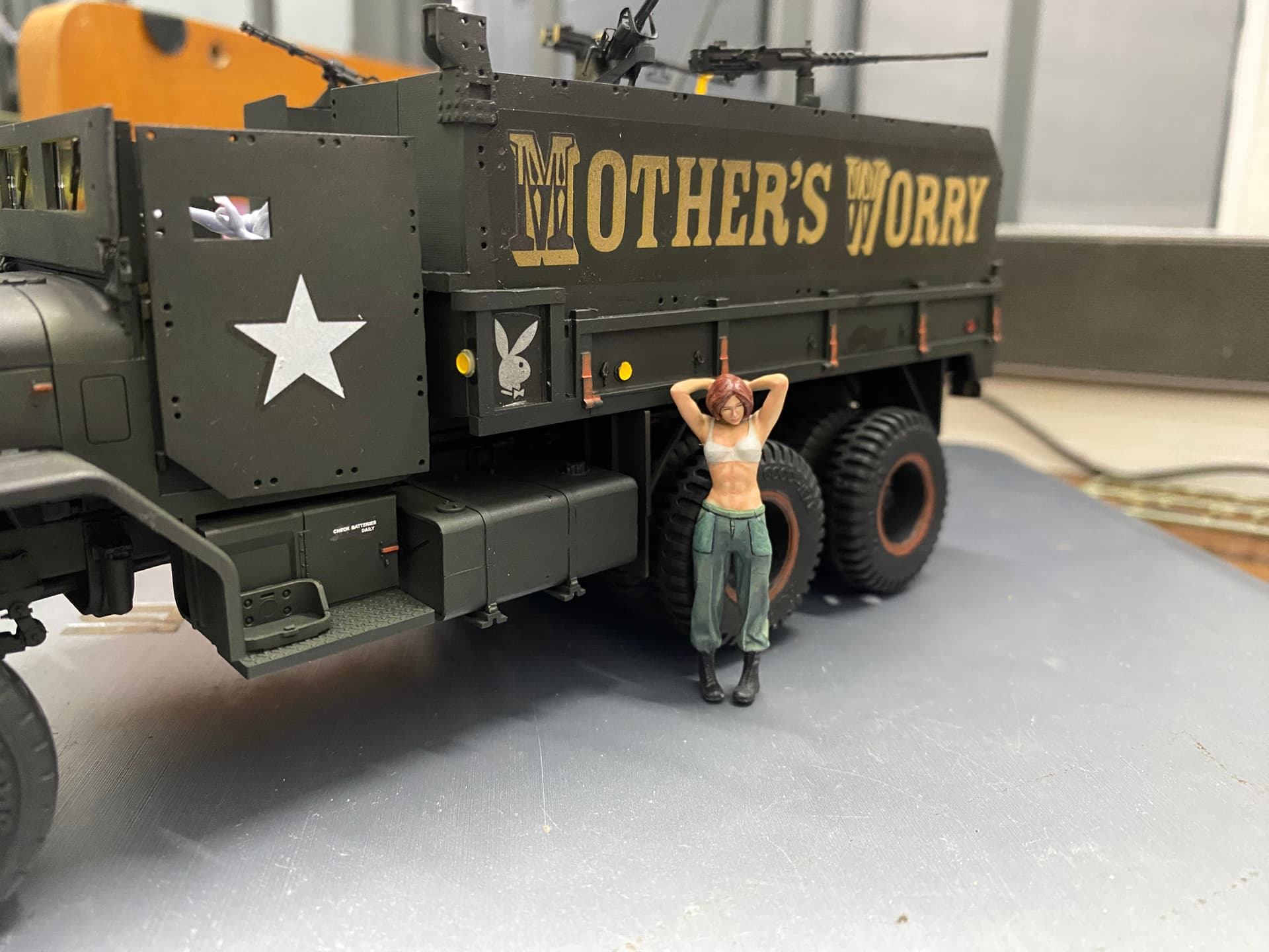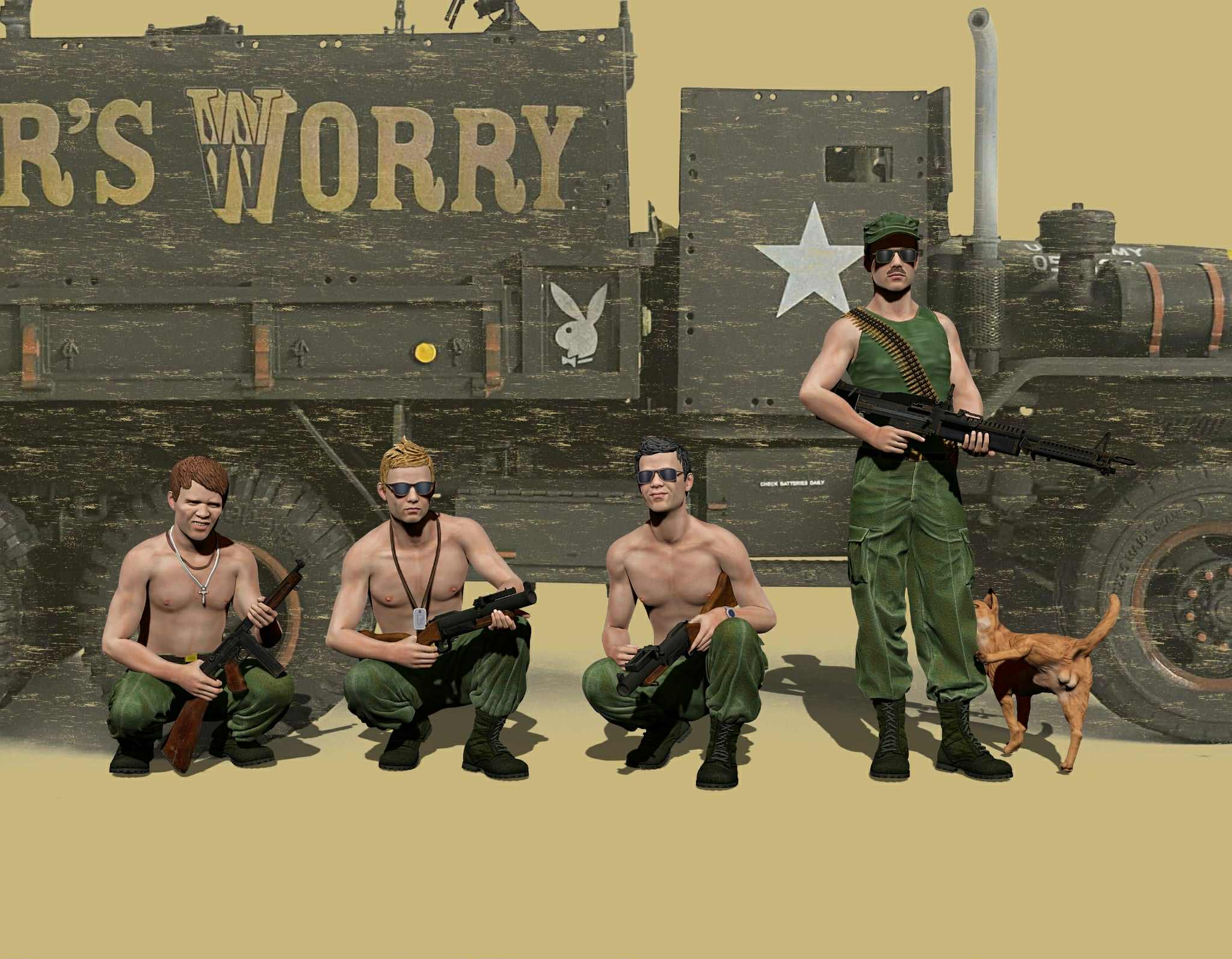 For US Army guntruckers as depicted with “Mother’s Worry”, either US Army baseball-style caps or boonie caps would be more correct, at least for the M60 gunner.