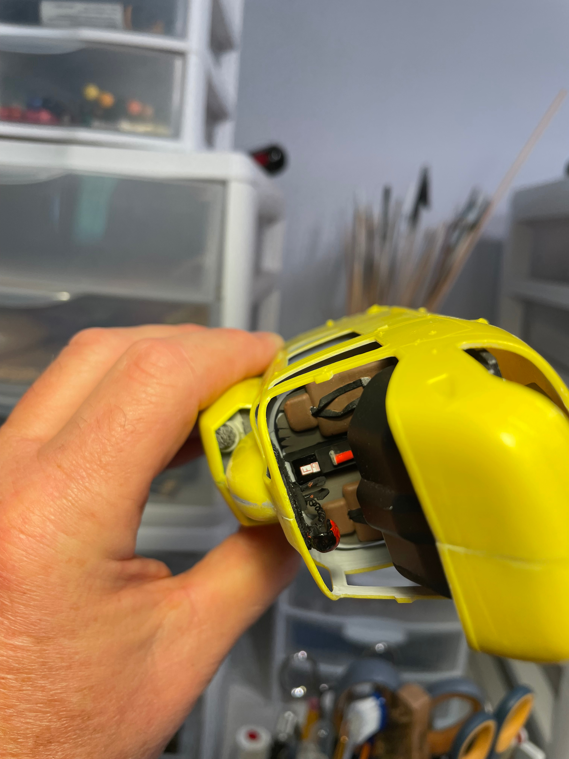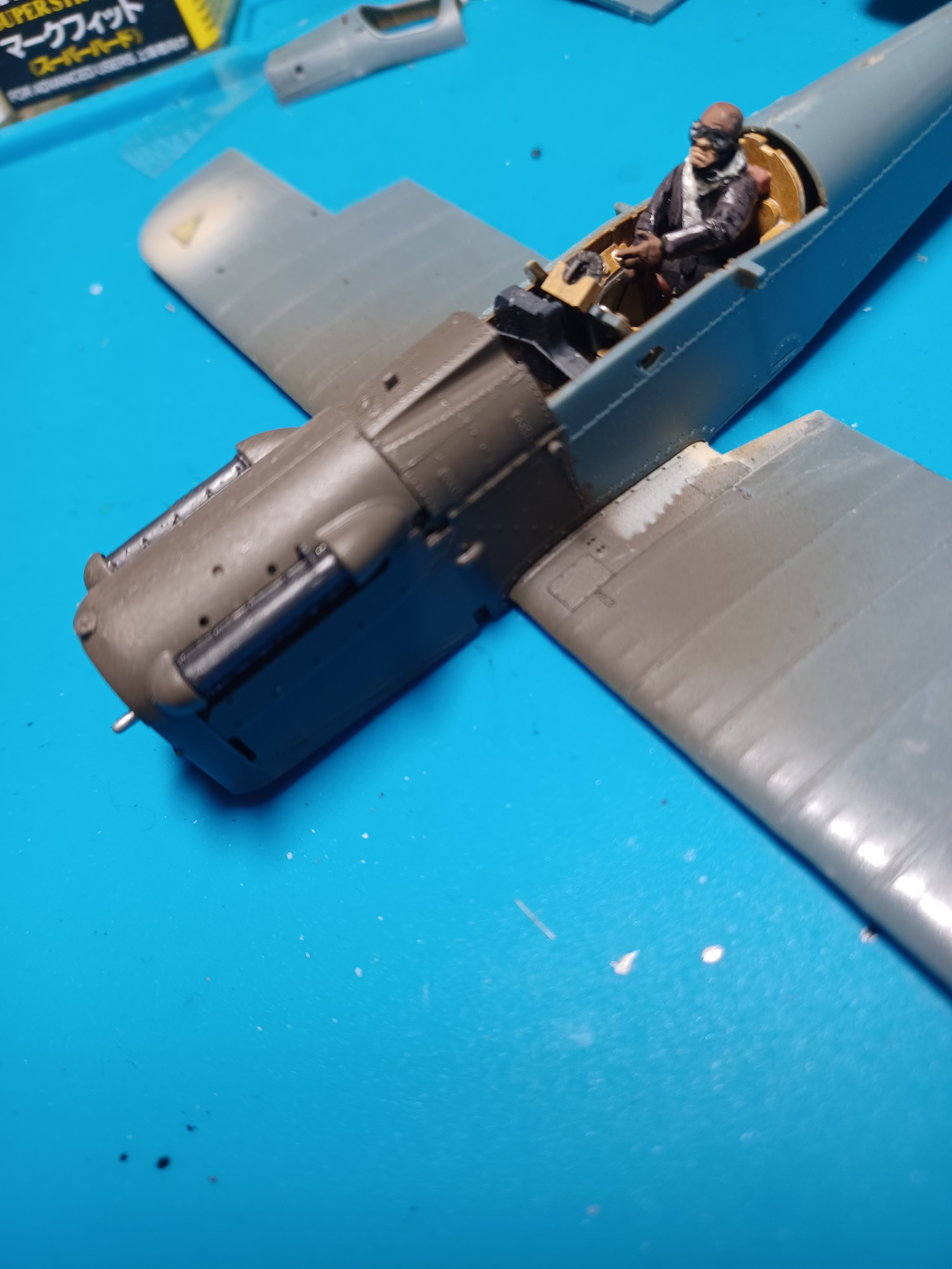 The pilot I scratch-built from some 28mm wargaming figures and a little apoxie sculpt. For a guy who will be no more visible than he will be I’m fairly pleased. Too bad none of that beautiful cockpit detail will be visible.