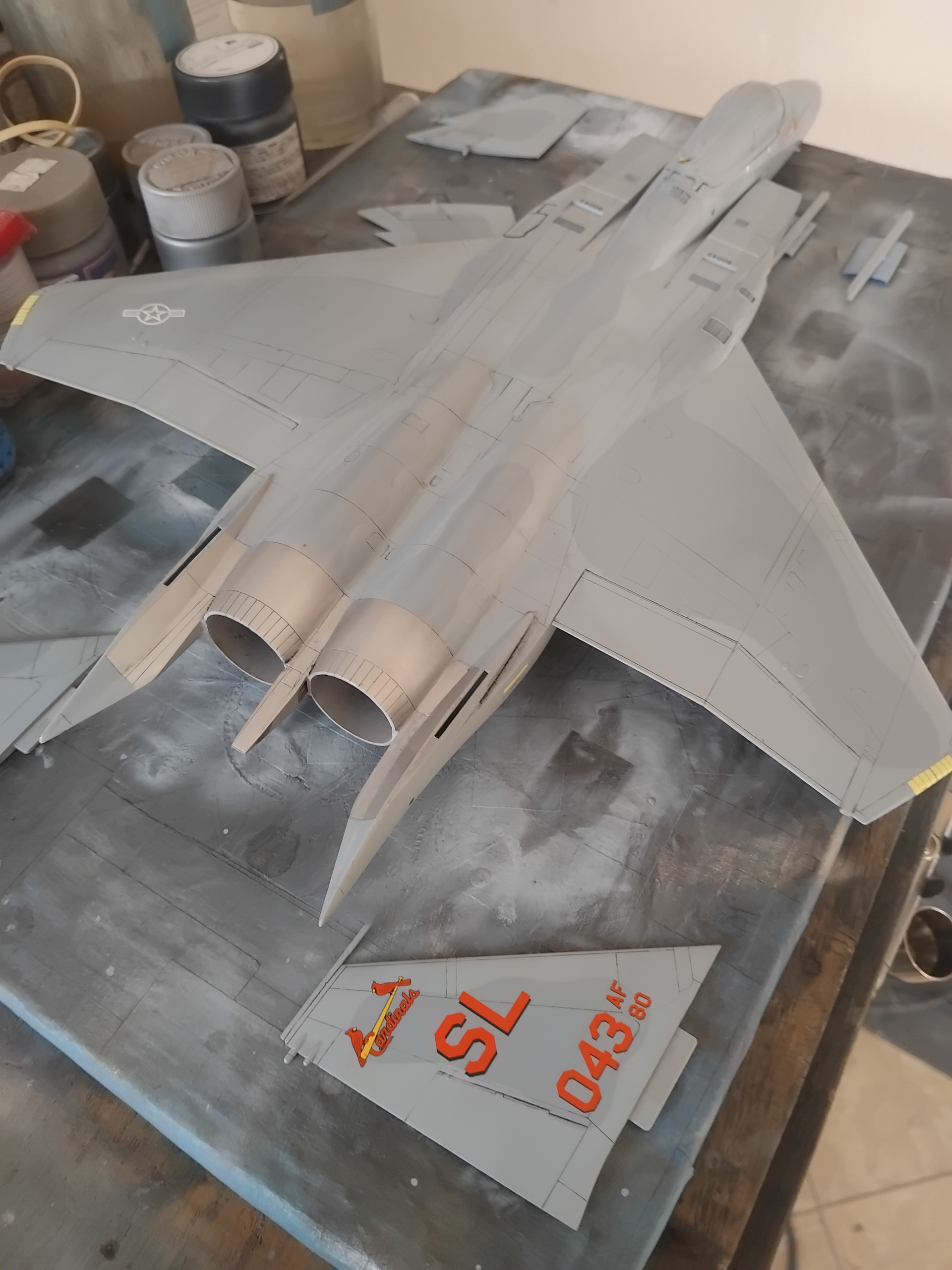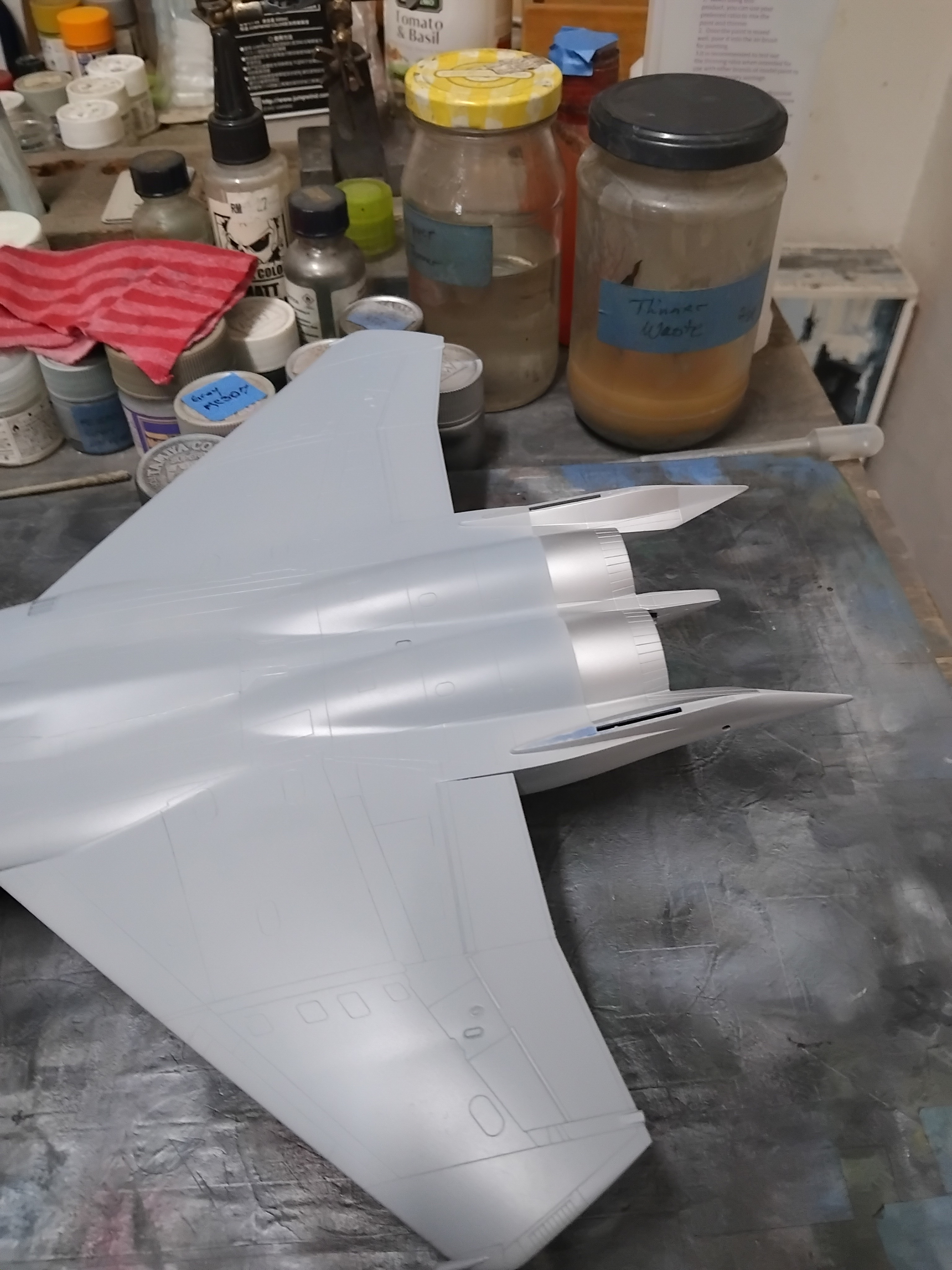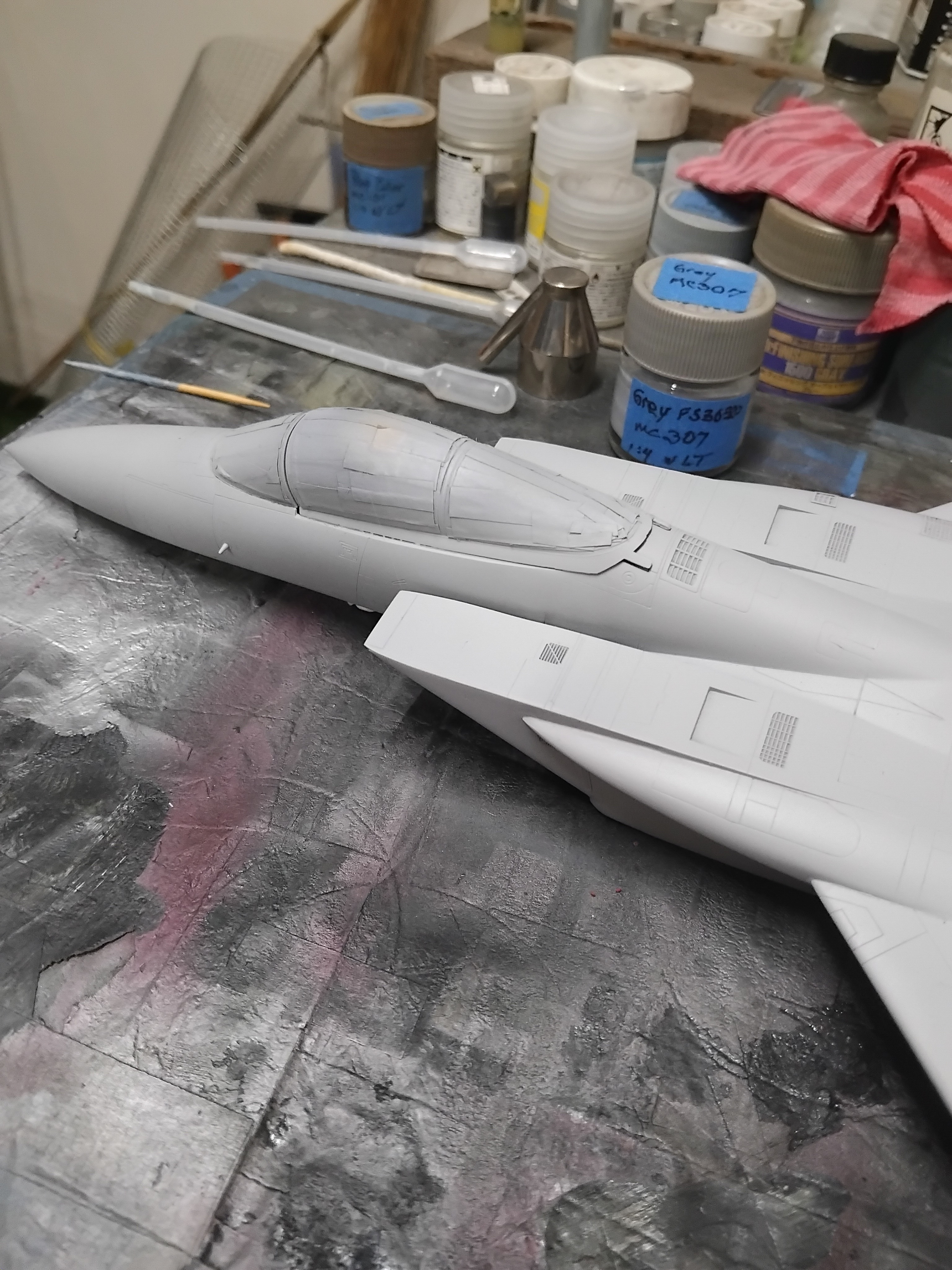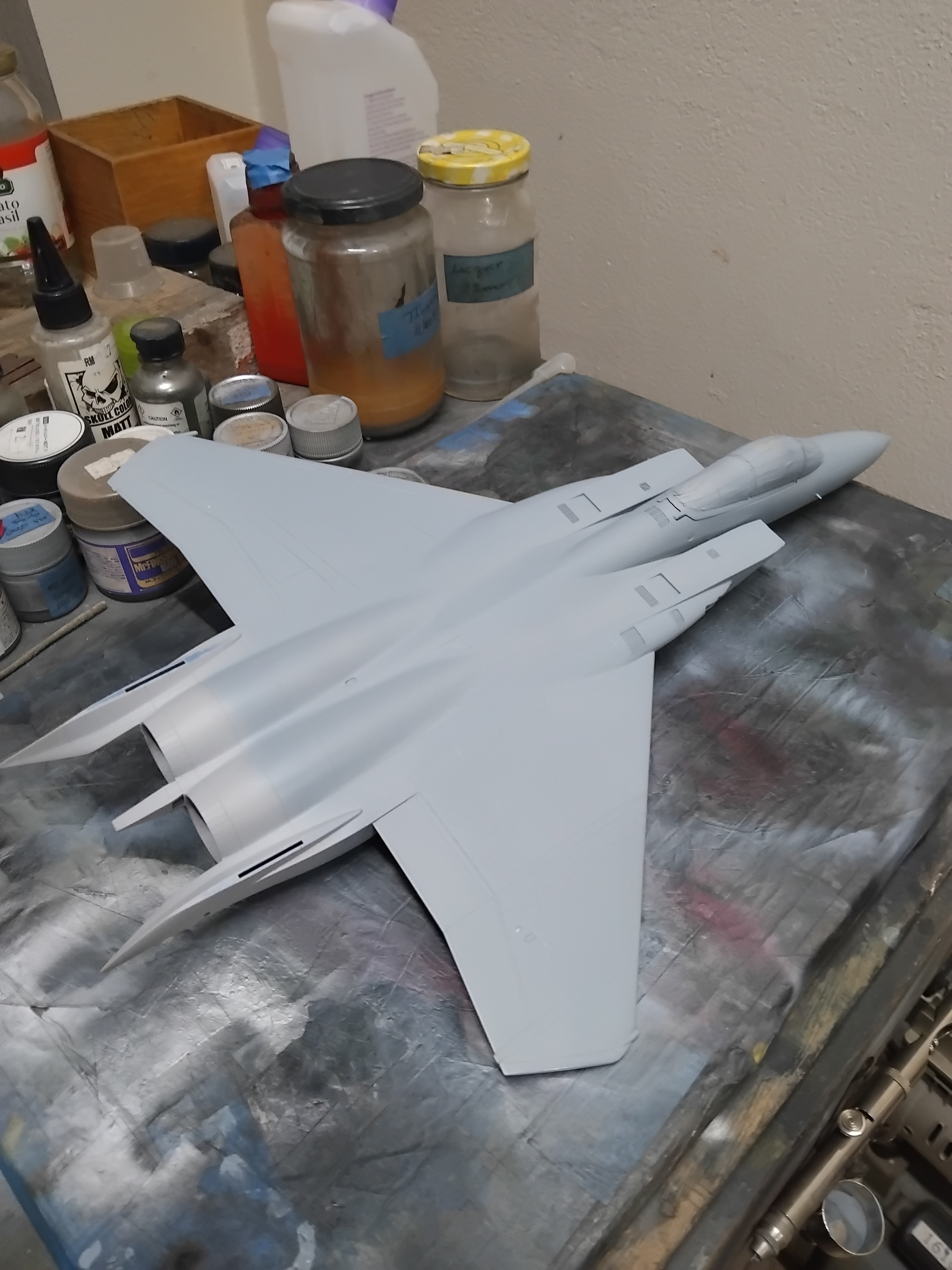 In my last update, I had made the repairs and prepped for painting of the F-15C. In preparation for the camo scheme, the airframe was given a coat of Mr. Surfacer 1500 (MS 1500) grey, diluted 1:4 with MLT.