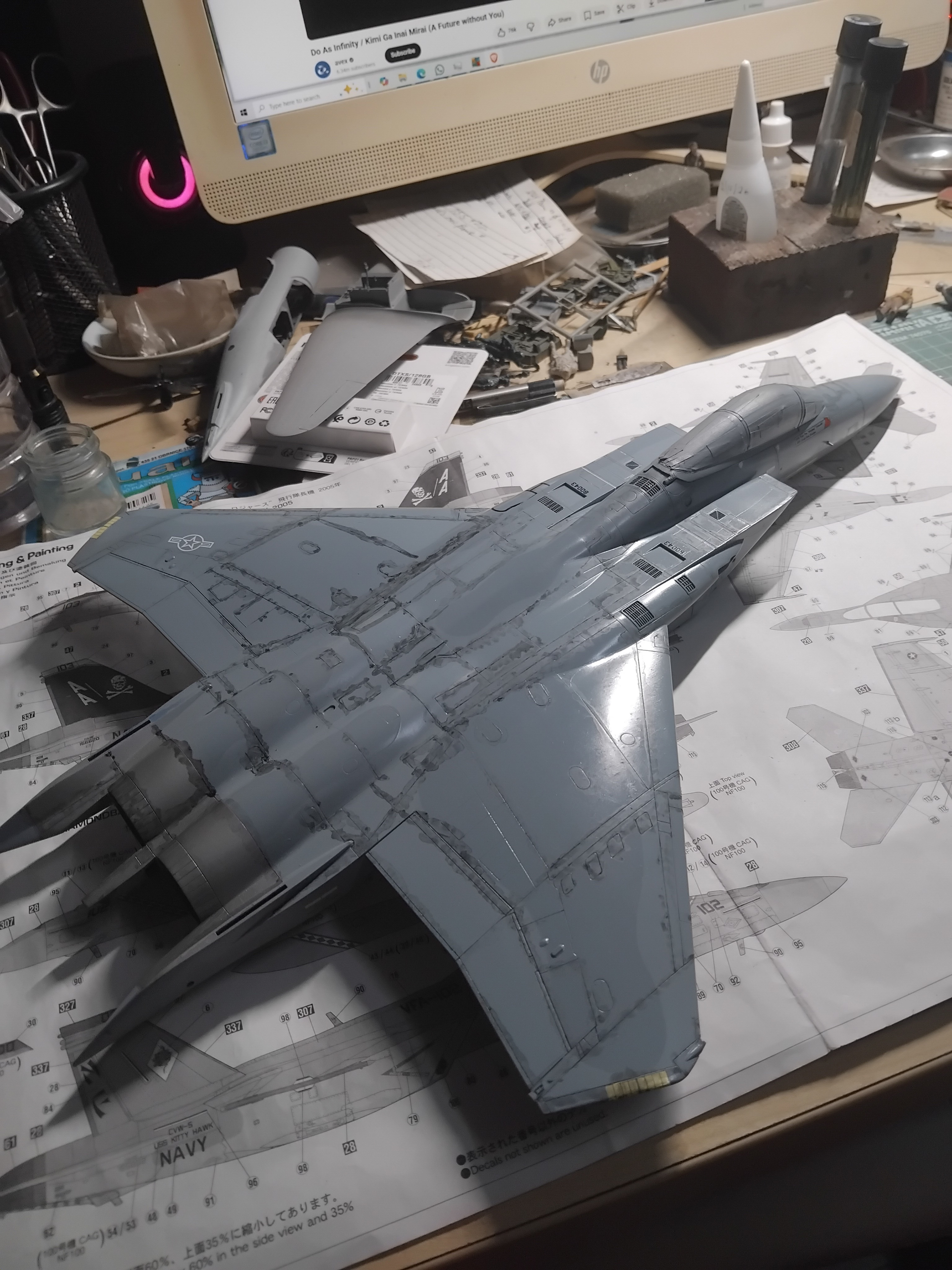 The metal areas were then masked off so that the camo scheme could be applied. For this, I had purchased some masks some time back on a whim, because I wanted to try them out. This was not a complete waste of money, however, they didn’t fit, they were overly thick and were not the easy as pie masks they were touted as. During this process I neglected to take any photos, mostly due to just wanting to move through and past the process. I started the process by giving the entire bird a coat of Mr. Color (MC) 307 grey as the darker grey base color. Again, the masks were the inverse of what they ideally should have been. The masks were applied, and the lighter grey MC 308 was then painted. Since this was a comemorative paint scheme preshading and pre-weathering was really not applied. With the masks removed there were notable raised demarkation lines that needed to be delt with via 2000 grit sanding sponges. Any areas that were distorted were repainted, and then the bird was given a clear coat of Future (due to shipping delays that didn’t allow for the Mr. Color clear being in the stash). This didn’t go as well as hoped, and required lots of rework. Finally, things got to the point where decals could be applied, and then a clear coat (shipment came in!), followed with a wash.