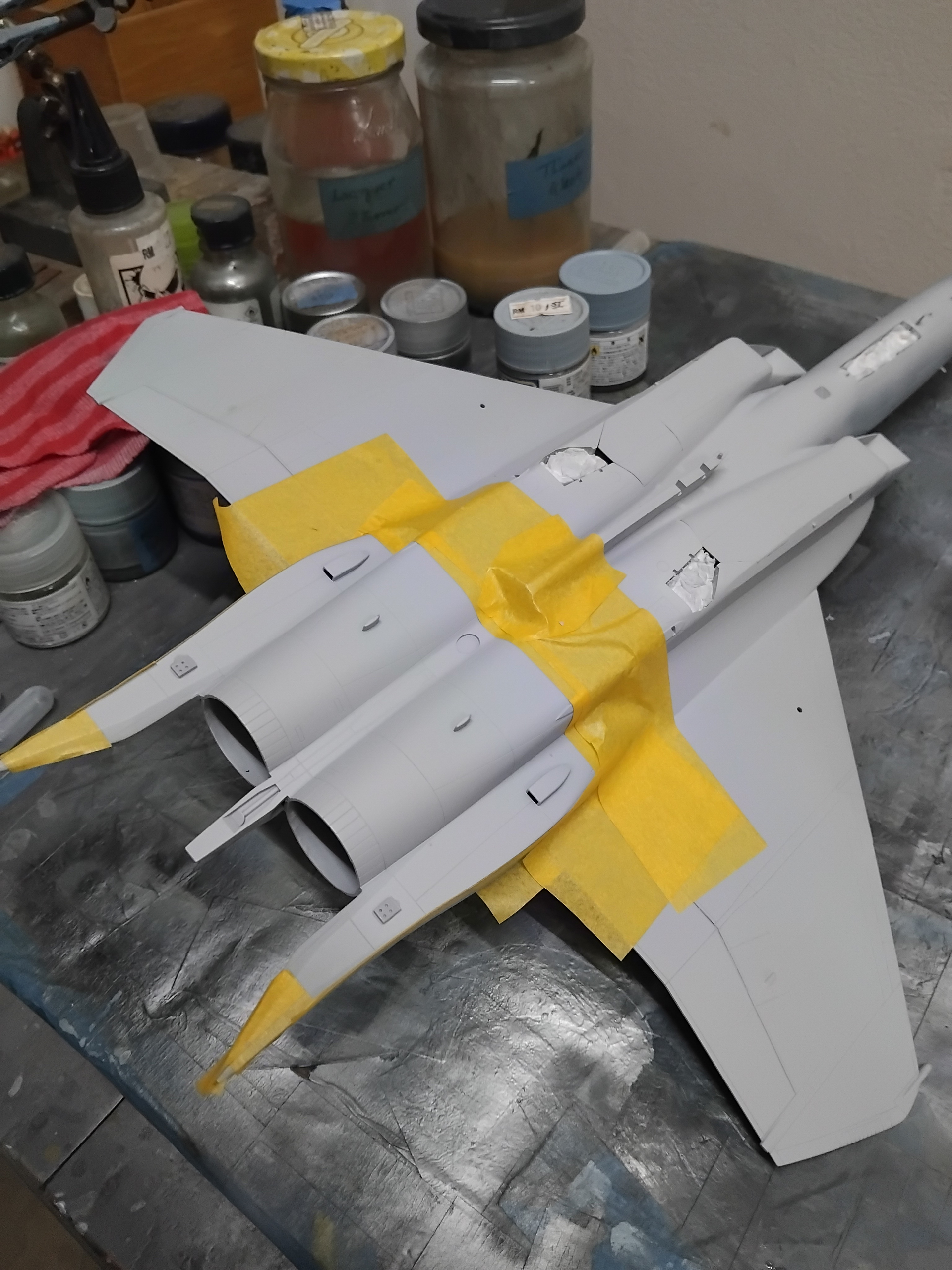 Following the primer, seams were double checked and found to be acceptable. The aft areas that are left in natural metal were then masked off and painted up.