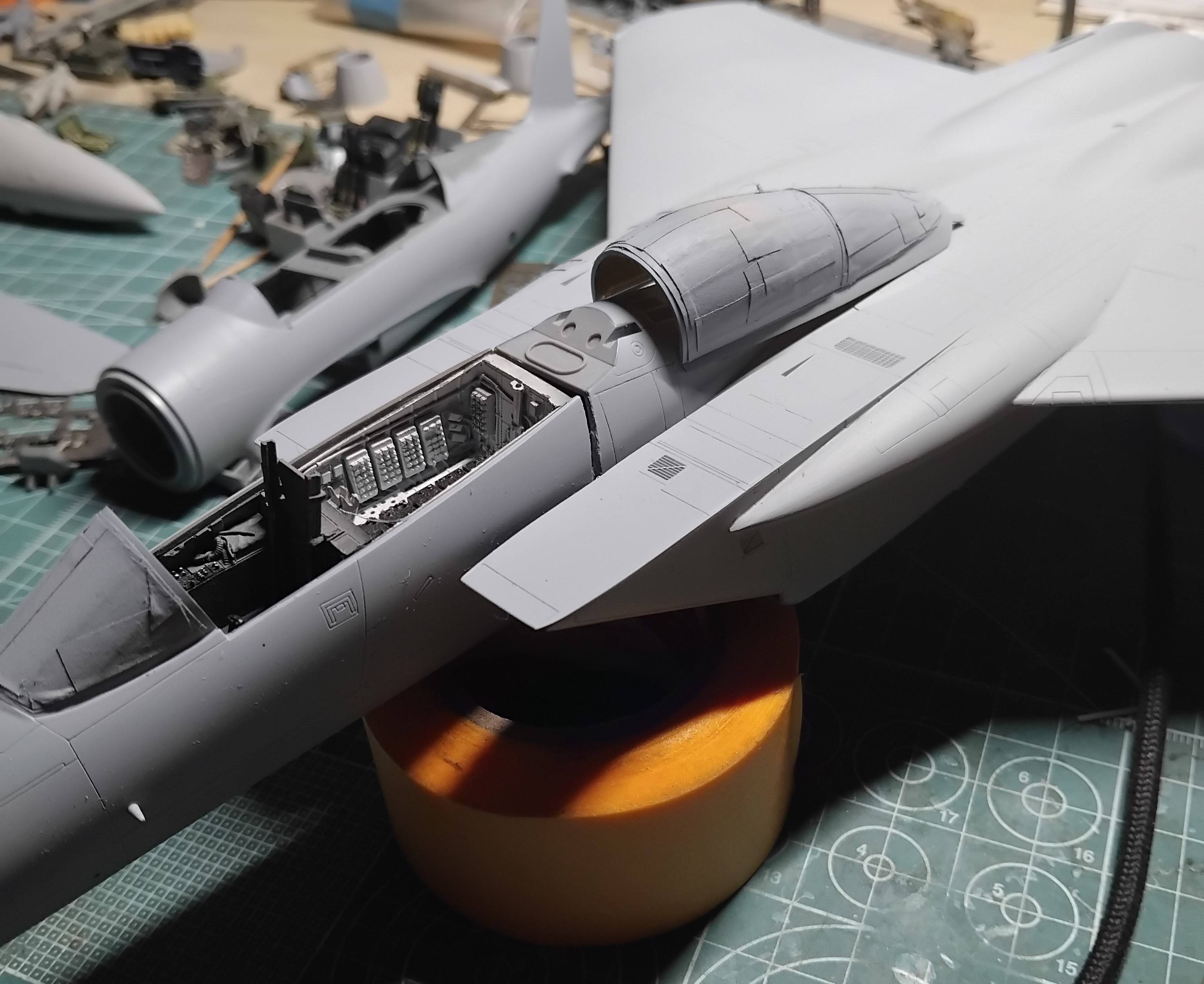 As some of you may recall, I was diligently working on Hasegawa’s 1/48 F-15C in the Hangar Queen campaign last year. That came to an end when a loose thread on my shorts connected with a probe on the F-15’s nose while I was heading out the door. The F-15 decided to take an unauthorized flight, and with no power, dove into the tile floor. The results were less than desirable.