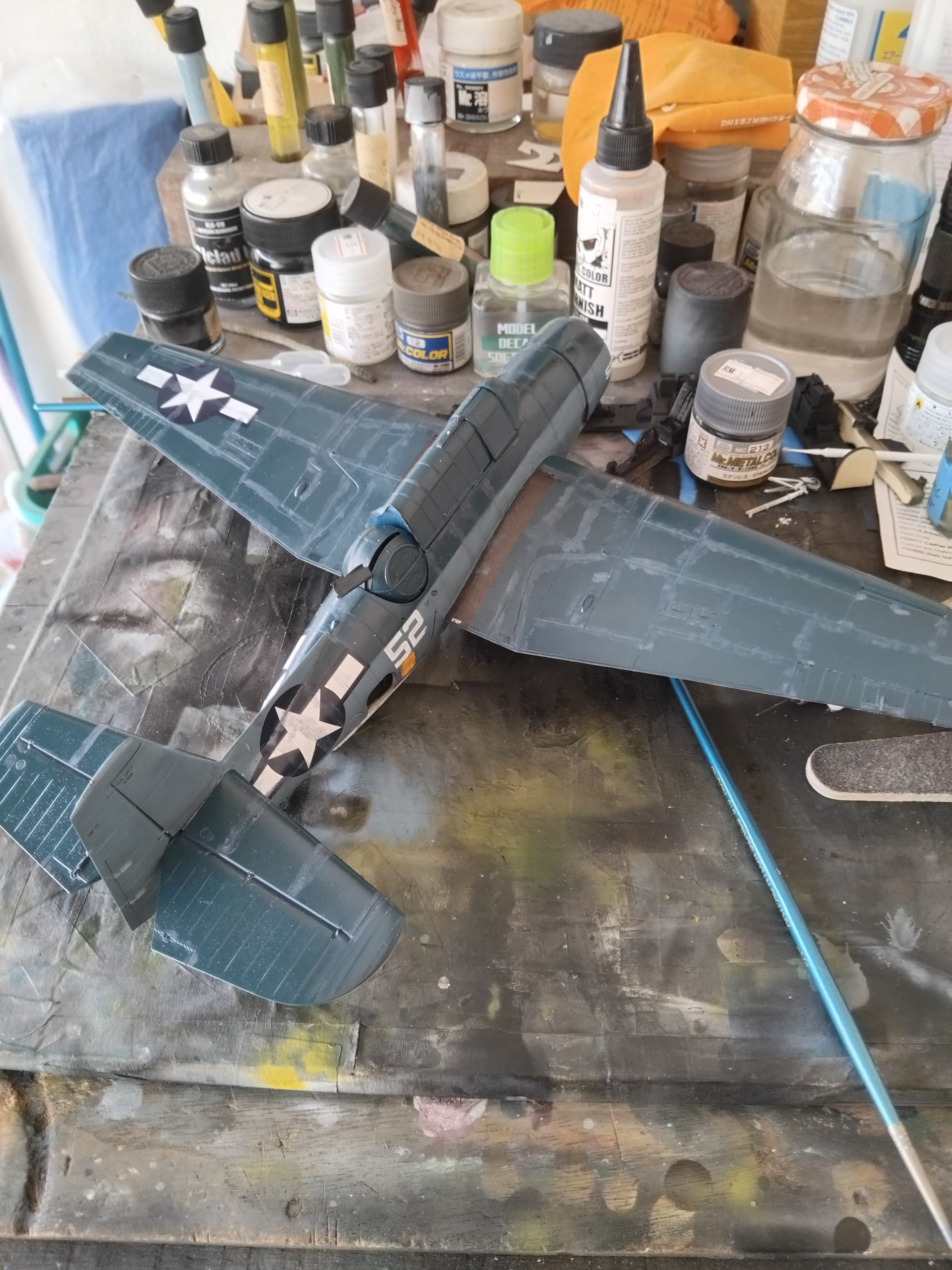 After my clear coats dried, I went about sanding down some of the areas where build up had occurred. I used a 3400 grit sanding pad, and then backed off to 4000 and 6000. The results were mixed, as was the decaling process. Per the decal sheet, they were printed/screened in 1996, armed with 28 year old decals didn’t give me a warm and fuzzy! So, I ventured into the decal dungeon and my spare decal bags. Needless to say, the pickings were slim. AM made very nice decals, however, the only thing that really goes bad on a plastic model kit are the decals. In my experience any decals over 15 years are suspect. I did test some out, and they seemed to be fine. Starting on the underside, the insignia looked pretty good, retaining it’s form, not shattering, overall, pretty good. When I did the top wing decal, I noticed that the white ink had gone bad, with odd translucence being observed. I pulled it and replaced the remaining insignia with Techmod generic 40" star and bar decals, these looked much better. I used 36" star and bar for the fuselage, which looked too big, but research showed that they were big. I had to use the numbers from the original decal set, and for the most part they look pretty ok, in my mind any translucence was chalked up to normal wear and tear on the bird. Most of the stencils went down without a problem, the one exception being the tail code area, where one did break up. Still all in all, it looked the part! I sealed everything with some clear lacquer and got the oils out.