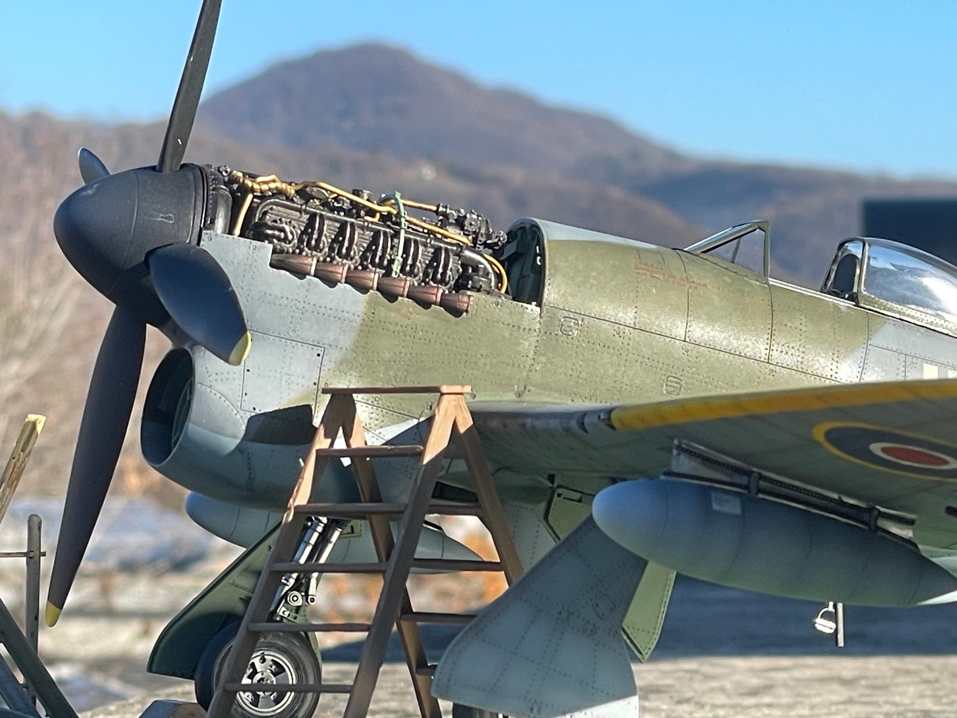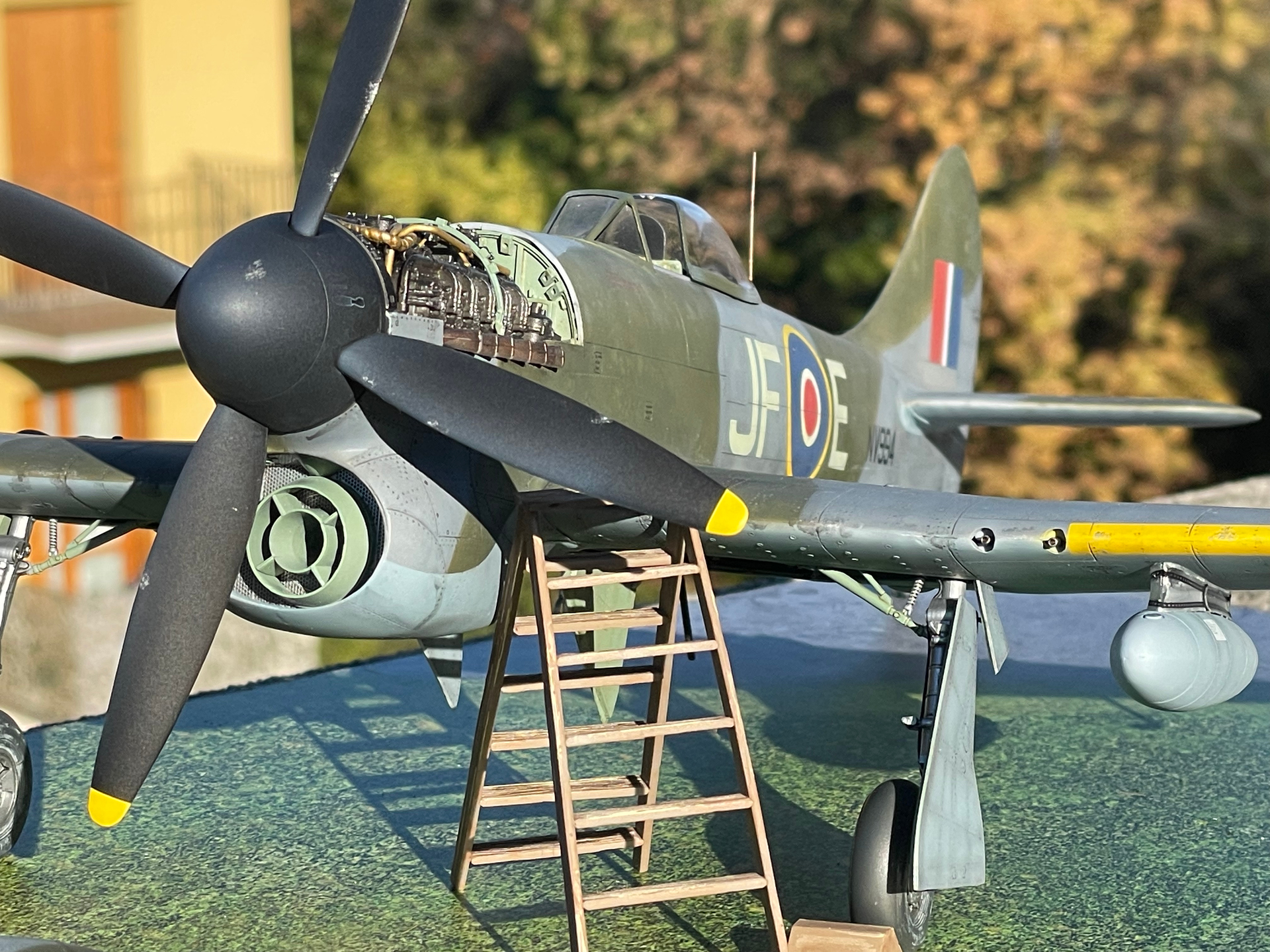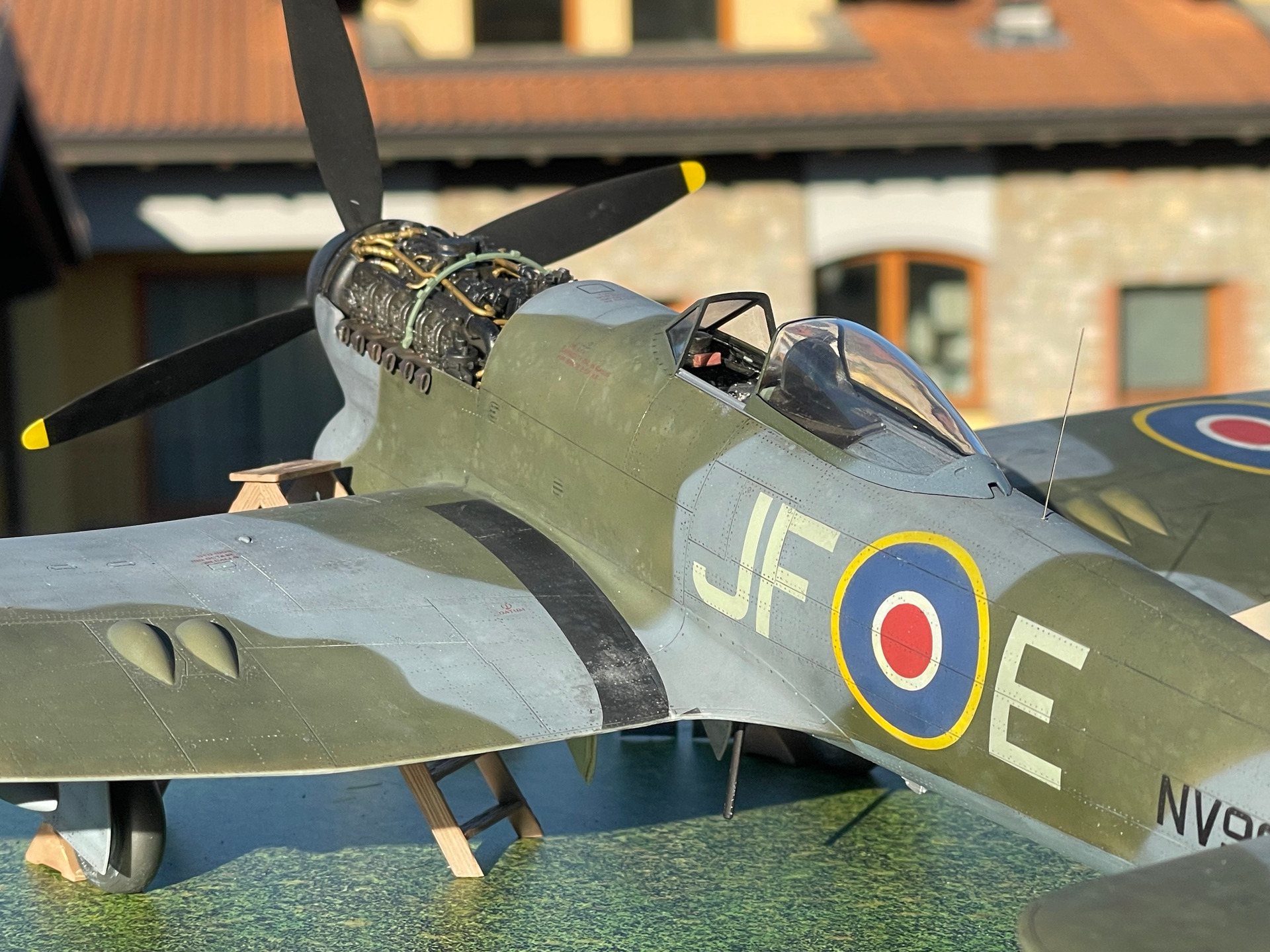 The kit (SPECIAL HOBBY TEMPEST MK.V HI-TECH 2) is, I must say, a demanding one. It includes countless resin parts that replace the corresponding injected pieces, and requires quite a bit of surgery—removing molded sections (upper and side engine cowlings, as well as the firewall between engine and propeller assembly) and careful finishing to allow the engine to be displayed.