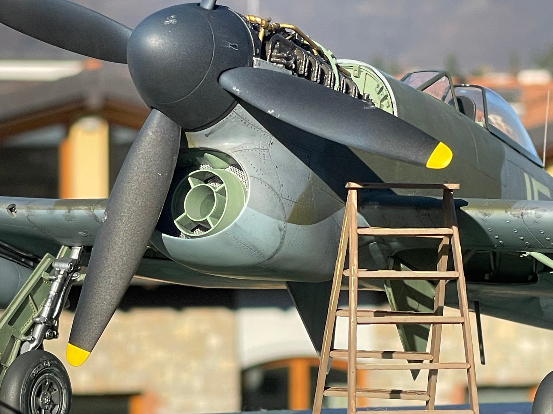 Finally, I chose to depict the aircraft as if it were undergoing a maintenance break on the engine, with the cowlings removed and resting on a nearby fence.