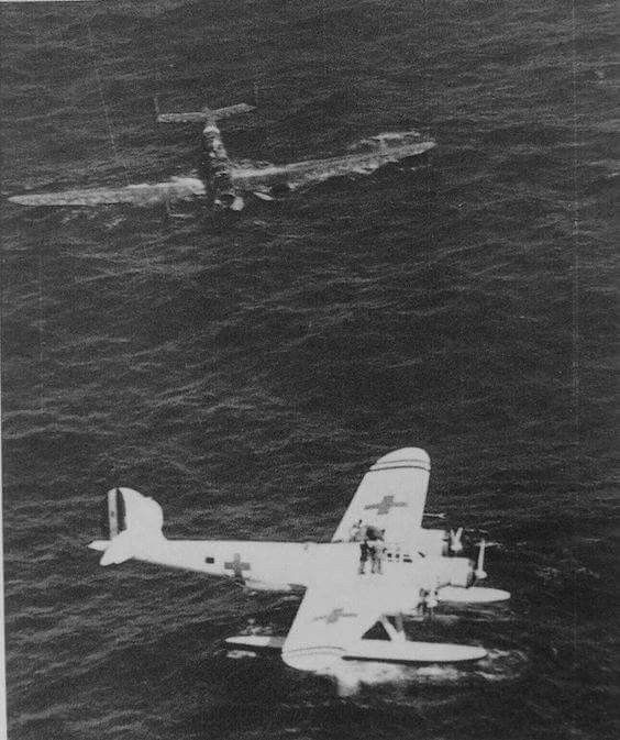 CANT (Cantieri Aeronautici e Navali Triestini) Z.506 Airone air sea rescue seaplane picks up survivors from an Italian CANT Z.1007 shot down over the Mediterranean that had been on a bombing mission over Egypt - 1943
