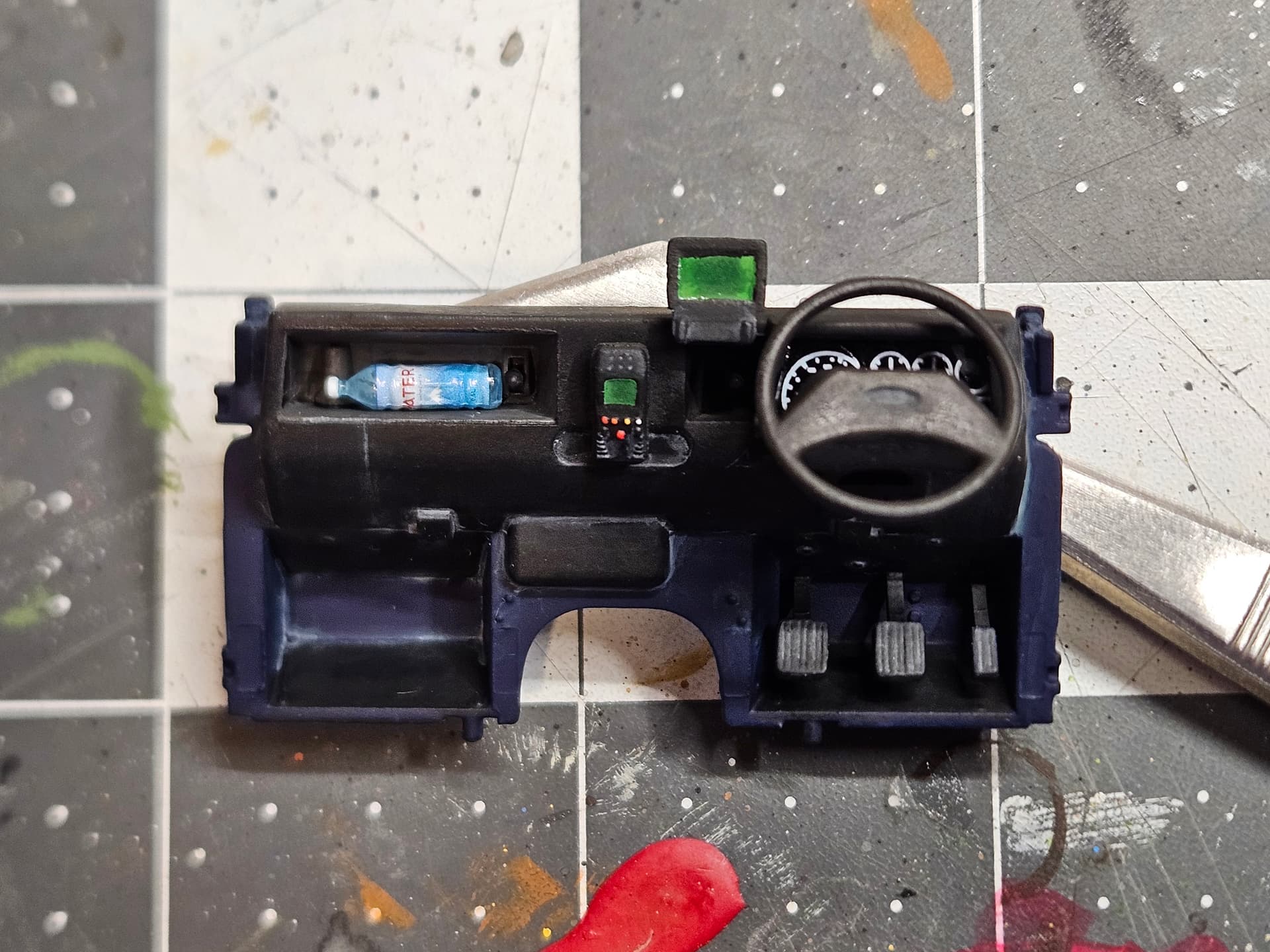 Since the colors are so dark, I wanted to lighten up the “mood” with some colors here and there, hence the yellow/orange/red buttons on the radio, the green screens, and the water bottle from AK Interactive set #18. I also used grey panel liner, and while I’m okay with the result, I realized that cleaning up with enamel thinner also removes the acrylic paint. Should I use a matte varnish before using an enamel product on top of acrylic?