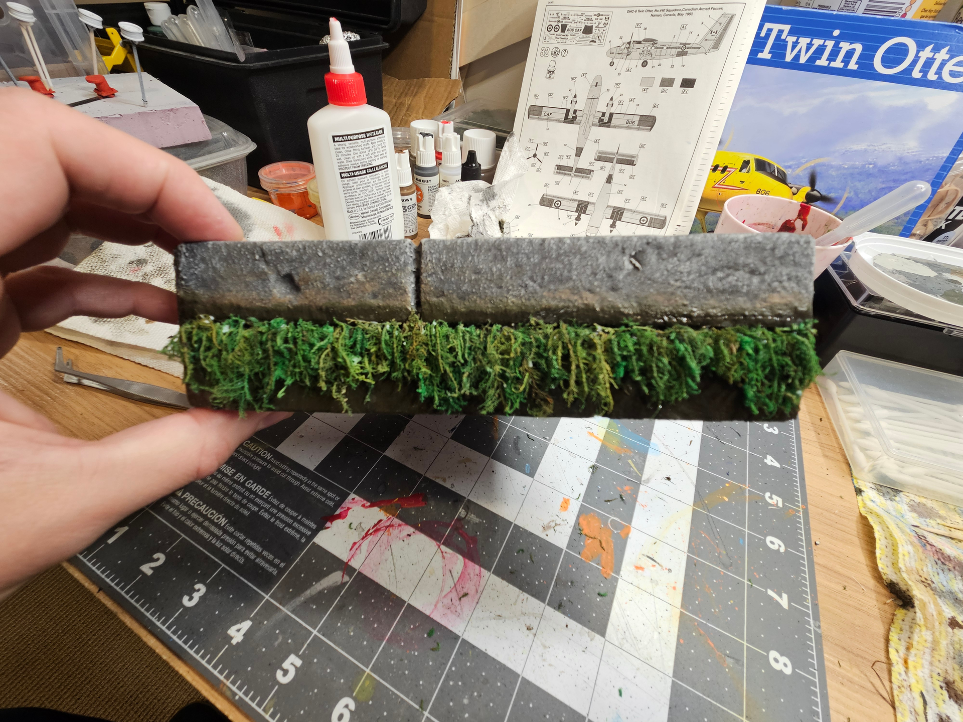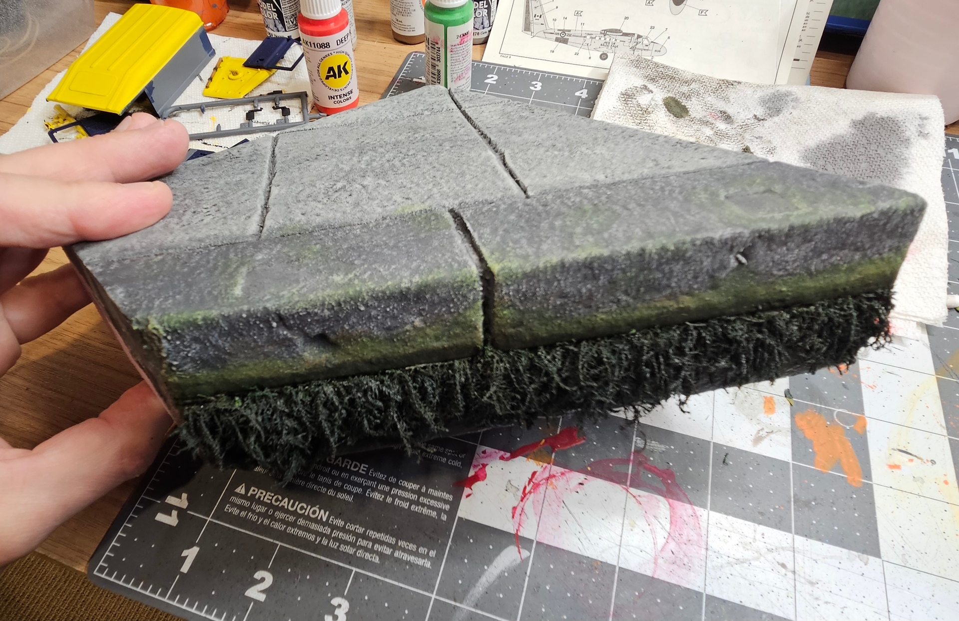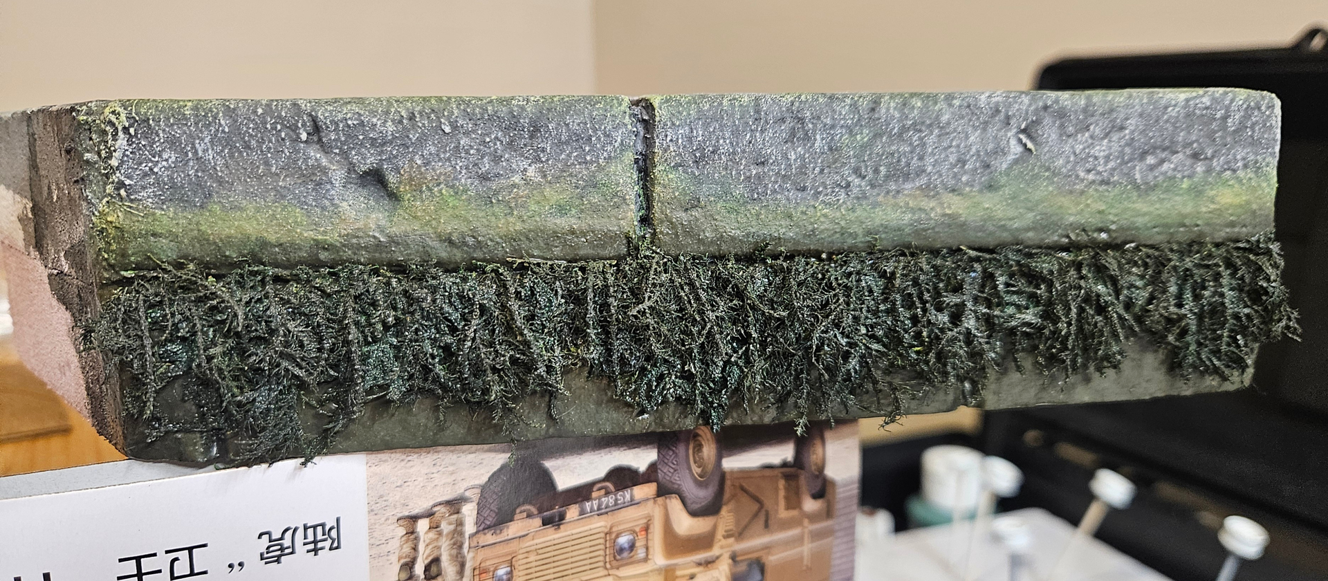 - Sponge-paint on top with Vallejo Environment Moss and Lichen effect, leaving the upper limit in mud brown