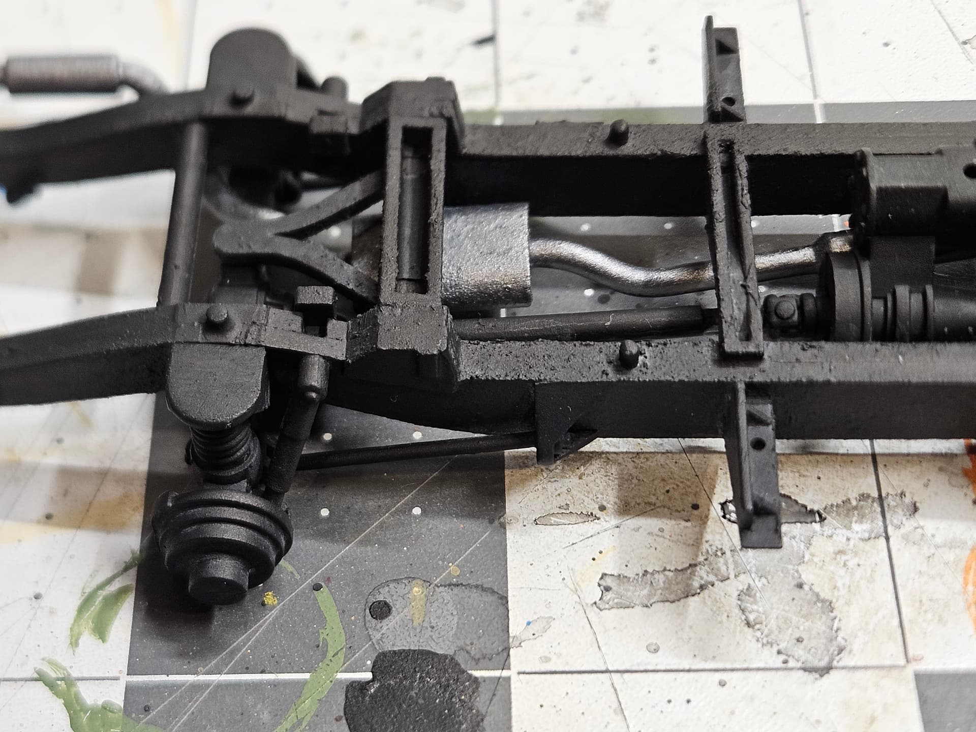 I used flat black primer&paint from Rustoleum on the chassis, and I really like the rendering of the texture applied with putty in the previous step!