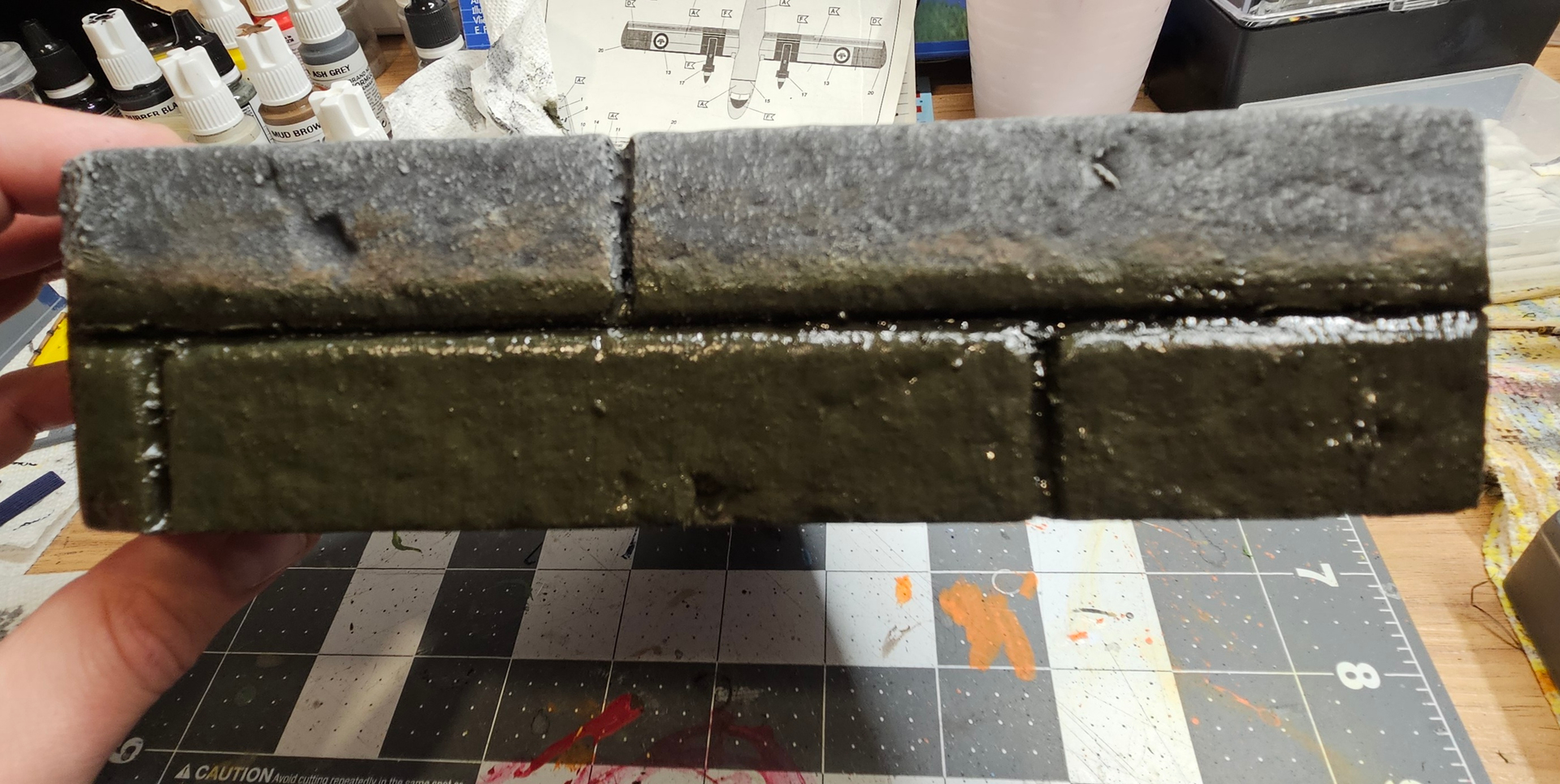 - Brush paint (2 layers) of a highly diluted mix of Valllejo Moss&Lichen, black, mud brown, and gloss varnish