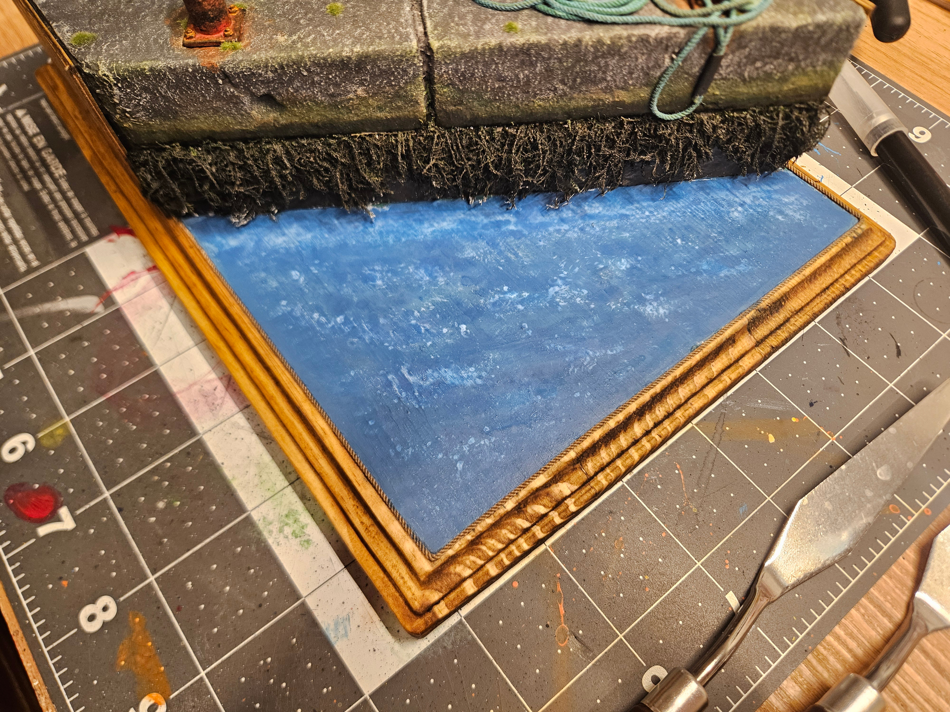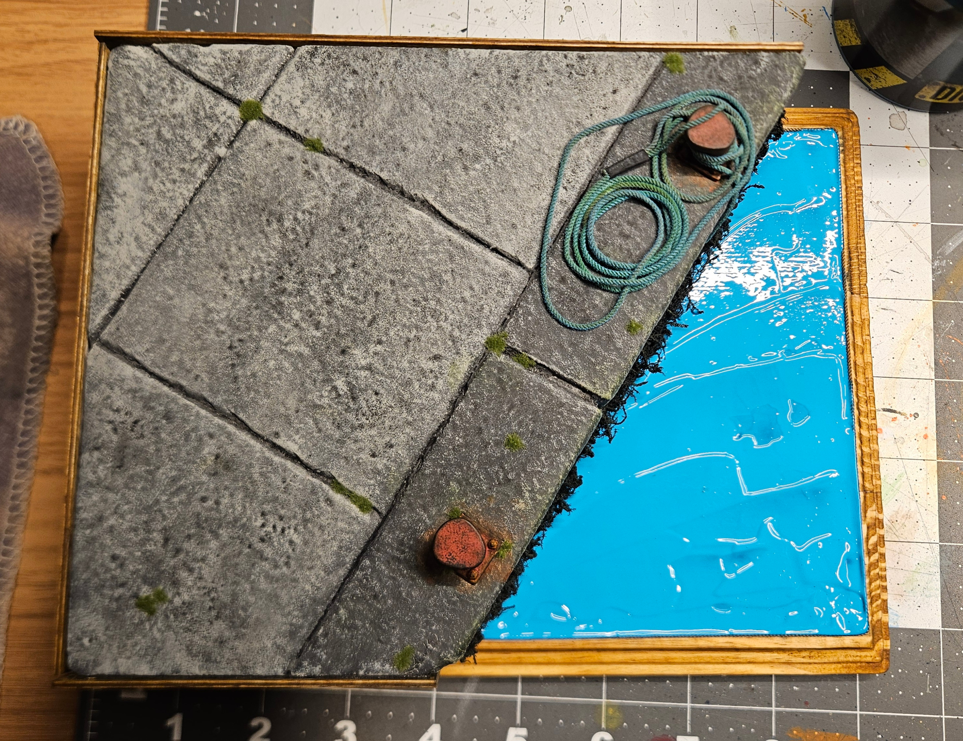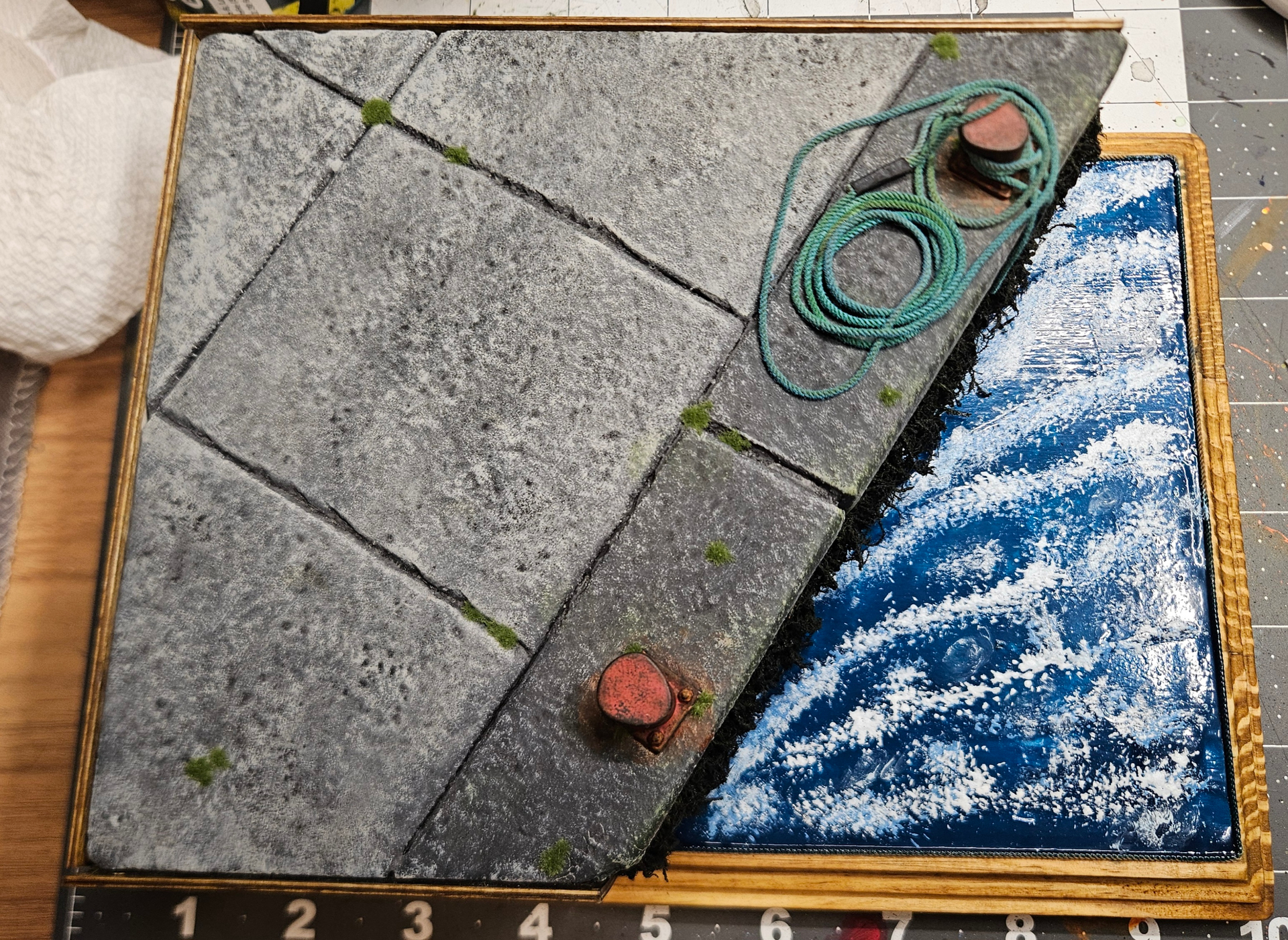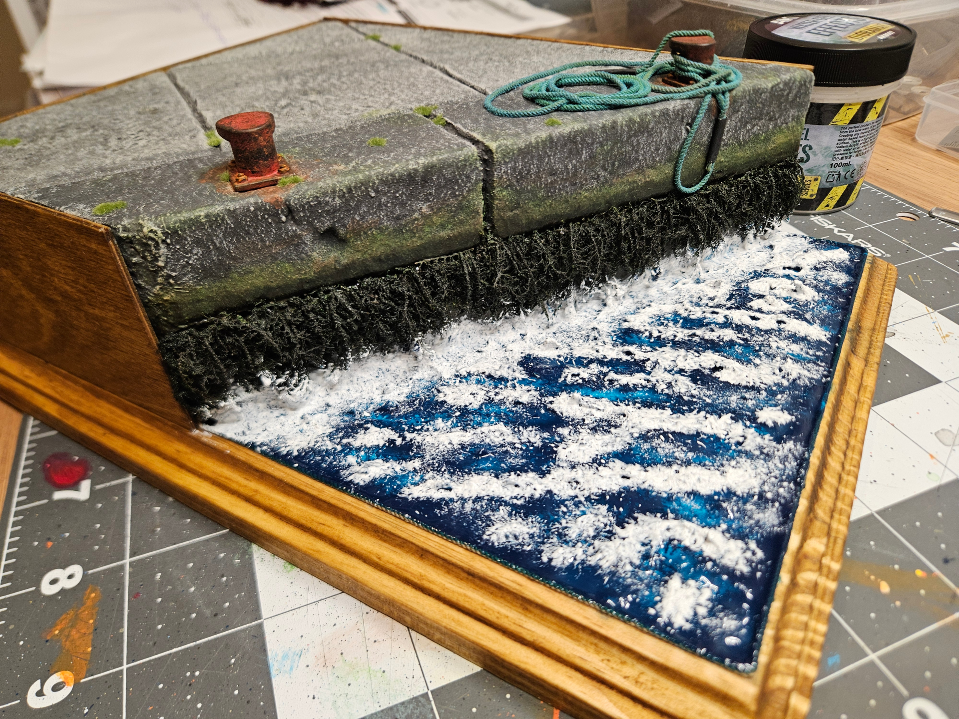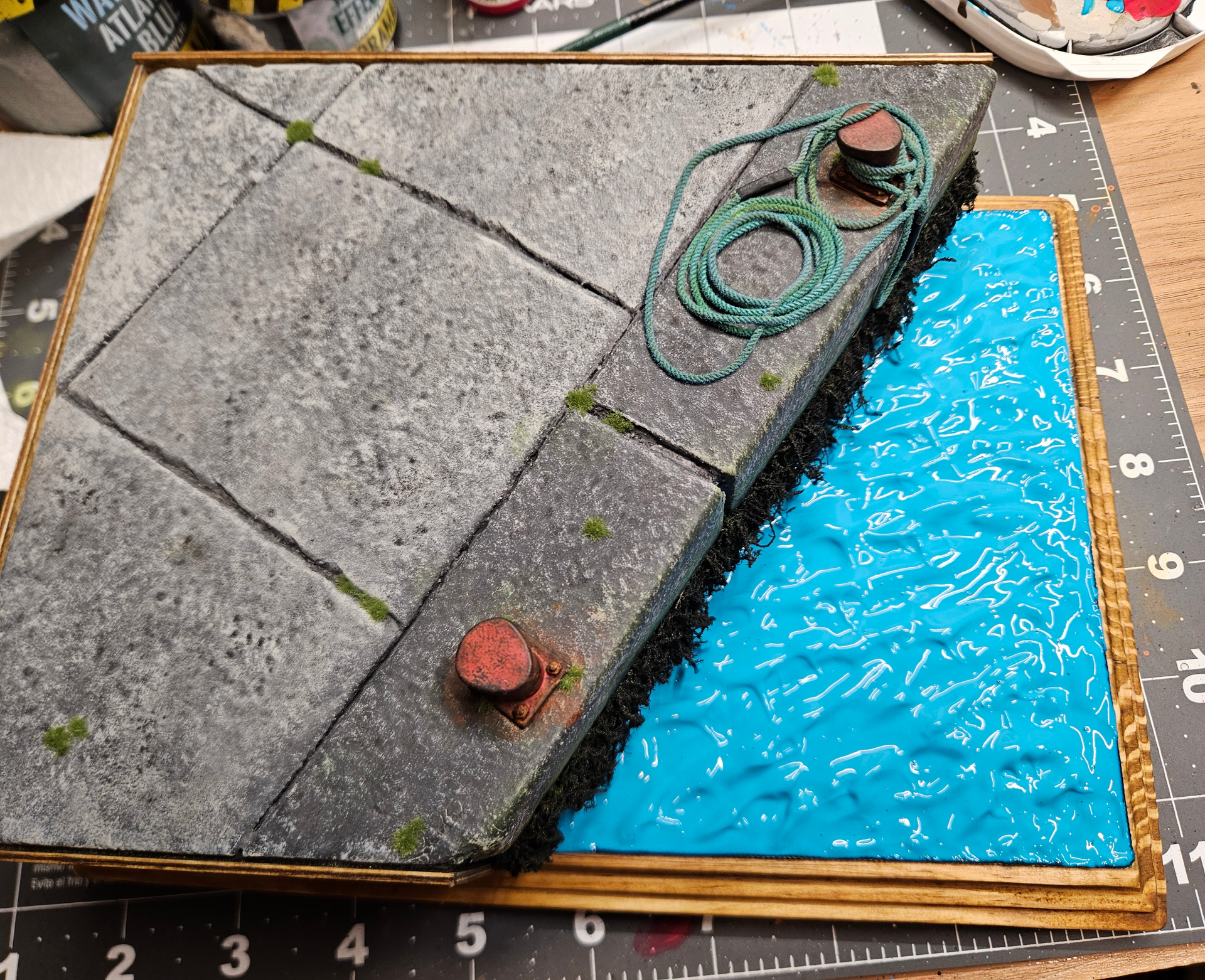 You have a great eye for the little effects and details that make bits like this authentic. The chipped and worn smooth metal effect on the bollard really works beautifully- as do the small weeds and mossy tufts. The green coloured deposits on the rope and that lovely fading is exactly what you would see down on a quayside like this.