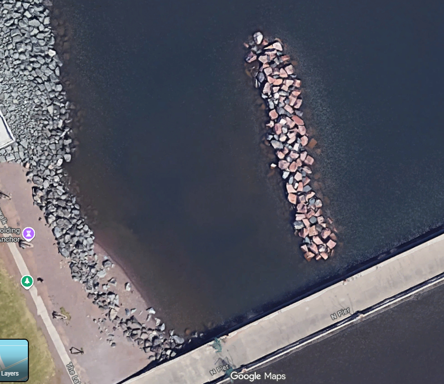 (sand tan, rock gray, seaweed/slime greenish, brown from stuff in the water).