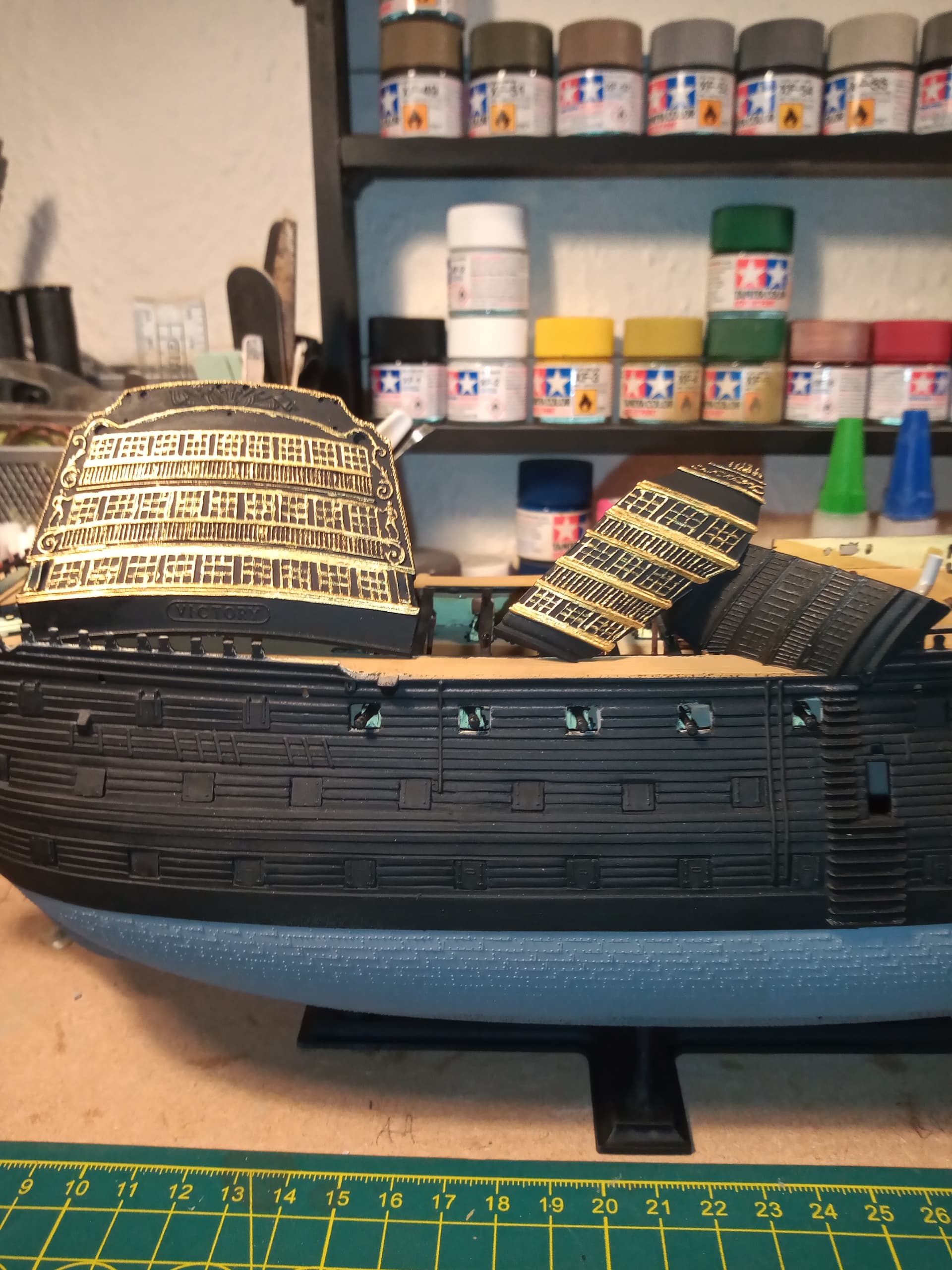 So, an update, and more to follow… Did some more gold work on the rear sections, and the figurehead… Also started the small detail painting at the very top of the rear section…