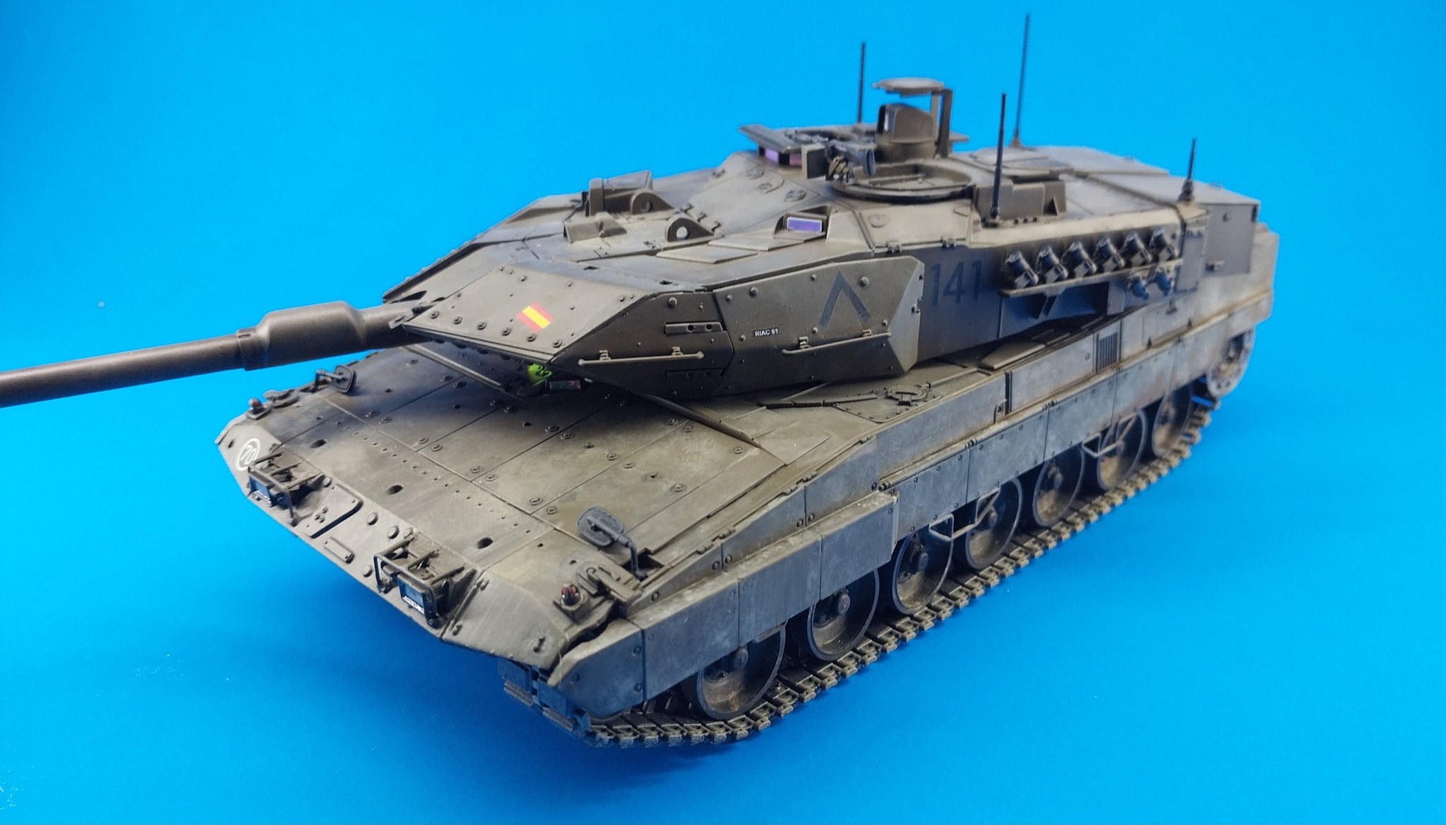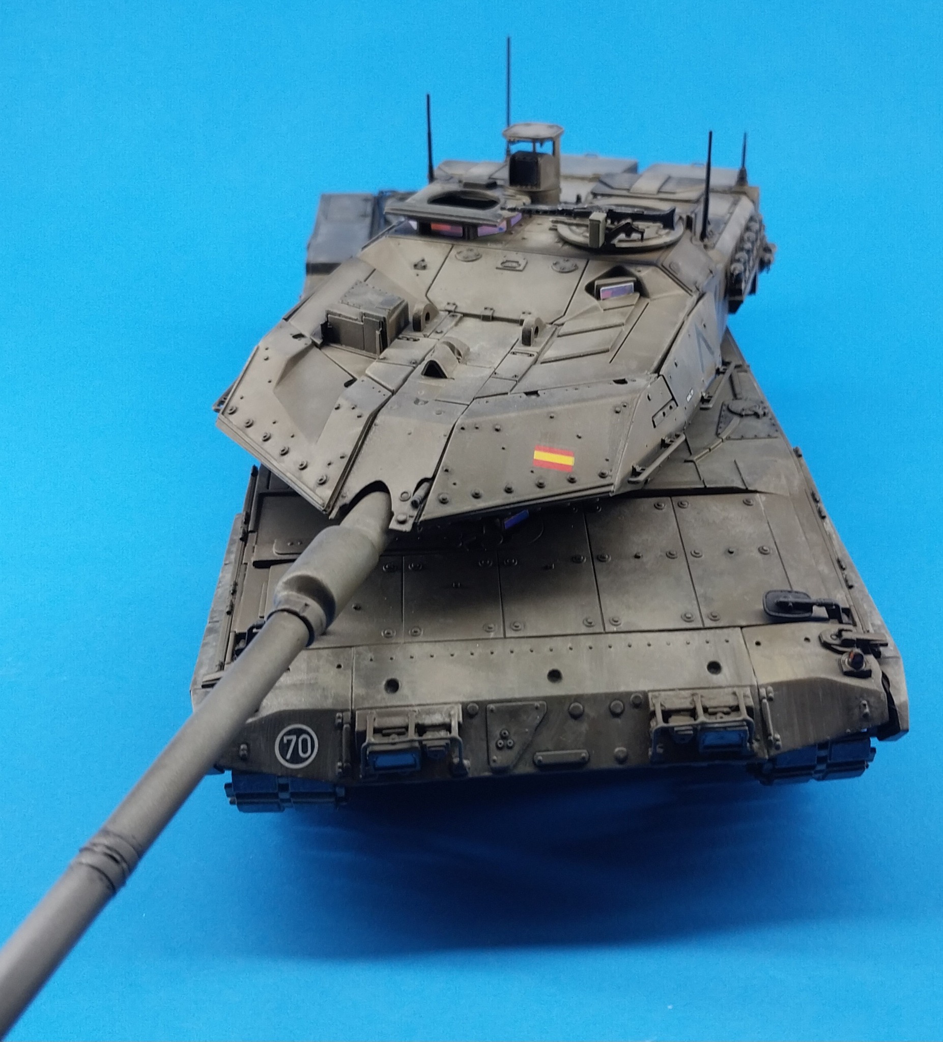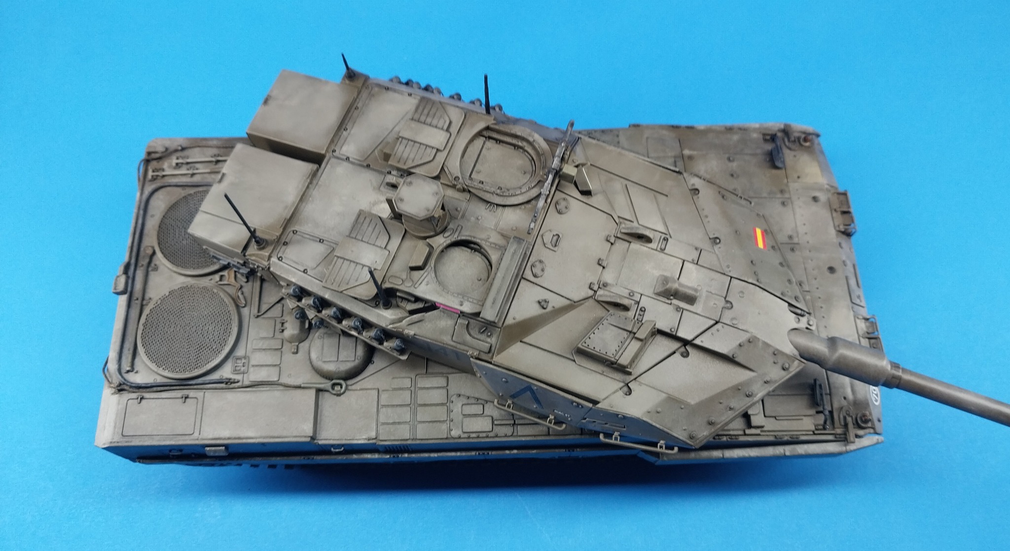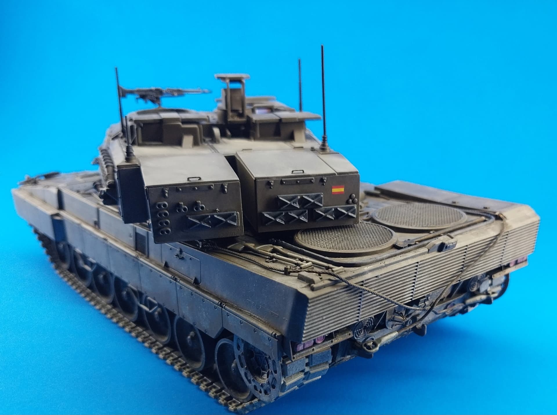 Exercise in weathering… I built the Hobbyboss Leopard 2E pretty much it of the box. It was a bear of a kit at times. Lots of gaps and needing many scratch built parts to make it look as best it can. The decals disintegrated so I had to rob my spares box for some Spanish numbers and flags. The chevrons were also used as is present on some current versions. I also added eureka tow cables, Tamiya mirrors, Meng sprocket track retainer (THANK YOU LEE), chains on smoke candles and (home made - Cricut) holographic lenses. Heavily weathered with AK enamel dust and oils…