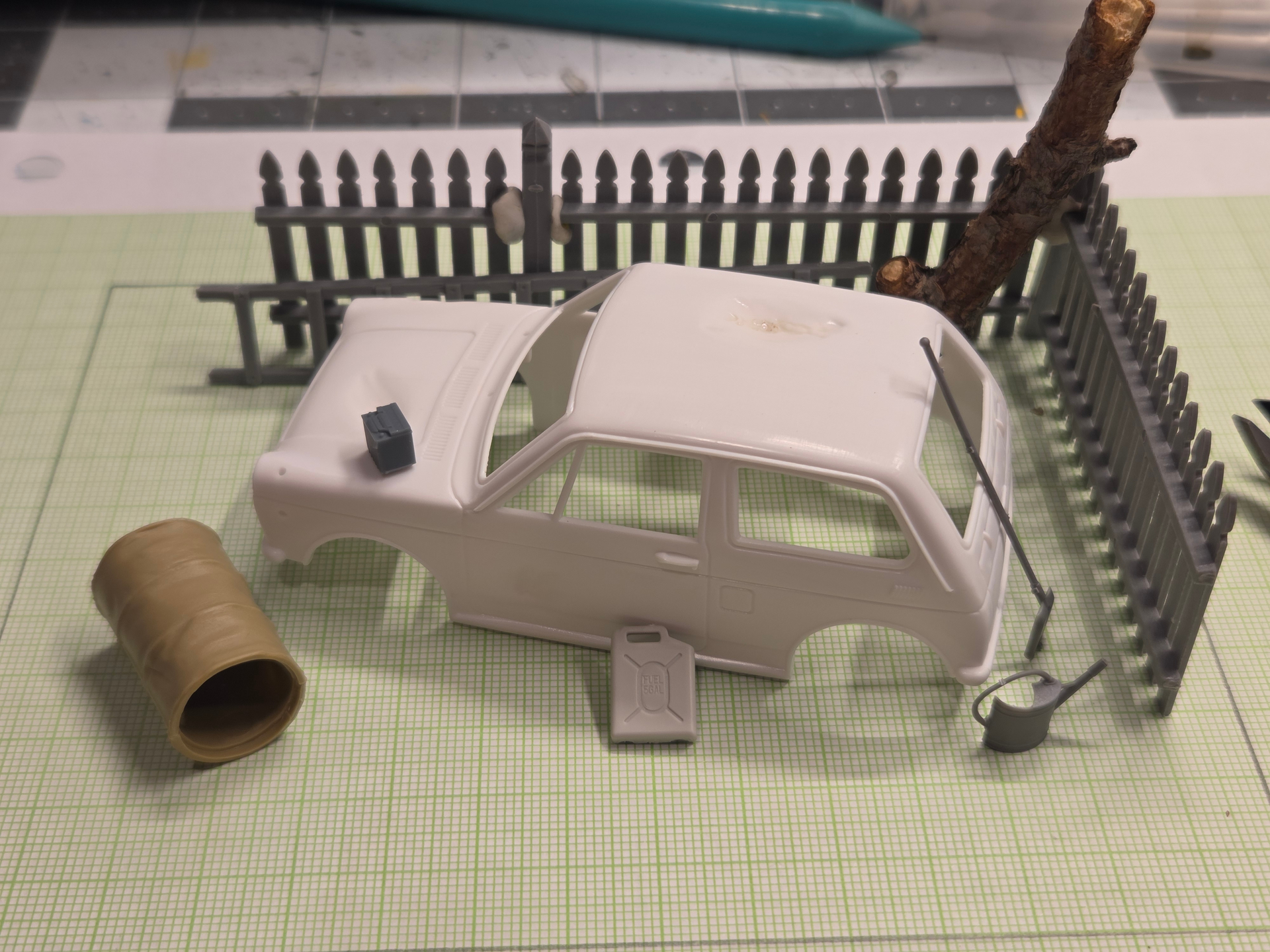 Starting this new project: an abandoned N360 slowly rusting in a yard, inspired by the picture at the bottom (of a Fiat 600 i think). The vignette will be quite small.