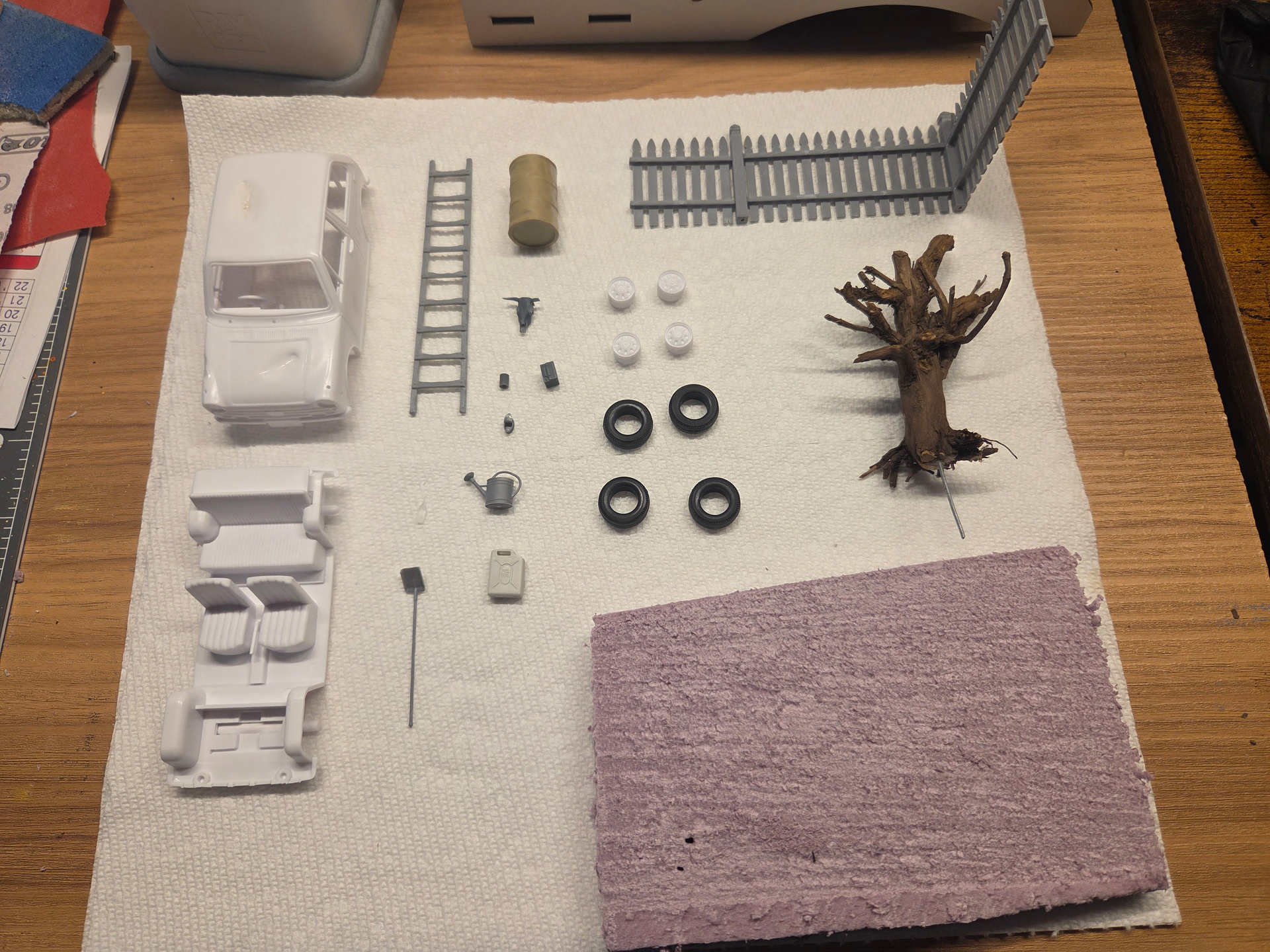 Alright, everything is ready to move forward with priming this humble amount of parts and accessories, as well as working on the base.