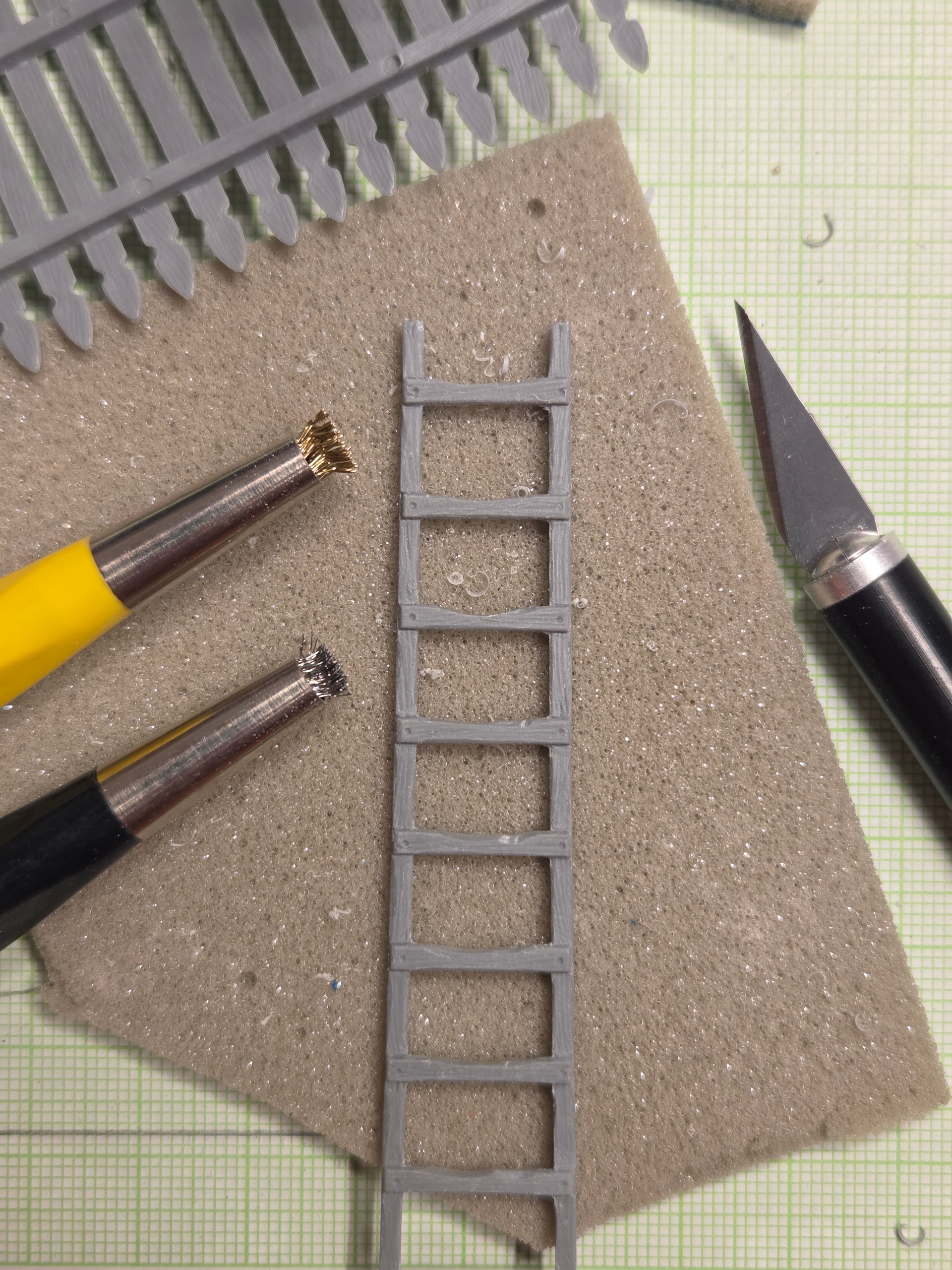 The ladder is from MiniArt. Great product, but too clean. I used my x-acto knife and those metallic brushes to soften every angle and mimic the slow wear of the steps.