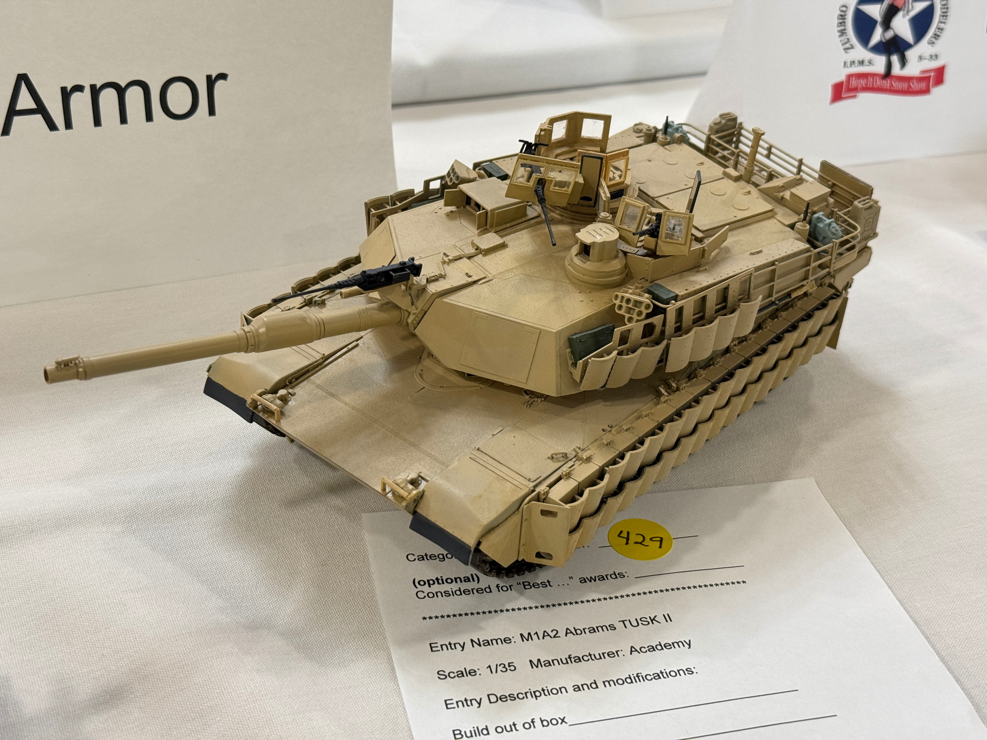 Finally, an M1A2 Abrams fitted out with the TUSK II kit. This baby looks just great, and again, I was a bit surprised to find out this was the Academy kit. Perhaps there is a bit of prejudice towards Academy on my part — certainly unwarranted in this case, and with regard to the M3 Grant seen previously. I was really caught up by the overall look of this piece — great job!