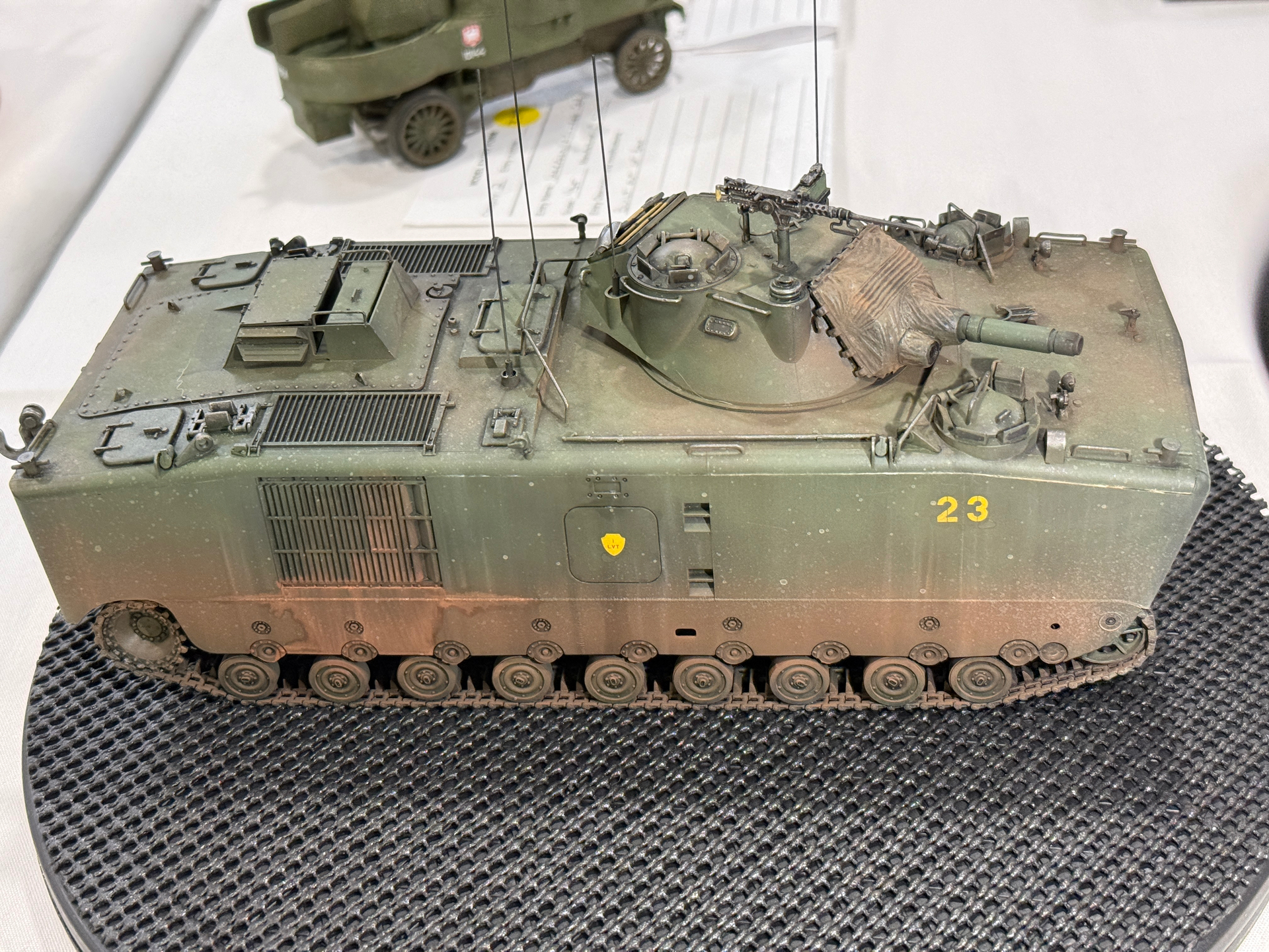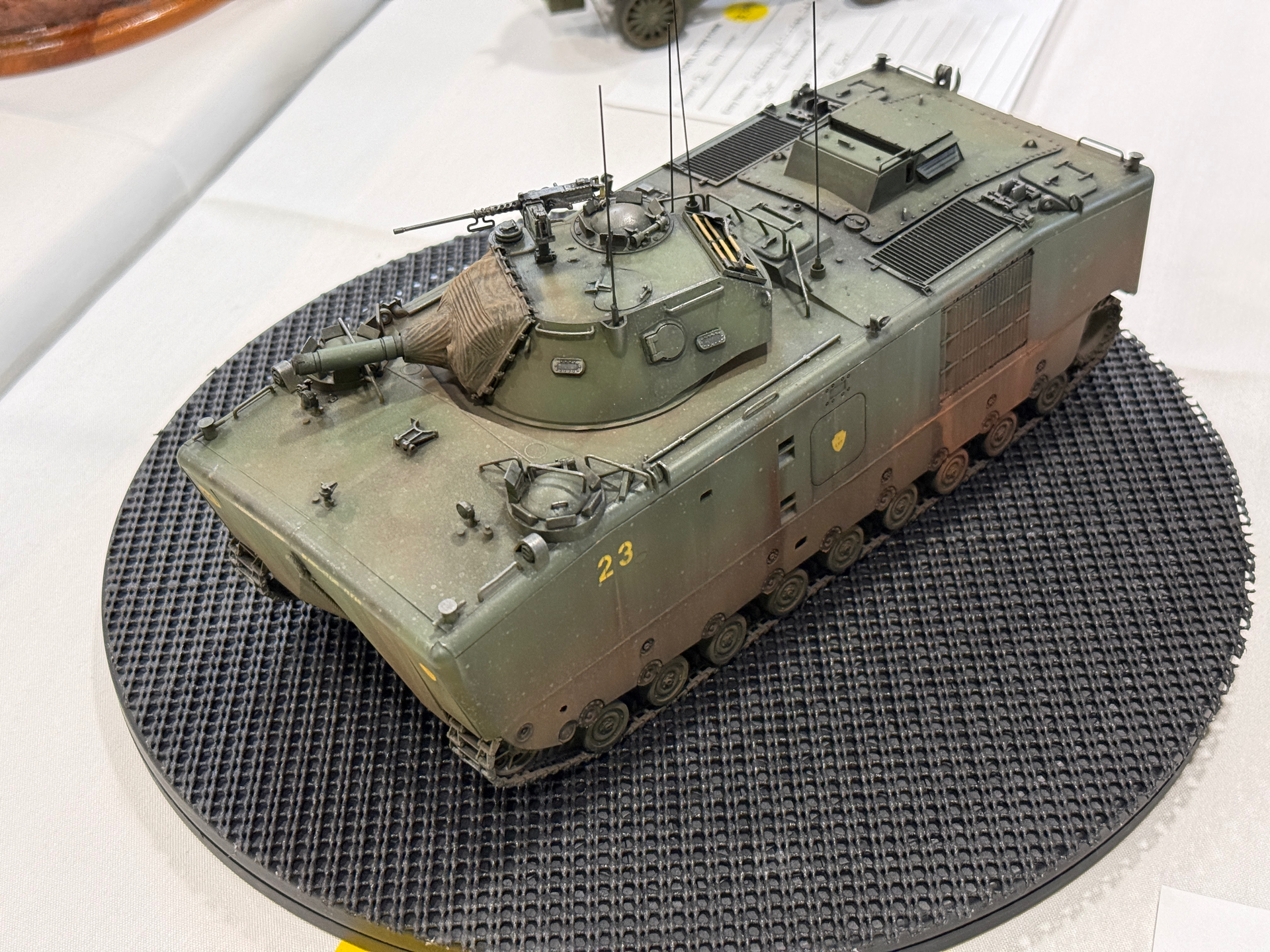I really liked this LVTH6. This model, and several others presented by this builder, used a clever device of placing the finished item on a rotating “Lazy-Susan”-type platform, allowing anyone viewing the model to rotate it around and see it from all sides without the need to move to other positions at the table. I thought it was a great way to give viewers complete access to all aspects of the kit. I ended up taking a number of photos of this AFV (in different lighting conditions) because of an anomaly that I have noticed before: my iPhone was [rather drastically] changing the color of the subject — presumably to lighten the vehicle for better viewing. In this particular case, the LVTH6 image where it shows up rather dark is much closer to the model in its natural state. The picture with Dan’s hand is included to give a sense of scale — the LVTH6 is a very large vehicle, and I felt that wasn’t coming across without some way to gauge the size of the finished model.