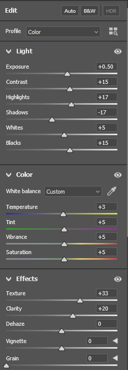 A really useful feature is that you can save the adjustments as a file and upload them to your next editing job and they’ll automatically apply. Very much a time-saver. You can see a tremendous difference between this photo and the last one. Again, I don’t know what a lot of this stuff is - just play around with the sliders to get it to look right to your eye.