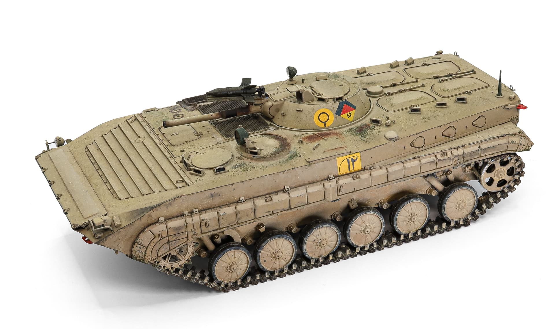 For this demonstration, I used a 1/35 Trumpeter BMP-1 I built a few years ago. The markings were painted, and are of the 42nd Armored Brigade, Iraqi Republican Guard Armored Division “Al Nida,” as the vehicle would have appeared in 2003. Otherwise, the kit was built out of the box, ill-fitting track links and all.