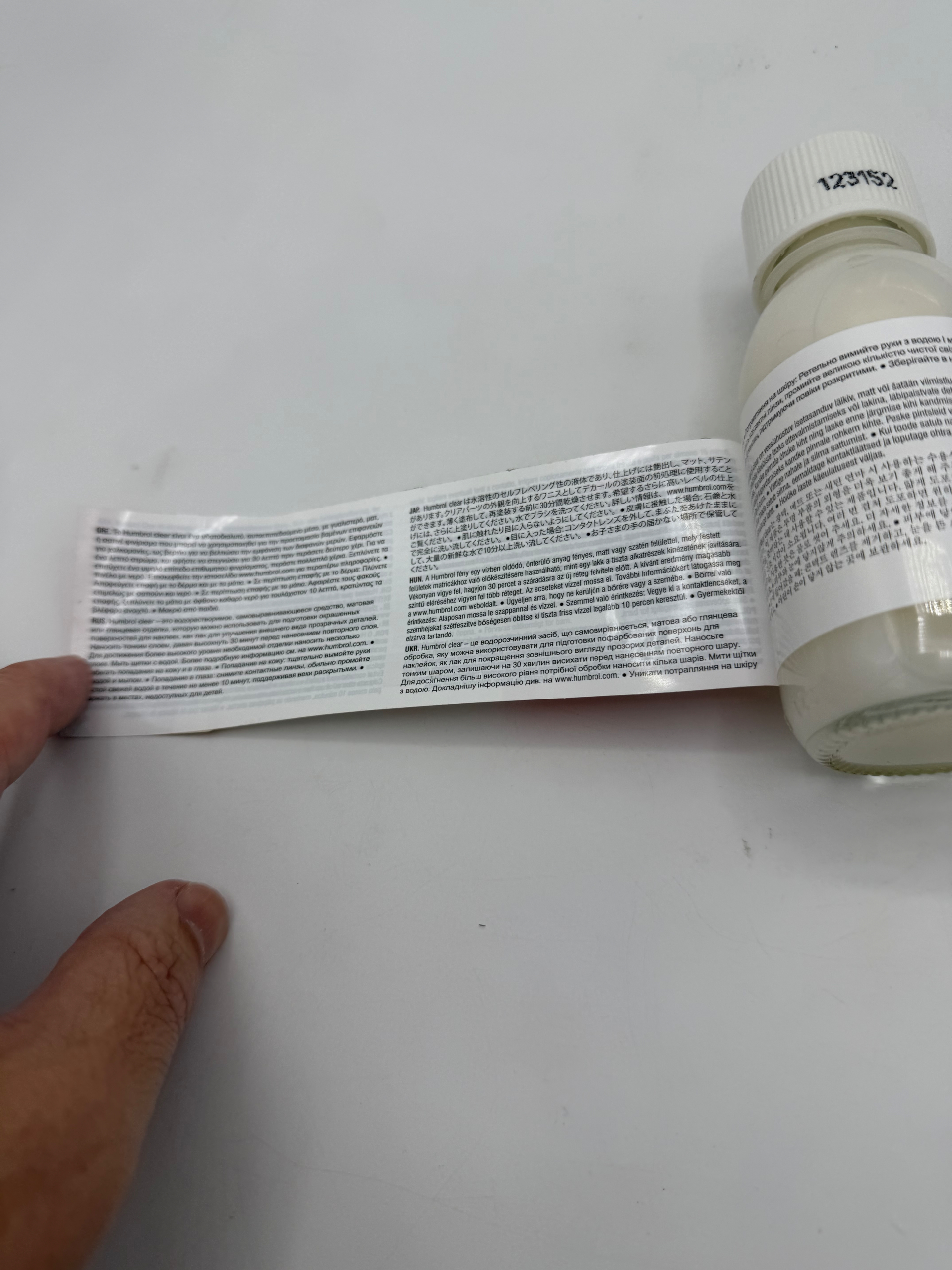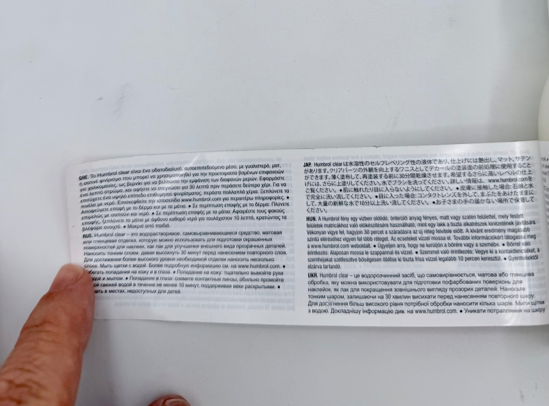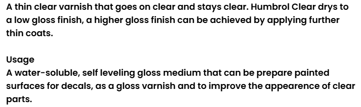 Humbrol Paint is a water-soluble, spreadable material with a gloss, matt or satin finish, which can be used to prepare painted surfaces for decals, as a varnish to improve the appearance of clean parts. Apply thinly, allowing 30 minutes for drying before applying a new coat. Apply multiple coats for a higher level of finish. Wash brushes with water. For further information visit www.humbol.com. Take care to avoid contact with skin or eyes. Skin contact: Wash thoroughly with soap and water. Eye contact: Remove contact lenses, rinse eyelids with plenty of clean fresh water for at least 10 minutes. Keep out of reach of children.