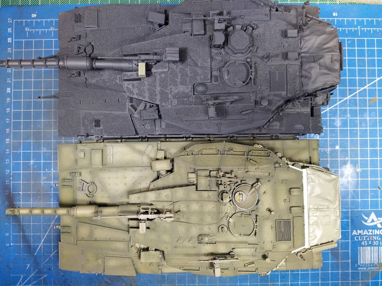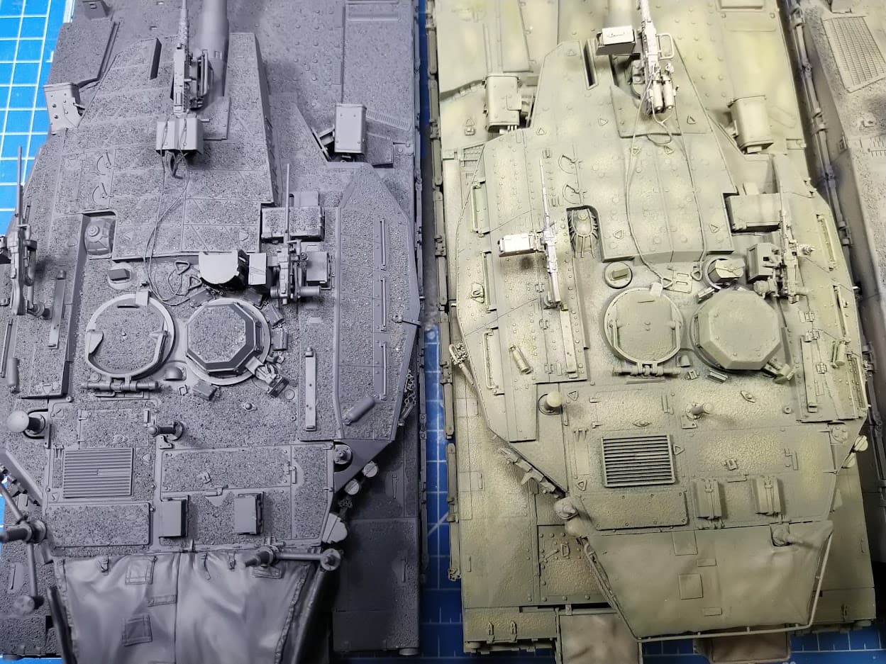there is an obvious error of the roof proportions e.g. the front half of the turret roof (from the front end up until the rear of the added roof armor) is 3 mm longer than it should be and the rear half of the roof, from the hatches to the bustle rack is about 4mm too short.