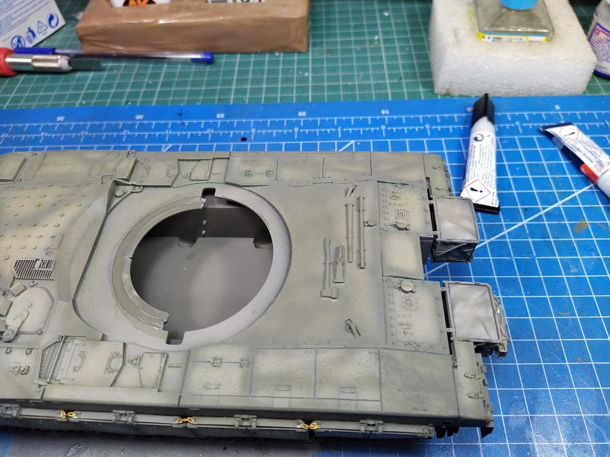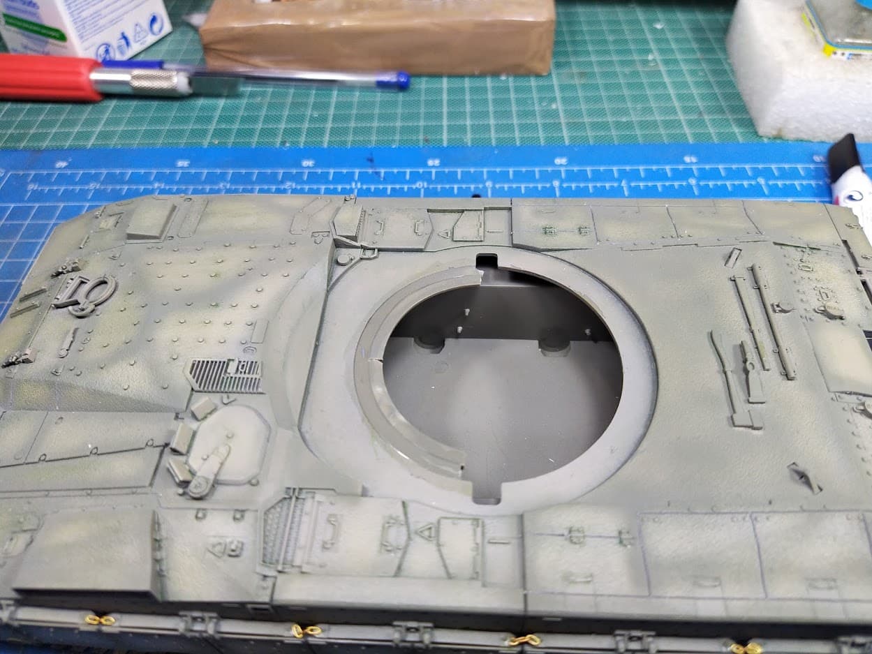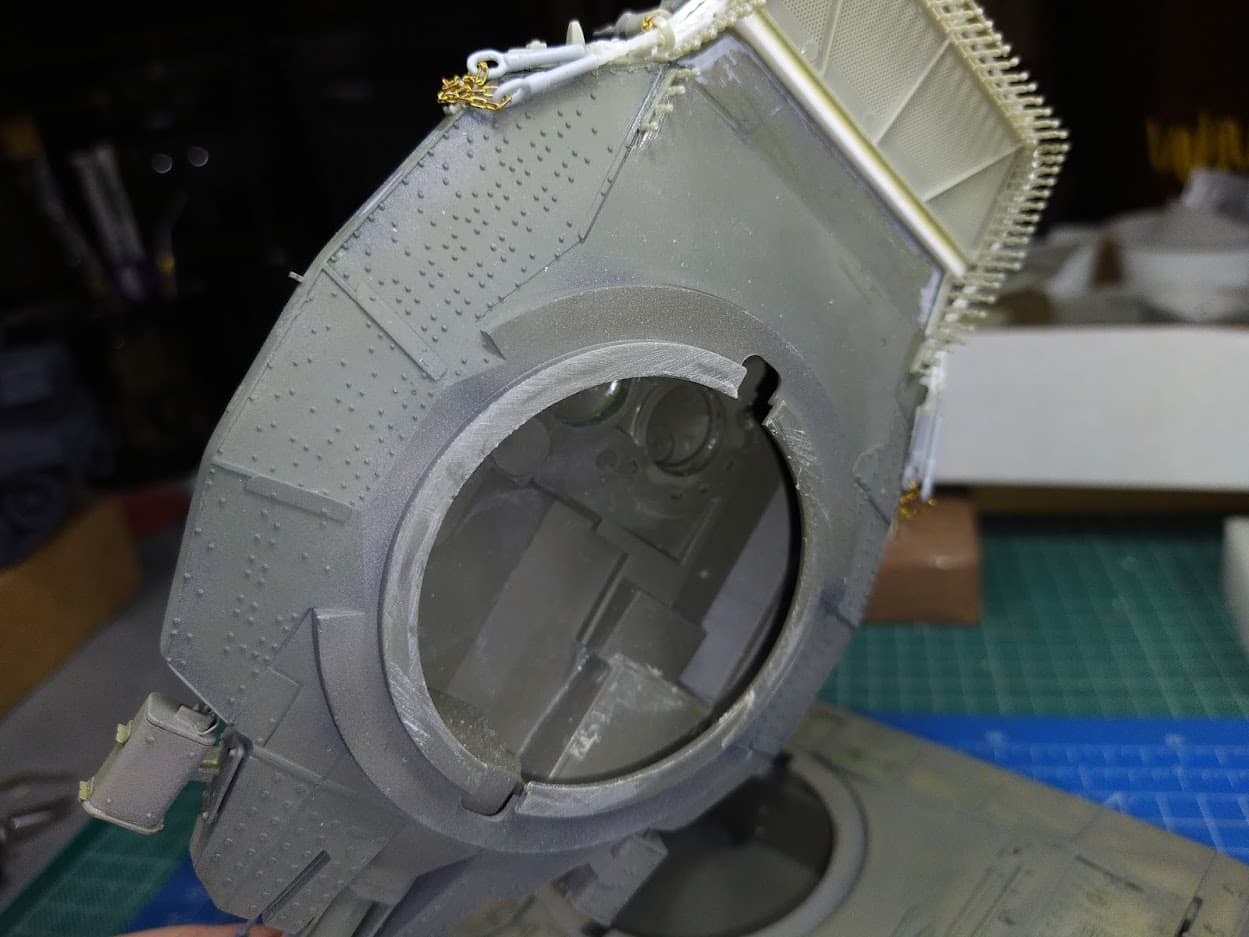 After further measurements and comparisons, and although I had already lengthened the rear of the turret and added a proper bustle rack from Meng, I decided to correct the position of the turret. The main issue is that the hole on the hull deck where the turret is supposed to seat is too far at the front (about 5mm) and combined with the shot turret length it was looking way off.