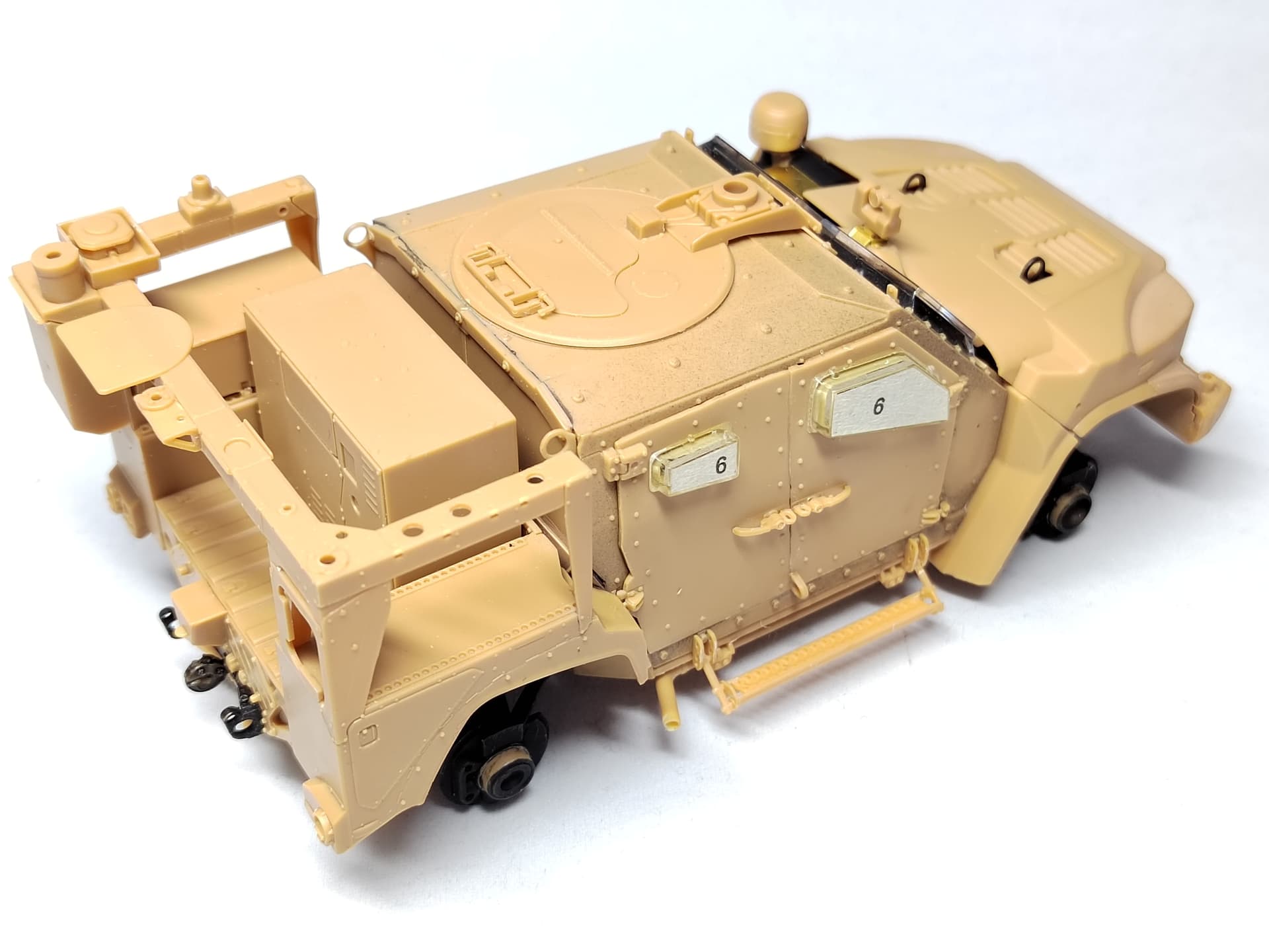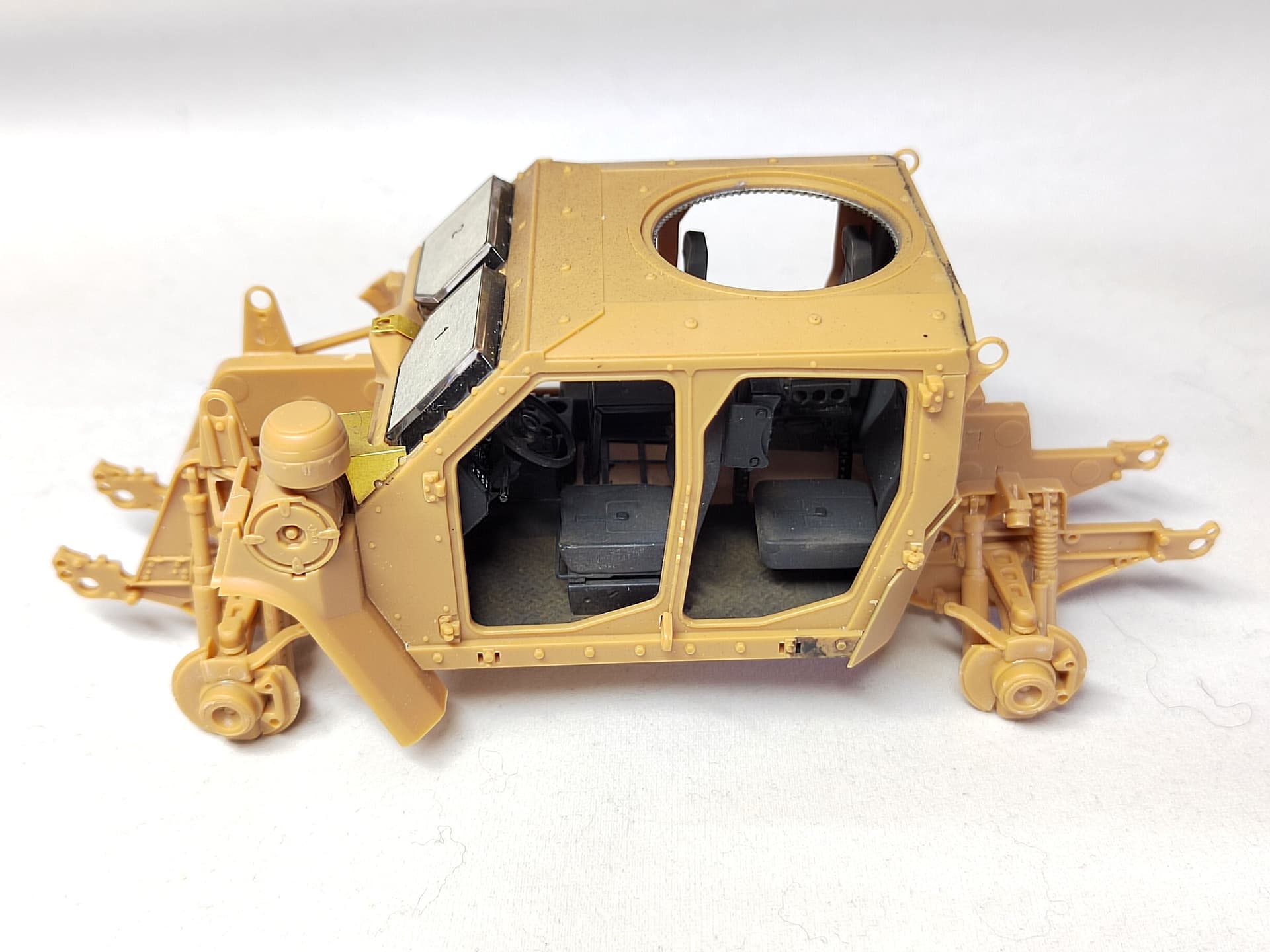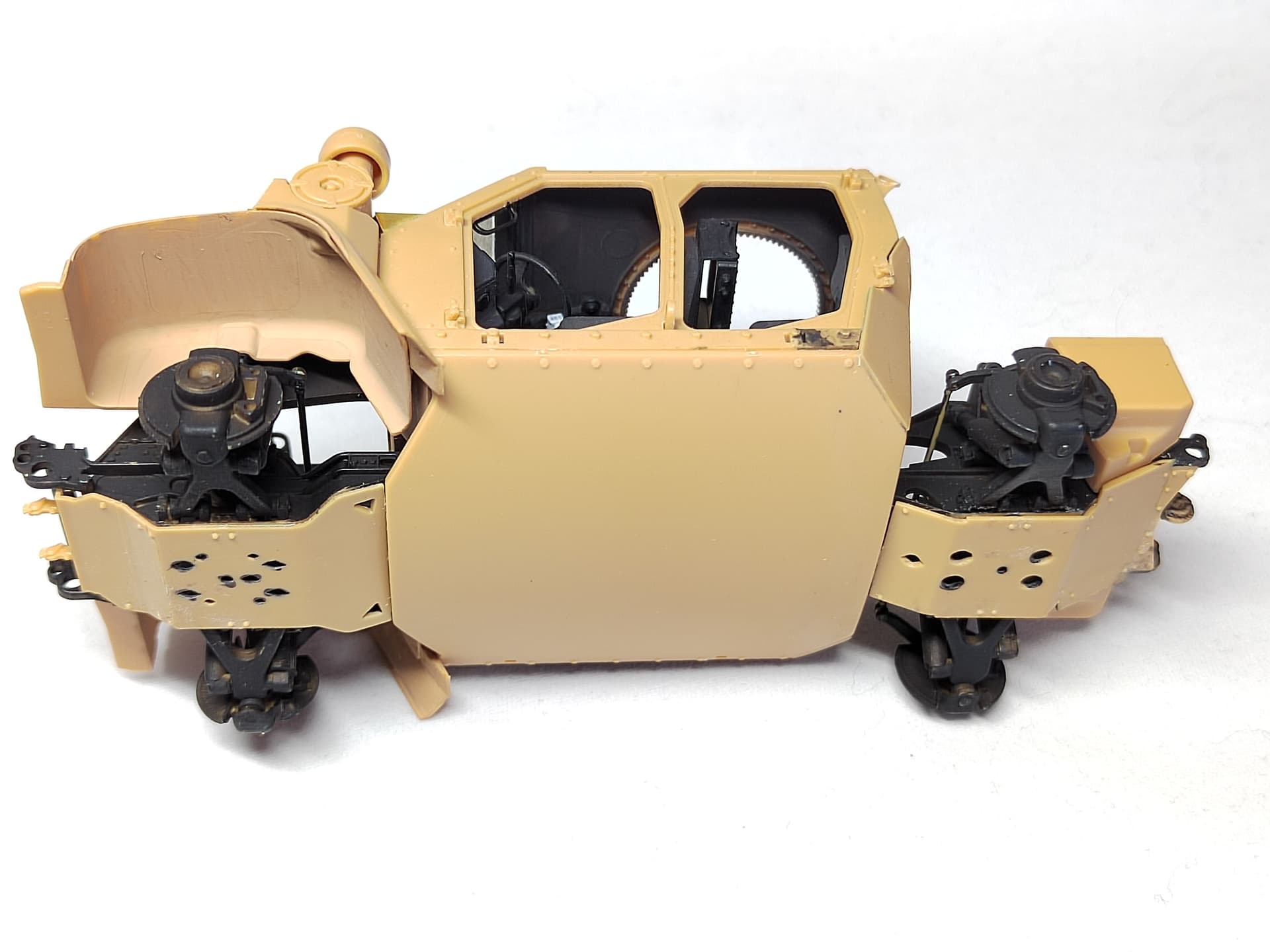 After the painting of the elements, the suspension is installed as well as the belly armor. No big issue. The belly armor was a bit tricky to fit. And the way the wheel arches are glued is not the best to guarantee their orientation is perfect. I checked with the hood to be sure of it.
