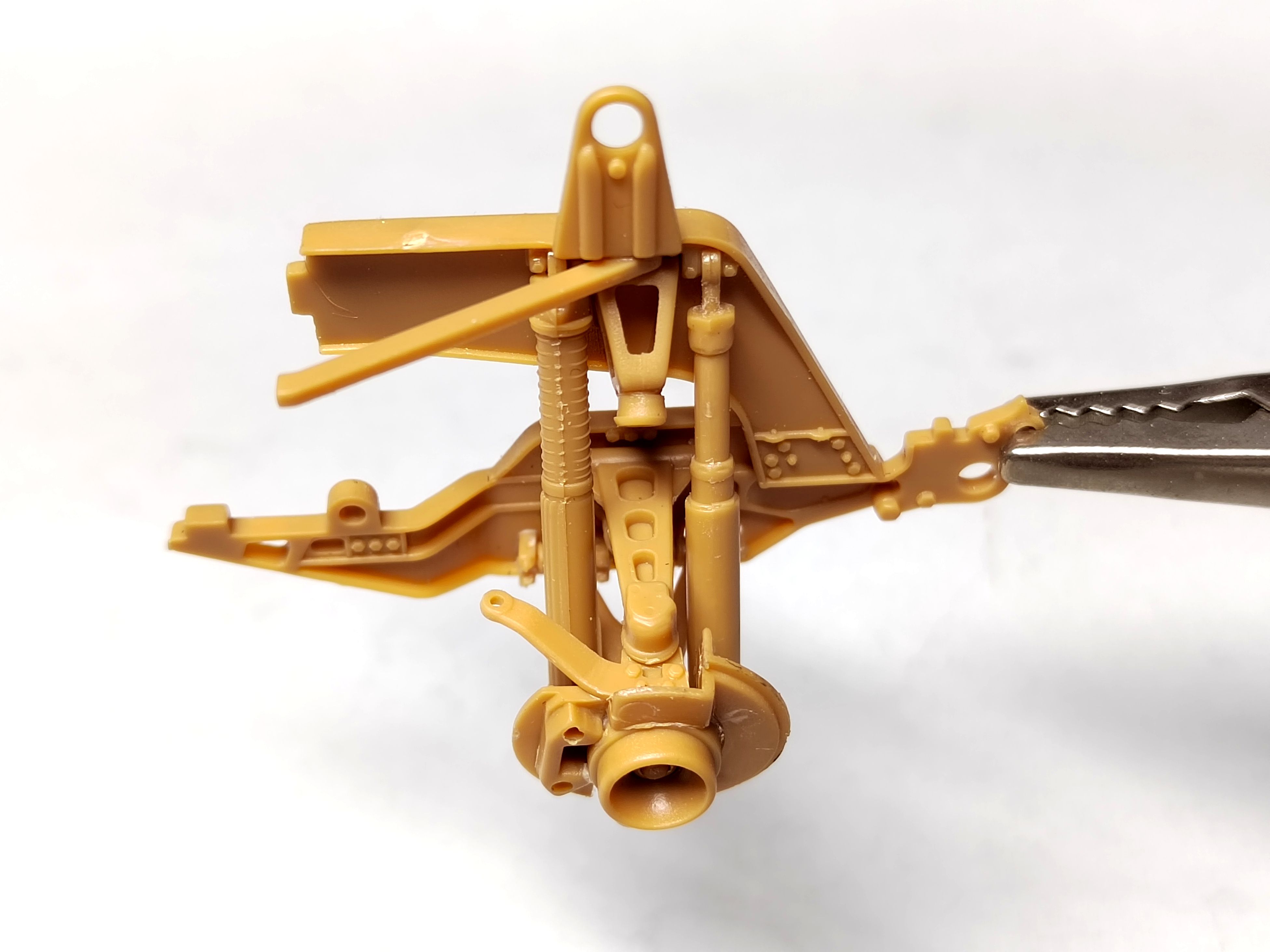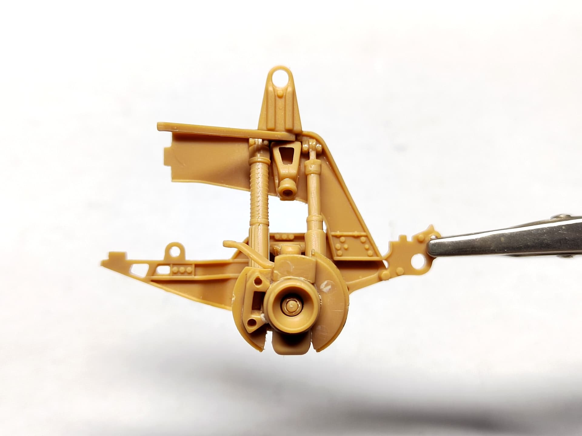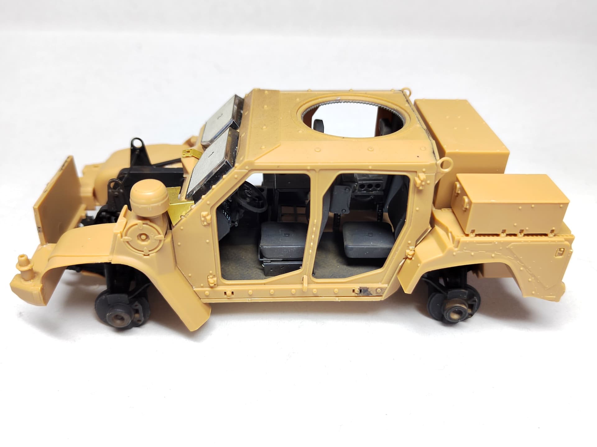 After the painting of the elements, the suspension is installed as well as the belly armor. No big issue. The belly armor was a bit tricky to fit. And the way the wheel arches are glued is not the best to guarantee their orientation is perfect. I checked with the hood to be sure of it.