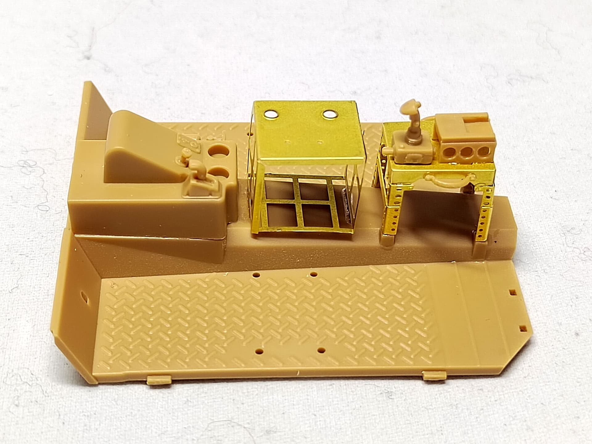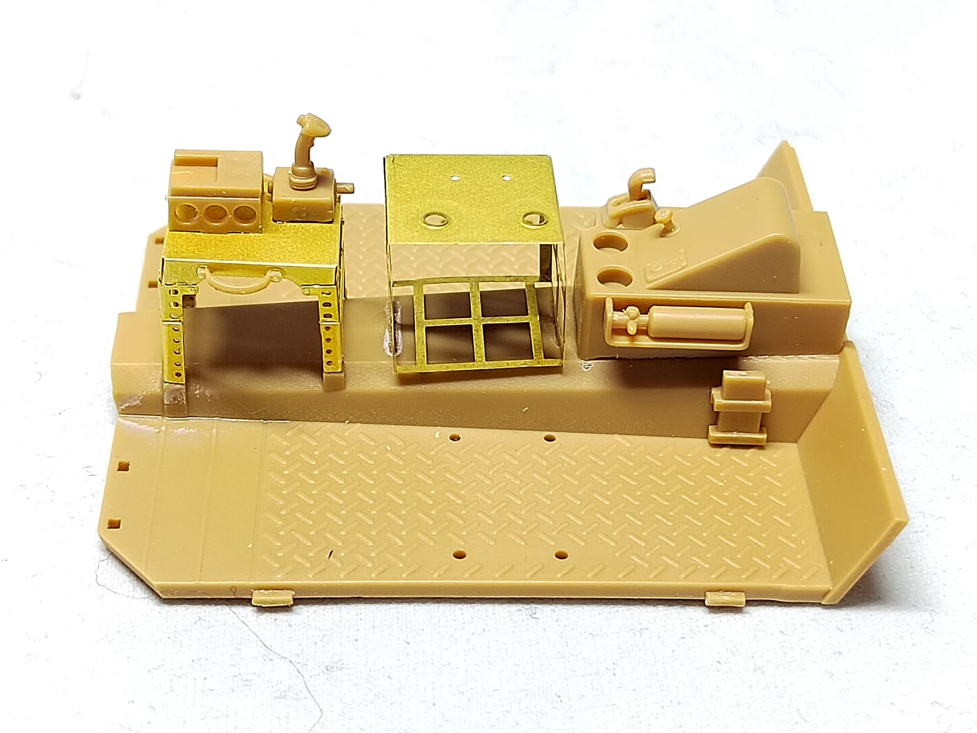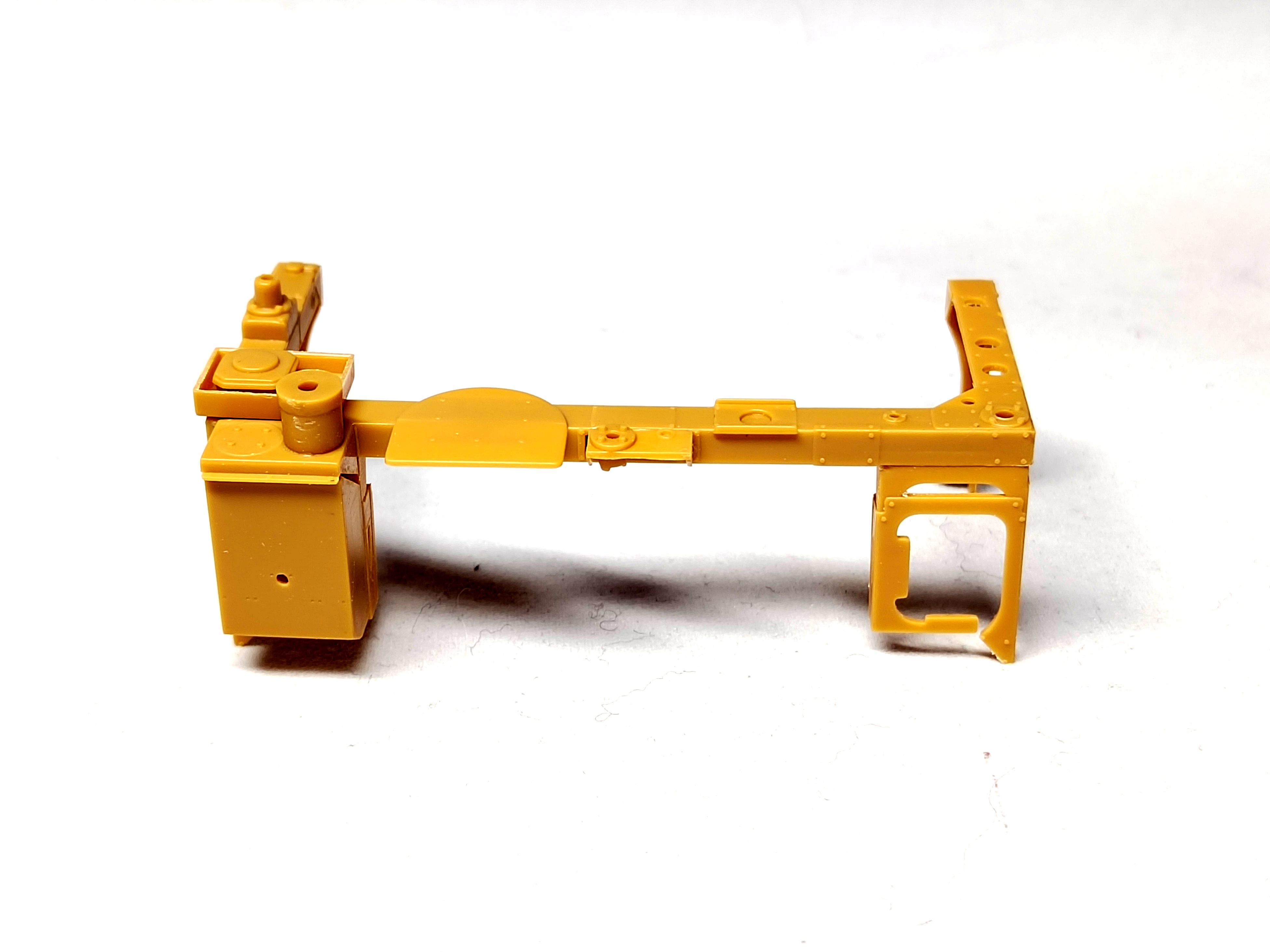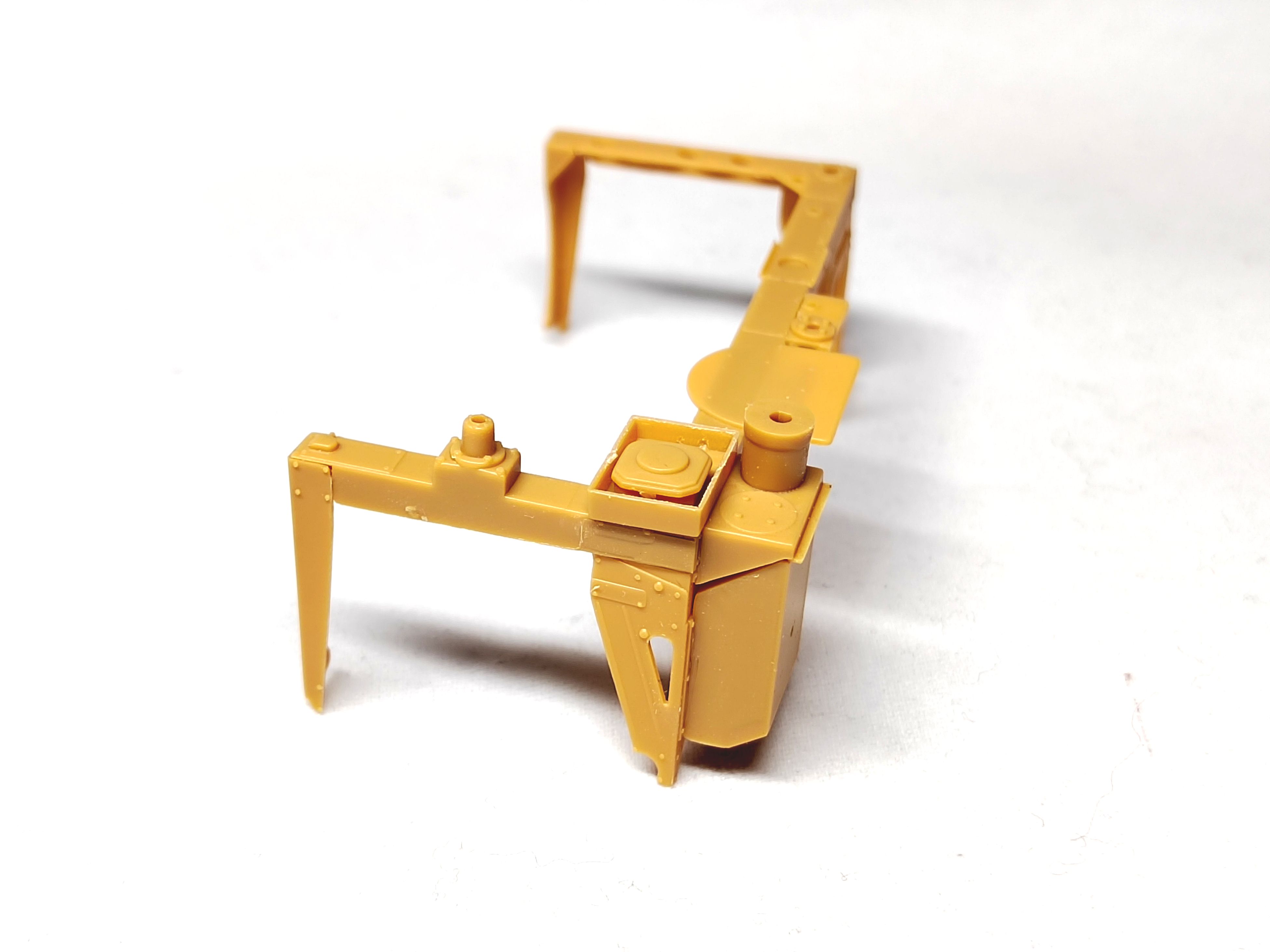 The rear frame has been glued as well as the hood. One foot-step is in place with the tiny chains which are a nightmare to attach. The foot-step assembly is “freely” glued. Nothing is designed to have all the parts set at the right angle. Moreover the PE chain is so thin that it is easily damaged when you try to glue it. The first side is not really nice. I’ll try to do better for the second one.