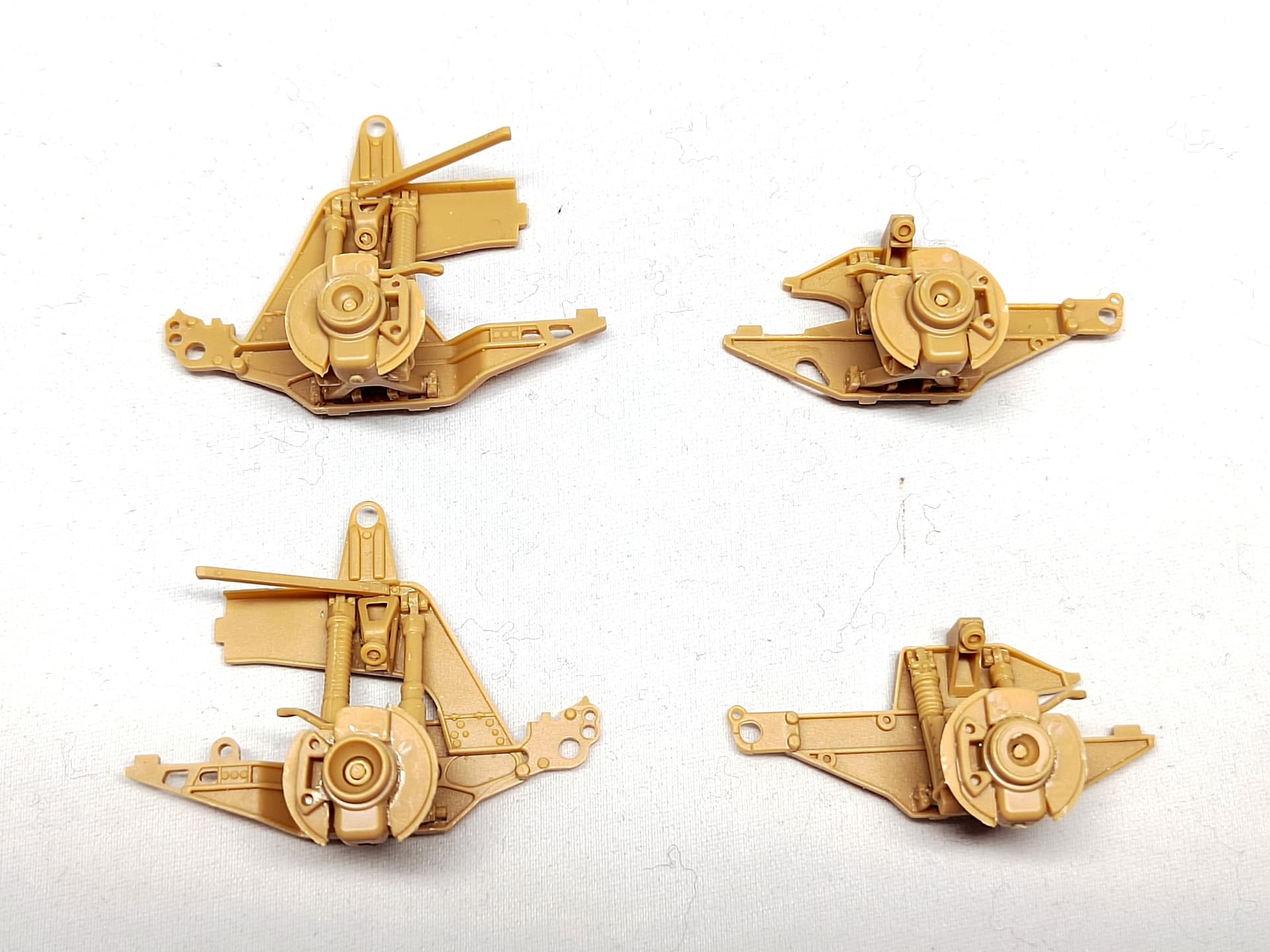 The four suspension elements are ready. To help assemble the suspension triangles it is better to thin the bases E43 (parts with the hole for the triangles axes). Do not glue the lower triangle first as requested by ILK. Wait till all the sub-assemblies are ready to be glued.