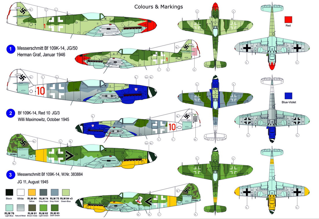 The page for the model at www.mbk-b2b.com has an additional image that suggests the color is a blue, not purple or violet. A thread on the britmodeller.com forums regarding this kit suggests RLM 24 Dunkelblau for the nose marking; the markings refsheet in this thread is a very dark blue that could have been interpreted as purple by the box artist to make the aircraft more visually interesting. There is some argument that all of the camo/marking patterns are spurious, as the claims that several K-14s were completed and delivered to JG52 in April 1945 can be considered dubious – the DB605L engine the K-14 was to be equipped with had production stopped in December 1944; MAJ Batz, the commander of II./JG52, who said that he got two K-14s delivered said later that he didn’t recall seeing any 4-bladed prop on a Bf109 – a signature feature of the K-14, and two lists of operational aircraft from 9 April for JG52 disagree with each other – one with “K-14” and one with “G-14”, and neither list is an original document, so their reliability is questionable. The final Kurfürst that was completed was the K-6, also suggesting the K-14 was a paper aircraft, and references to it are typographical errors of the G-14.